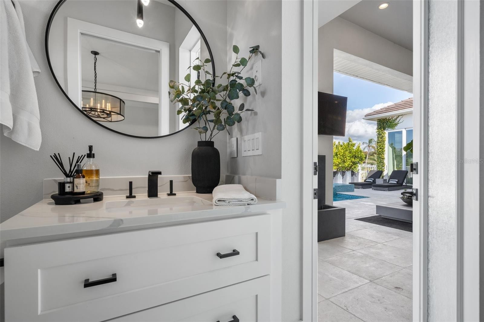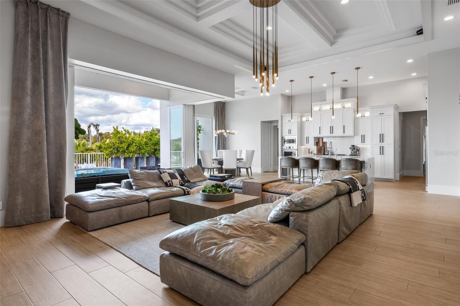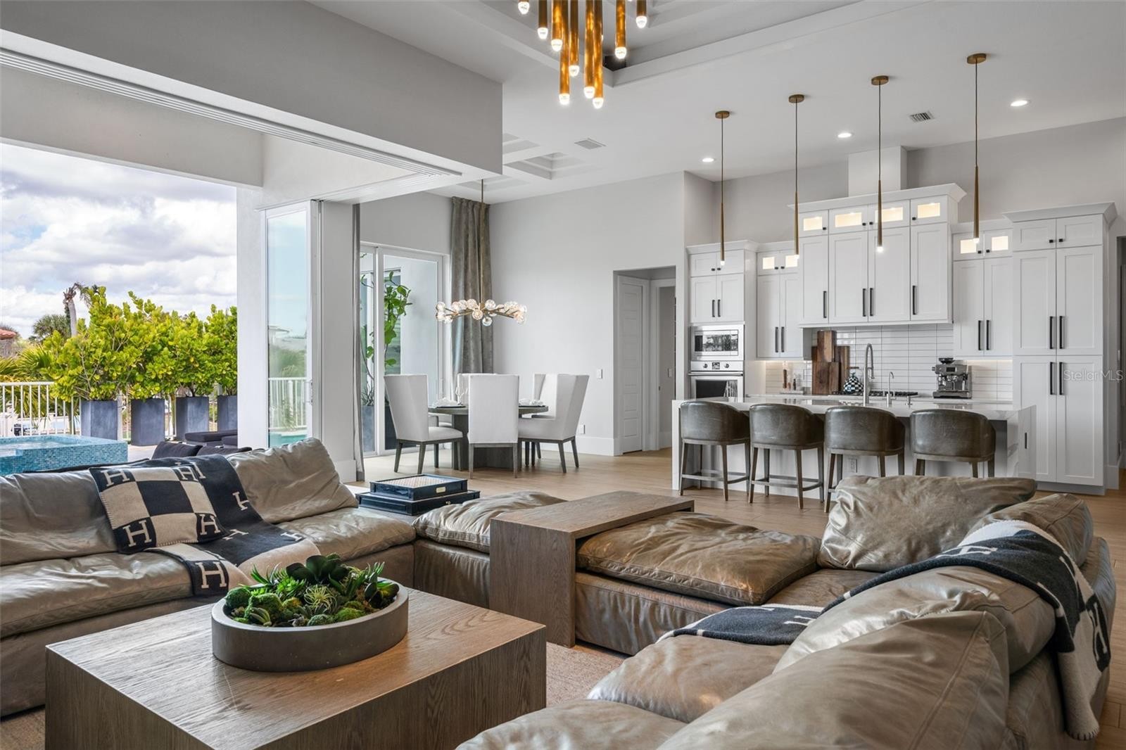 Perfectly positioned along the water, this exceptional residence offers a refined coastal lifestyle just moments from Siesta Key. Tucked away on a quiet street, the contemporary home enjoys southern exposure and approximately 100 feet of canal frontage with direct access to Sarasota Bay. Designed for both entertaining and everyday living, the open-concept interior features soaring ceilings exceeding 14 feet and expansive walls of impact-rated pocketing glass. When opened, the living areas flow seamlessly to a covered outdoor lounge, resort-style pool and spa, and a fully equipped outdoor kitchen, creating effortless indoor-outdoor living. The primary suite is privately located on the east side of the home and features oversized windows and glass sliders opening directly to the waterfront pool terrace, along with a custom walk-in closet and spa-inspired en-suite bath. On the west wing, two sun-filled guest bedrooms with walk-in closets share a beautifully appointed bathroom. A flexible bonus or media room serves as a fourth bedroom and includes an en-suite bath and walk-in closet. Additional features include a dedicated study or den, a fully air-conditioned split three-car garage, and thoughtfully designed spaces that balance style and functionality. With direct boating access to the Intracoastal and no HOA restrictions, this property offers an ideal waterfront lifestyle. Enjoy daily sunsets over the water and front-row views of Siesta Key’s Fourth of July fireworks—all from the comfort of your own home. Conveniently located minutes from Siesta Key Beach, Downtown Sarasota, and premier dining, shopping, and cultural destinations—including The Bay Park, Selby Gardens, and the Van Wezel Performing Arts Hall—this home presents a rare opportunity to enjoy contemporary design, privacy, and boating access in a sought-after coastal setting.