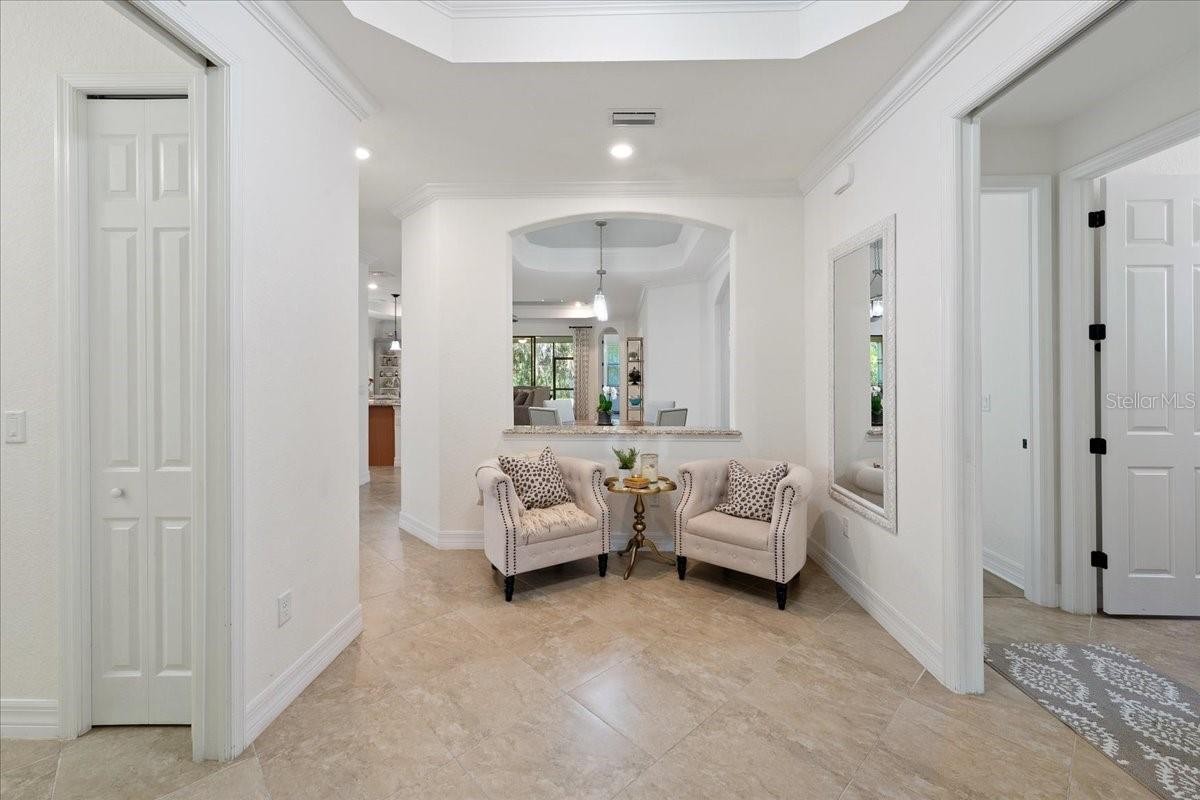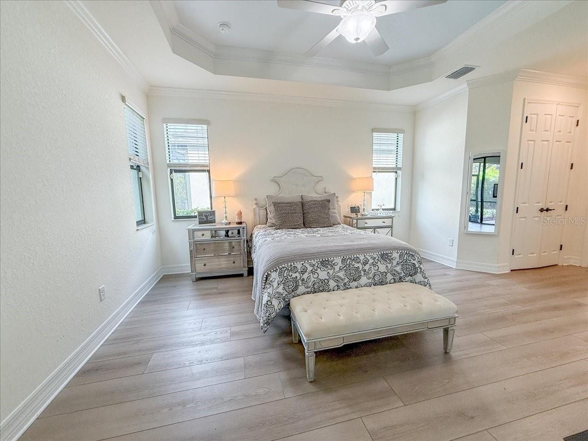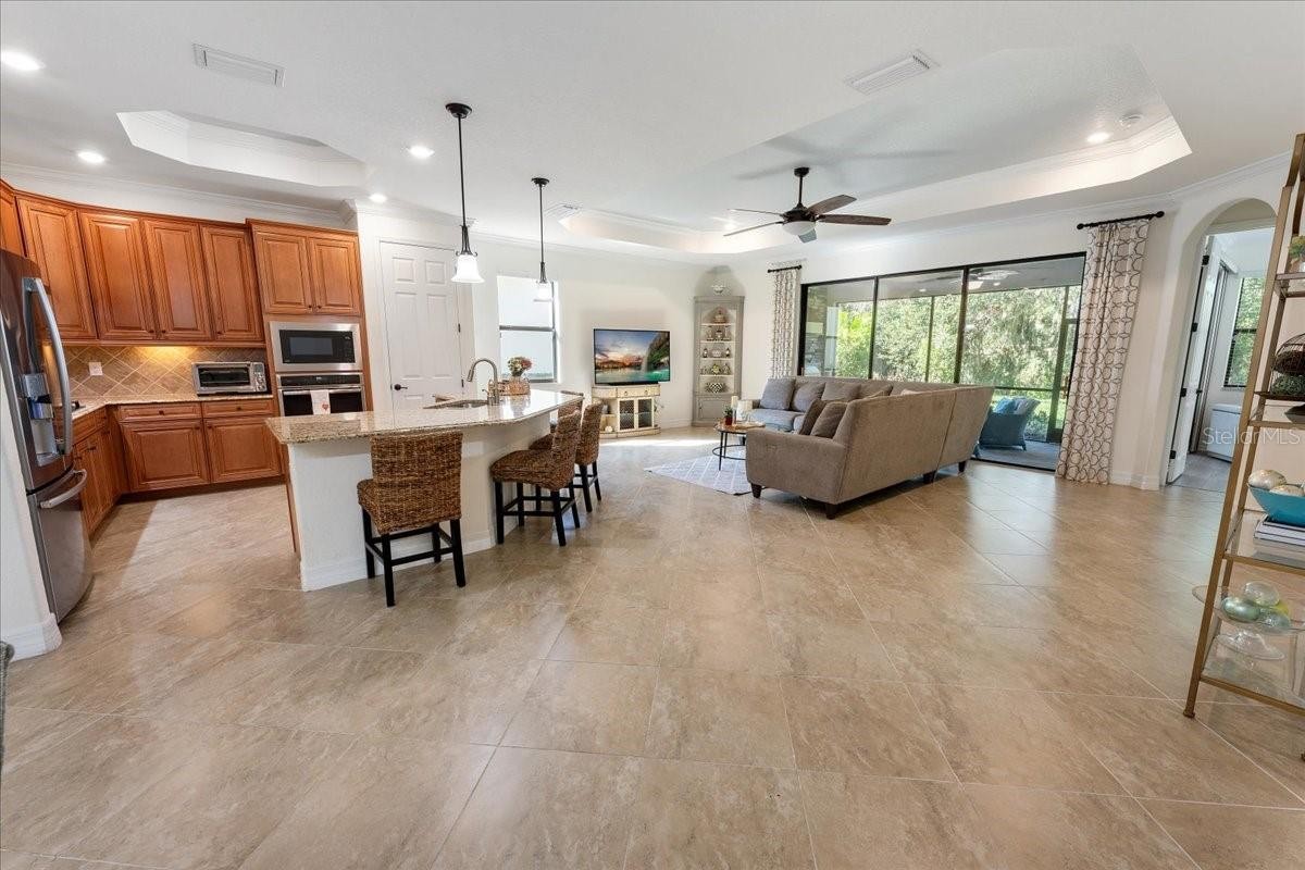 Offered at an exceptional value as the lowest-priced home currently available in Lakewood National Golf Club, this single-family residence is ideally situated on a quiet cul-de-sac and offers a peaceful setting within one of Lakewood Ranch’s most sought-after deeded golf communities. This well-appointed 4-bedroom, 2-bath, 2-car garage home welcomes you with a gracious foyer that creates a distinct living space at the front of the home, connecting seamlessly to the guest area and a generously sized laundry room with direct garage access. Two guest bedrooms are well-proportioned to accommodate king, queen, or twin beds and share a full bath with a pocket door that allows the guest wing to be closed off for added privacy. The fourth bedroom, office, or flex room offers versatile use with French doors and a large walk-in closet. The open-concept design then unfolds to the kitchen, dining, and living areas, featuring porcelain tile flooring throughout the main living spaces and highlighted by a large center island with granite countertops, maple cabinetry with under-cabinet lighting, designer backsplash, stainless steel appliances, tray ceilings throughout the primary living spaces, and crown molding. All overlook the lanai with outdoor kitchen, which opens to a wonderful nature preserve setting. The split-bedroom layout places the spacious primary suite at the rear of the home, featuring dual walk-in closets, tray ceiling detail, and a spa-inspired bath with double vanities, soaking tub, separate shower, private water closet, and linen storage. There is no private pool to maintain, with multiple community pools nearby and ample room to add a custom pool if desired. HOA-provided home landscaping includes routine mowing, shrub trimming, mulch, and ongoing maintenance, allowing for low-maintenance living. Impact-rated windows, along with impact-resistant protection for the rear sliding glass doors, provide added peace of mind. Seller upgrades include a Leaf Home Whole House Water Filtration System and the removal of carpet in all bedrooms, replaced with Luxury Vinyl Tile plank flooring by Fairfax Flooring, offering durability, a modern look, and a lifetime warranty. The garage features two ceiling-mounted storage racks for added organization and functionality. Lakewood National Golf Club is the only deeded golf community in Lakewood Ranch, where ownership for all residents includes access to two 18-hole Arnold Palmer–designed championship courses, one of which hosts the annual Korn Ferry Tour event, along with full community amenities. Residents enjoy a beach-entry heated lagoon pool with cascading waterfalls and lap lanes, six satellite pools, tiki bar, pub-style and fine dining in the Grand Clubhouse, a state-of-the-art fitness center with studios and a full-time trainer, spa services, lighted Har-Tru tennis, pickleball, bocce, practice facilities, scenic trails, and a vibrant calendar of community events. Completed in 2022, the community is fully established and professionally managed, offering 24-hour guard-gated and roaming security and a comprehensive, ownership-based lifestyle. A compelling opportunity within Lakewood National Golf Club.