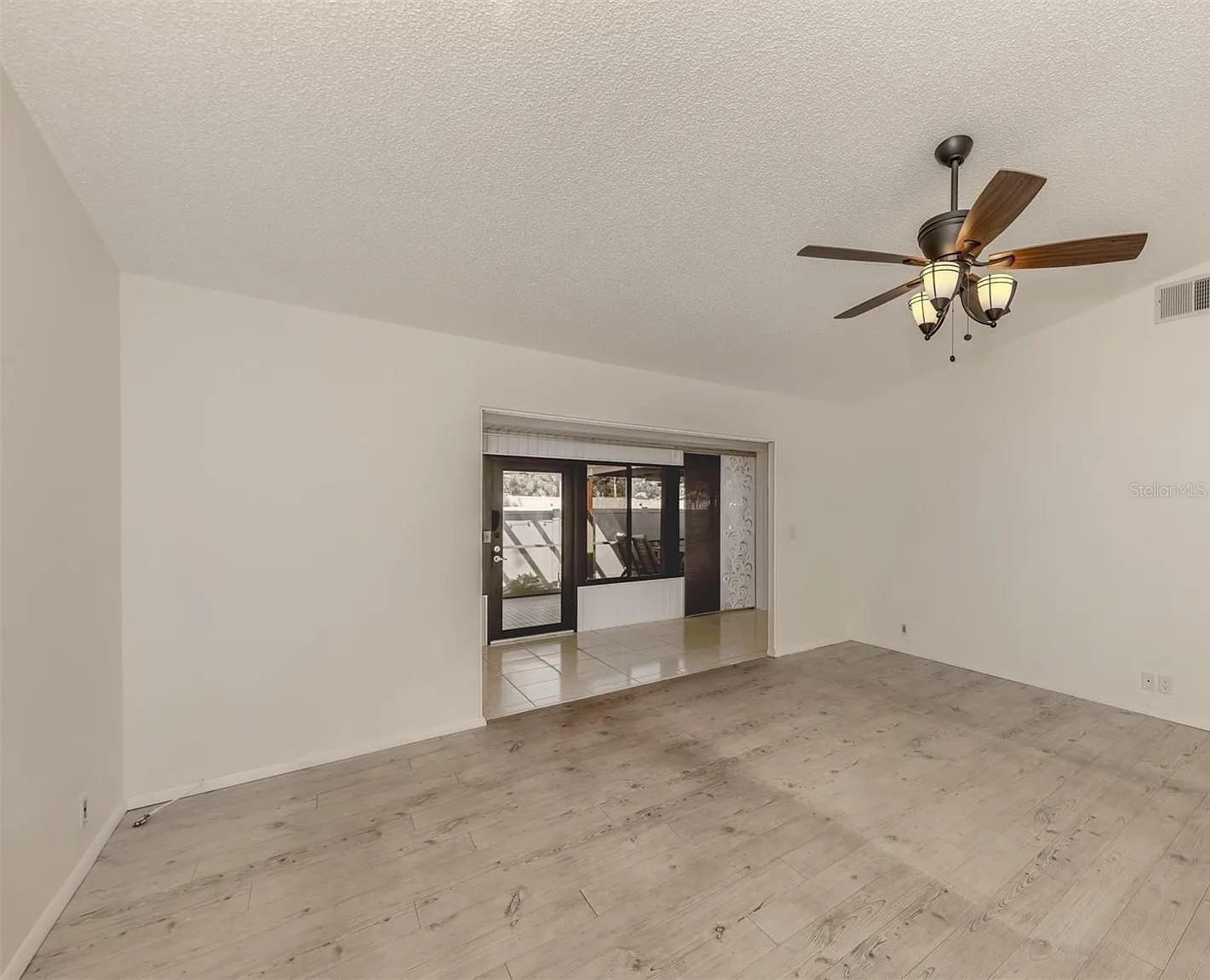 One or more photo(s) has been virtually staged. This updated villa in the 55+ Curry Cove community is perfect for carefree Florida living. It has 2 bedrooms, 2 bathrooms, and a covered carport. The home features an enclosed front porch, Corian countertops in the kitchen and bathrooms, stainless steel appliances, and wood flooring throughout the main living areas. The open layout with cathedral ceilings connects the kitchen, dining, and living rooms, giving it a spacious feel. The master bedroom has its own bathroom with a walk-in shower and a private entrance to the bonus room The bonus room adds extra space and includes a storage closet with washer and dryer. Enjoy your private, fenced patio with stylish flooring—a great place to enjoy your morning coffee or for entertaining guests on a temperate evening. With a whole house water filtration system, recent updates include a new AC in 2022 and a new hot water heater in 2025. Curry Cove offers a heated community pool and parking for RVs and boats. Its location is perfect for those who want to enjoy all the area offers Gulf beaches, downtown Venice, and a wide variety of dining and shopping venues.