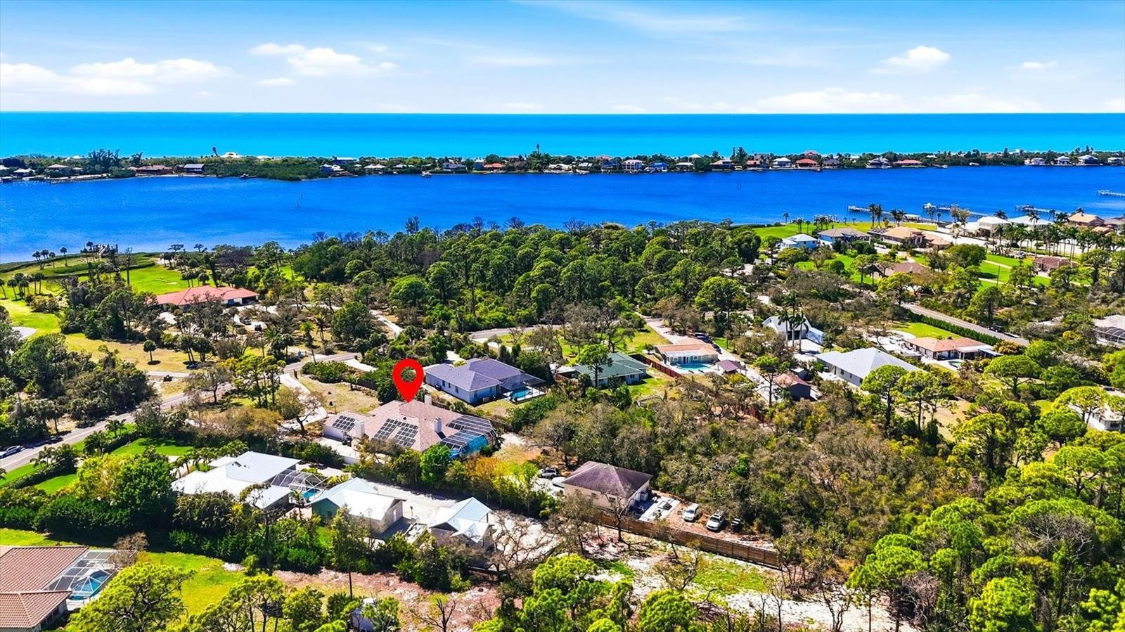 Welcome to a home that lives like a resort. This is a rare opportunity to own a coastal-style estate designed for laid-back luxury on 1.03 acres in Englewood’s premier Bayshore area. High and dry, this home did not flood during the storms. Offering 3,100 square feet of living space and garage space for 7 vehicles, this exceptional property features 3 bedrooms, 3.5 bathrooms, 3 fireplaces, impressive upgrades, and a thoughtfully designed layout. A striking double-door entry with an arched transom window and architectural columns welcomes you into the grand foyer and living room, where soaring 20+ foot vaulted ceilings create a dramatic first impression. Designed for everyday comfort and effortless entertaining, the main living spaces flow beautifully. The home’s character shines through in the many gathering areas, including a formal living room, comfortable family room, and a chef’s kitchen that serves as the heart of the home. The kitchen is anchored by a large island with abundant cabinetry and storage, generous prep space, a breakfast bar, an eat-in area, newer dishwasher, built-in convection oven and microwave, and a new Sub-Zero refrigerator. The recreation/billiards room, with an interior half bath, offers flexibility and could easily be transformed into a media room, fourth-bedroom suite, or in-law suite. Step outside and enjoy a private tropical oasis. The large resort-style lanai and pool area are designed for entertaining, featuring a wet bar beneath a pass-through window with an ice maker and wine fridge. Swim in the oversized lap pool while enjoying the privacy and beauty of this lush property. Meticulously upgraded for comfort and peace of mind, this home includes two-zone HVAC, a 15,000-watt emergency generator, a newer roof, soffit, and gutters, a newer solar system, newer stucco and exterior paint, two newer hot water heaters, and a newly resurfaced pool– with new drains, vents, returns, and tile. Professionally landscaped grounds feature multiple decking, patio, and lanai areas for relaxing and enjoying the surroundings. The detached 5-car garage and attached climate-controlled oversized 2-car garage provide exceptional space for vehicles, hobbies, storage, or workshop use. The impressive semi-circular double-gated entry leads to the residence, while the extended driveway continues beyond the home to the triple-bay detached garage of over 1,200 square feet, complete with workshop space, three hurricane-rated garage doors, and an oversized center door. Inside, the home offers privacy and flexibility. The primary suite is a retreat with fireplace, jetted tub, dual vanities, dual walk-in closets, and sliding glass doors to the pool lanai. Behind a pocket door off the family room, guests or family members will appreciate a private bedroom wing with the second and third bedrooms, including one en-suite bedroom and a third bath off the third bedroom. The oversized interior laundry room adds functionality. Pets will enjoy the freedom of a fully fenced yard and a dog run. Perfectly located, with partial water views of the bay (ICW), this property offers the best of coastal living, just one mile from Manasota Key’s beach and minutes from restaurants, shopping, and dining. With hundreds of thousands of dollars in upgrades throughout the home and property, this is a rare opportunity to own a one-of-a-kind estate at an incredible value. Add your finishing touches and make this exceptional property your own.