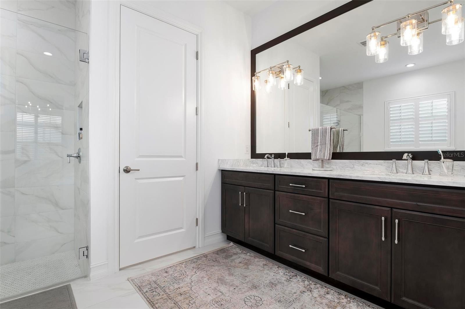 Tucked behind the gates of The Lake Club in Lakewood Ranch, this 2021-built Easton Grand III estate feels like a private retreat where elegance and ease live beautifully together—gracefully positioned on one of the largest homesites in The Lake Club. A sweeping paver driveway, side-load three-car garage, and manicured landscaping give a warm welcome. Inside, a soaring foyer crowned with detailed molding and a sparkling designer chandelier sets a graceful tone. Engineered hardwood floors, plantation shutters, and refined finishes flow throughout, creating a home that feels both grand and inviting. The great room is made for gathering, anchored by a linear fireplace framed in herringbone shiplap and a warm wood mantel. Pocketing sliders vanish to reveal the lanai, seamlessly blending indoor and outdoor living. The kitchen is as enchanting as it is functional, featuring stainless steel KitchenAid appliances, a five-burner gas cooktop with statement hood, granite countertops, stone backsplash, abundant cabinetry, and an oversized island perfect for lingering conversations. Sunlight pours into the adjacent dining area, where a designer chandelier makes everyday meals feel special. Privately situated, the primary suite offers a peaceful escape with shiplap accents, a cozy sitting area, and two custom walk-in closets. The spa-inspired bath includes dual vanities, a soaking tub, and a walk-in shower. Three additional bedrooms—one with a private bath—provide comfort and flexibility, while a French-door office creates a quiet space for work or reflection. Upstairs, a charming loft and adjacent fitness room or potential fourth bedroom with a full bath add versatility. Outdoors, the magic continues. The expansive homesite creates an added sense of privacy and space rarely found within the community. The covered lanai showcases a custom media wall and a fully equipped summer kitchen with a built-in Blaze grill. A sparkling saltwater pool and spa shimmer with blue tile accents, waterfall bowls with fire features, LED lighting, and a sun shelf. A private pool bath, sauna, screened lanai, and fenced yard framed by lush landscaping complete this serene setting. Residents enjoy resort-style amenities and are just moments from shopping and dining at The Mall at University Town Center, Lakewood Ranch Main Street, and Waterside Place. A home where everyday living feels just a little more magical.