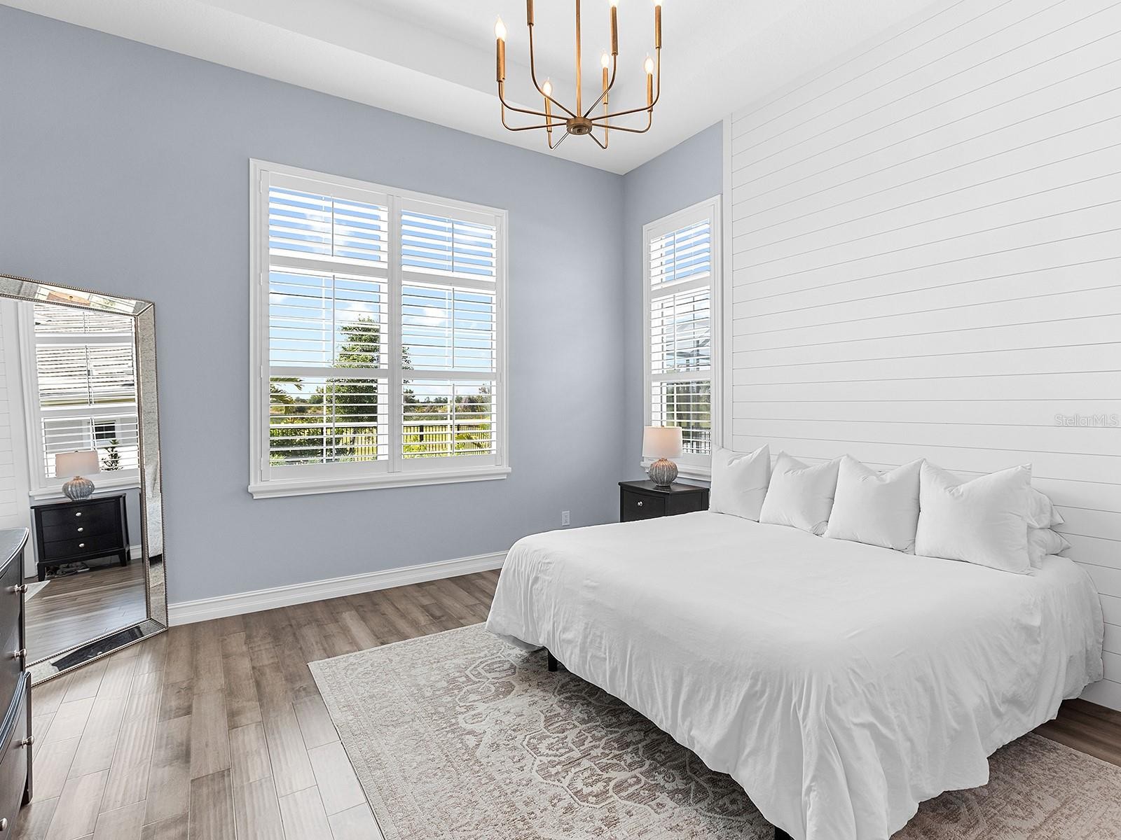 This is an exceptional residence tucked within the gates of Lakewood Ranch’s exclusive community, The Lake Club. With its elegant Eaton Grand III floor plan, this 2021-built estate offers effortless luxury. The home’s stately curb appeal sets the tone from the moment you arrive, with a side-load three-car garage, oversized paver driveway and manicured landscaping. Step through the front door into a soaring foyer adorned with accent trim, crown molding and a designer chandelier. Throughout the home, rich engineered hardwood flooring, plantation shutters, and sophisticated finishes speak to the care and detail poured into every room. The great room is an expansive space framed by a wallpaper accent wall and a striking linear fireplace with herringbone shiplap and a wood mantel. Pocketing sliders disappear to connect indoor-outdoor living. The kitchen boasts stainless steel KitchenAid appliances, including a five-burner gas cooktop with a statement hood and built-in oven and microwave/convection, granite countertops, stone backsplash and abundant cabinetry with under-cabinet lighting. A generous pantry cabinet, a lazy Susan corner cabinet, and an oversized island create ease for daily routines and entertaining. Just off the kitchen, the dining area is flooded with natural light from two large windows and elevated by a designer chandelier. Secluded in its own wing, the primary suite is a private retreat featuring an alcove entry, shiplap accent walls, a sitting area and two custom walk-in closets with thoughtful built-ins. The en-suite bath is complete with dual vanities, a soaking tub, a walk-in shower and a private water closet. Three additional bedrooms provide comfort and flexibility. One guest suite includes a private bath, while two more share a full bath in a cleverly designed pocketed guest wing. A quiet office, accessible through French doors, offers the perfect space for a home office or library. Upstairs, the loft offers versatile bonus space while an adjacent fitness room, or potential fourth bedroom, features three large windows and a spacious closet. A full bath with quartz-topped vanity and tub/shower completes the upper level. Step out to the lanai and enjoy a covered seating area centered around a custom media wall. The fully equipped summer kitchen includes a built-in Blaze grill, sink, mini refrigerator and granite countertops. The saltwater pool and spa await with blue tile accents, LED lighting, waterfall bowls with fire features and a sun shelf. A dedicated pool bath with quartz vanity and tile floors adds ease, and the included sauna invites relaxation. A brand new pool and lanai screen was installed July 2025. The fenced yard, bordered by mature landscaping, creates peace of mind for pets or children. Additional features include a well-appointed laundry room with granite counters and ample cabinetry, a large storage space under the stairs and a spacious three-car garage. In The Lake Club, residents enjoy access to a wealth of amenities, including two resort-style heated pools, a recently renovated clubhouse with fine dining and bar area, a fitness center, spa, tennis courts, pickleball, a playground, dog park, and services of a full-time concierge and activities director. Additionally, residents are near The Mall at UTC, LWR Main Street, Waterside Place and dining options. Experience luxury living in this home, where every detail has been carefully considered to provide the ultimate Lakewood Ranch lifestyle.