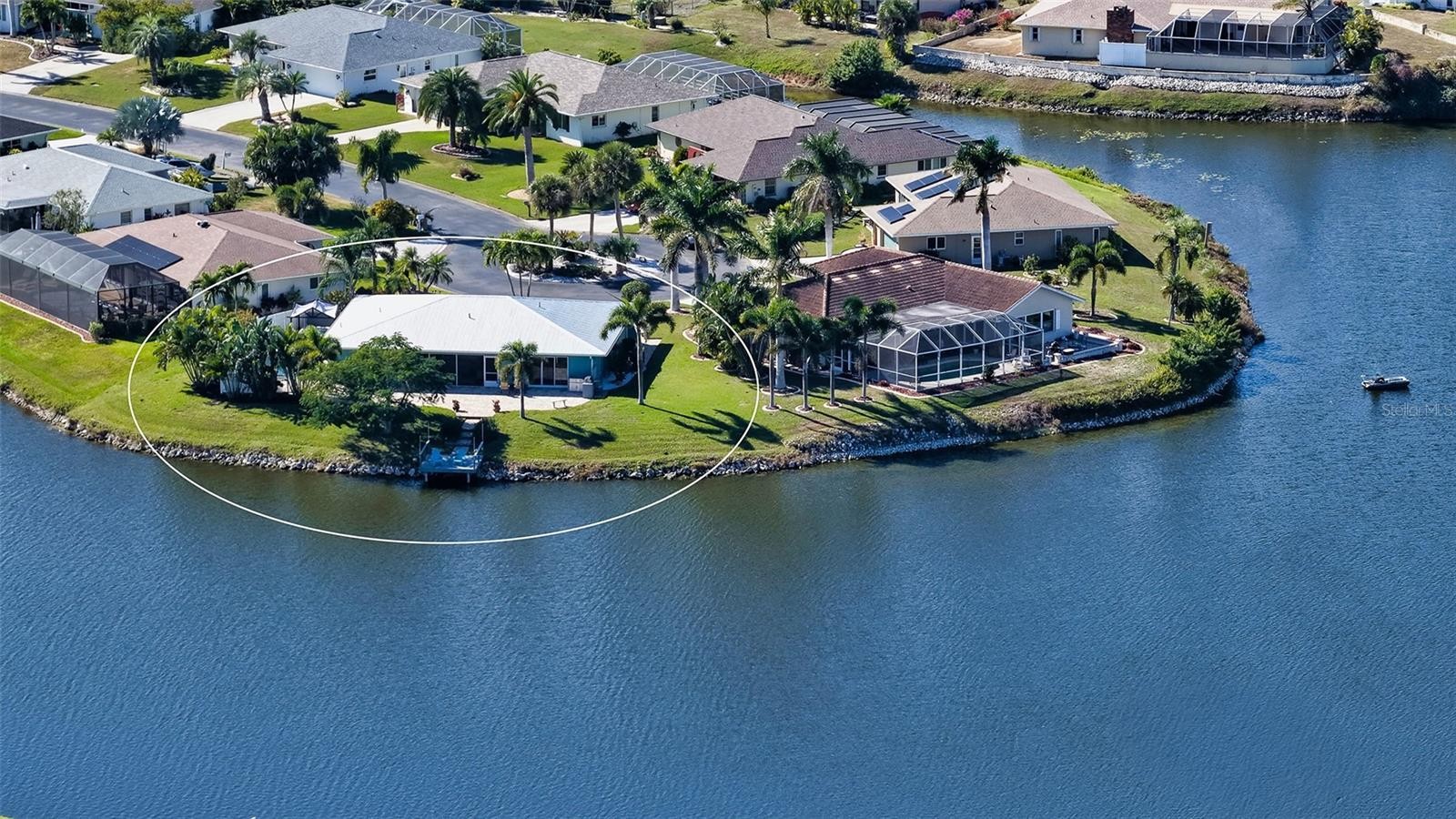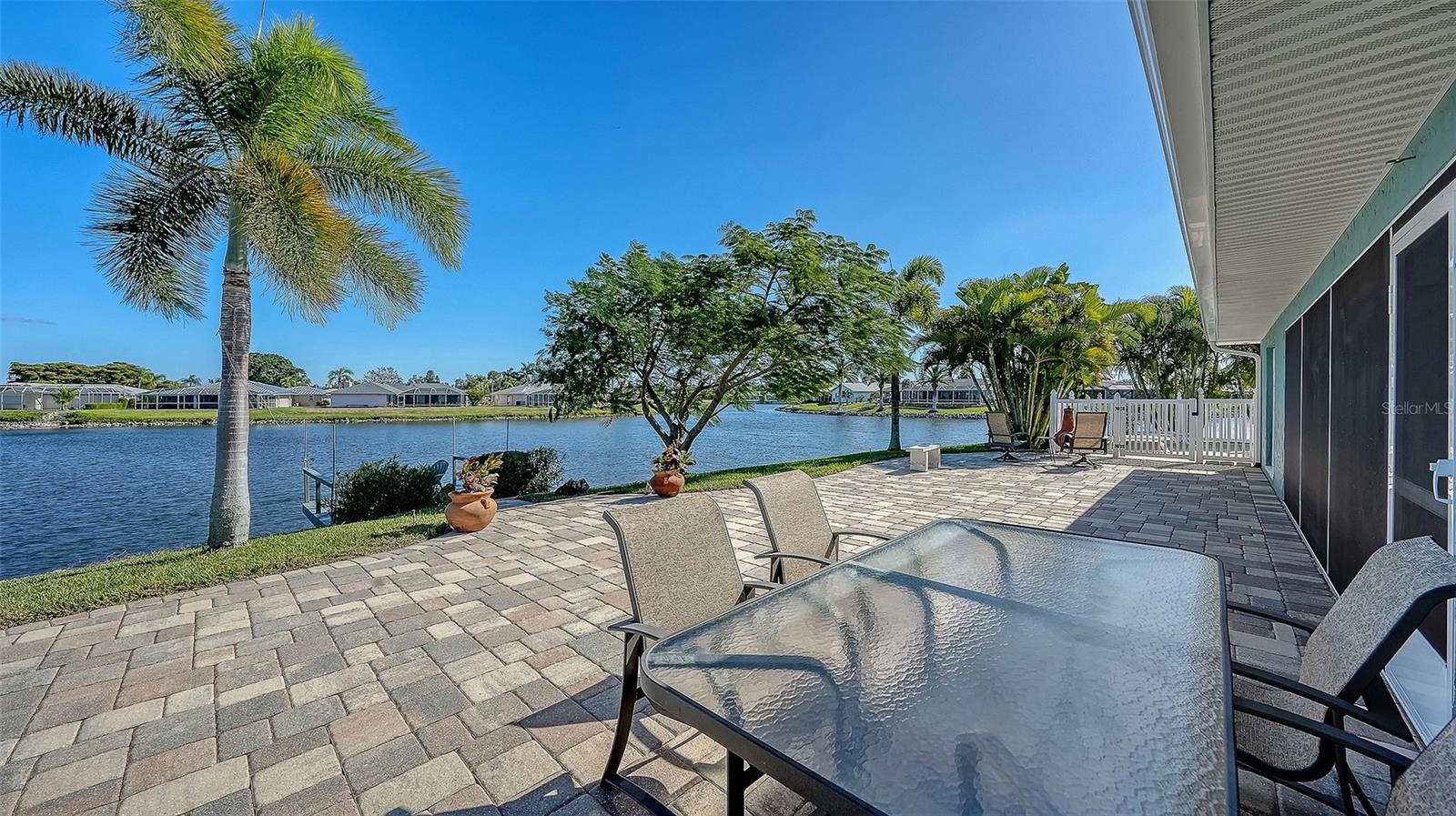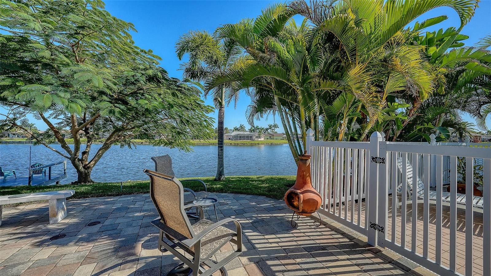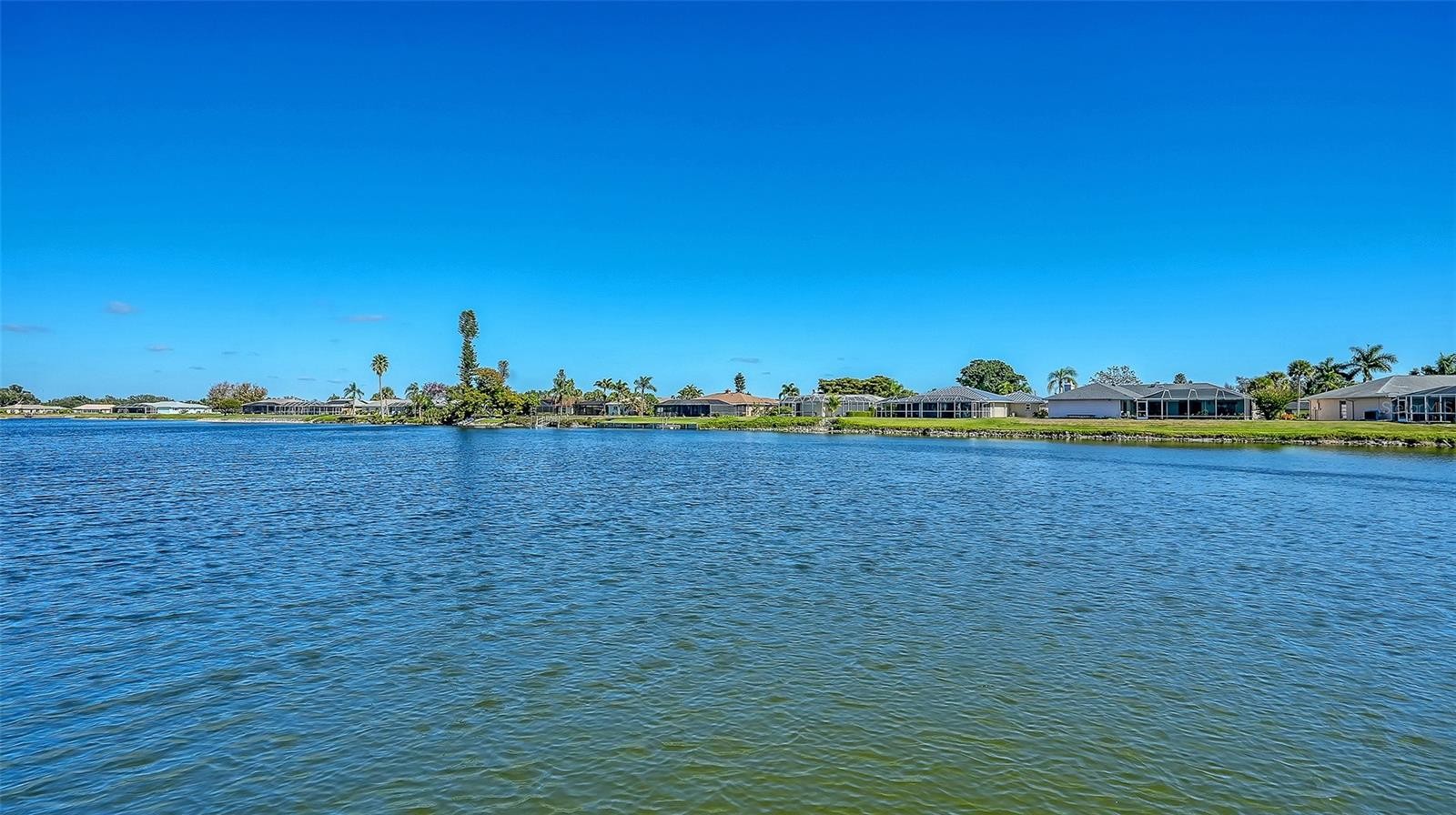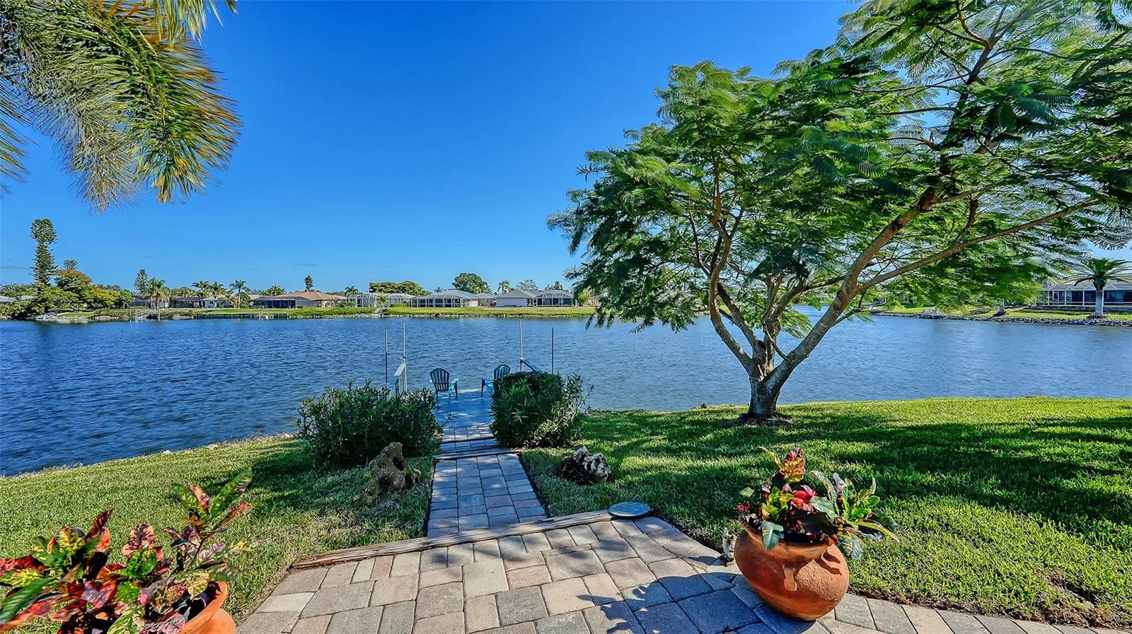 Welcome to Jacaranda West, where this premier peninsula homesite at the end of a quiet cul-de-sac captures 149 feet of shoreline and wide 180-degree open-water views across the broadest stretch of Claw Lake—an outlook that brings light, space, and privacy to everyday living. Claw Lake is spring-fed and winds for more than two miles through the community, bordered by gently curving riprap shoreline. It’s designed for the kind of lake life community actually want: kayaking, canoeing, paddlecraft, sailing, and electric-motor boating are welcome, while combustible engines are prohibited. Whether you enjoy a quiet paddle, casting a line, or simply watching the water change throughout the day, the setting supports it naturally. Inside, the home offers 1,704 square feet of thoughtfully updated, open-concept living with two bedrooms, two baths, and an oversized two-car garage. The interior lives bright and wide, with expansive windows and sliding glass doors that keep the lake present throughout the main living spaces. The result is a seamless relationship between indoors and outdoors—easy for everyday living and equally comfortable for entertaining. Outdoor living has been planned with intention: the 30-by-15-foot pool and heated spa are positioned along the side of the home so they preserve the full sweep of shoreline and water views from the primary rooms. More than 1,000 square feet of brick pavers span the patio and pool deck, creating generous space for dining, lounging, and gathering. At the water’s edge, the 12-by-12-foot dock with railing becomes the natural destination—sunrise coffee, a quiet afternoon, or a glass of wine at sunset as the lake settles into evening. Inside, the layout follows the waterline, keeping the view as the home’s defining feature. As you move through the house, the lake remains the constant backdrop—breathtaking in scale, calming in effect. Satin walls, higher crown molding, and paneled doors and casings provide a finished, cohesive feel that complements the setting without distracting from it. The overall impression is calm, casual elegance. The residence has been comprehensively improved with hand-crafted cabinetry and custom built-ins, granite countertops, and new luxury vinyl flooring—creating a refined yet comfortable environment that is ready to enjoy. Convenience completes the package: approximately 10 minutes to downtown Venice shops and restaurants, 10 to 15 minutes to area beaches, and about five minutes to Jacaranda West Country Club, with additional golf options close by. Recent improvements include a new metal roof, gutters, soffits, and full interior/exterior painting (Jan 2023); a new air-conditioning system with all-new ductwork; a remodeled kitchen; new flooring (Aug 2020); attic insulation upgraded to R-49 (Sep 2022); and a new lake-fed irrigation pump and timer (Sep 2025). If you’ve been waiting for a home where the view truly defines the experience—and where the lake feels like part of daily life—this is one you must see in person.