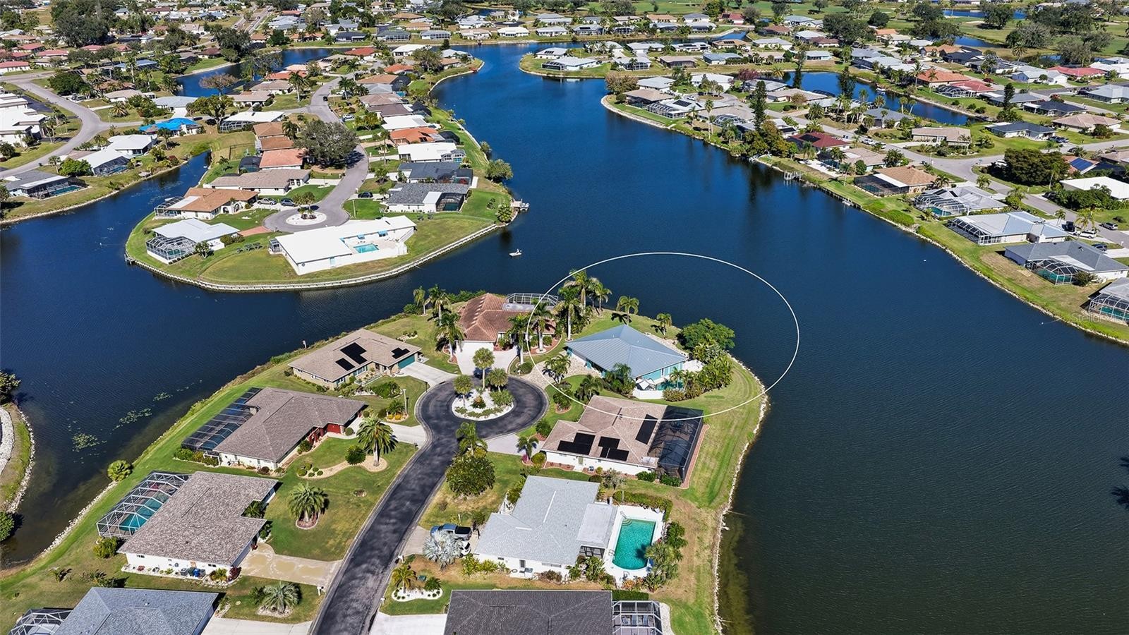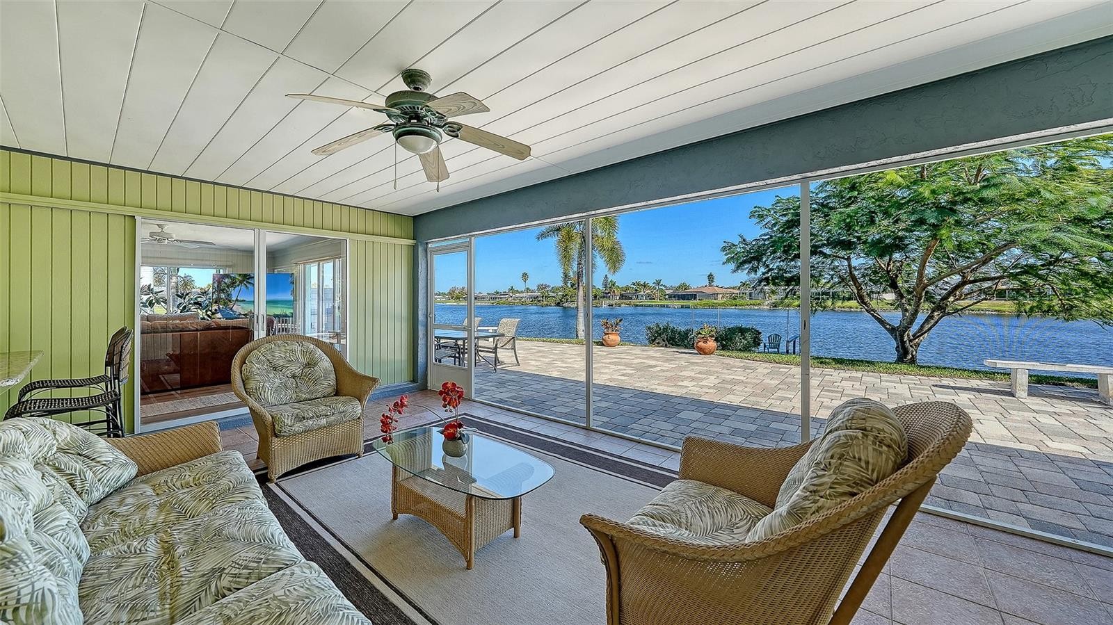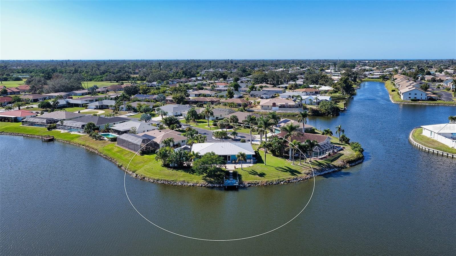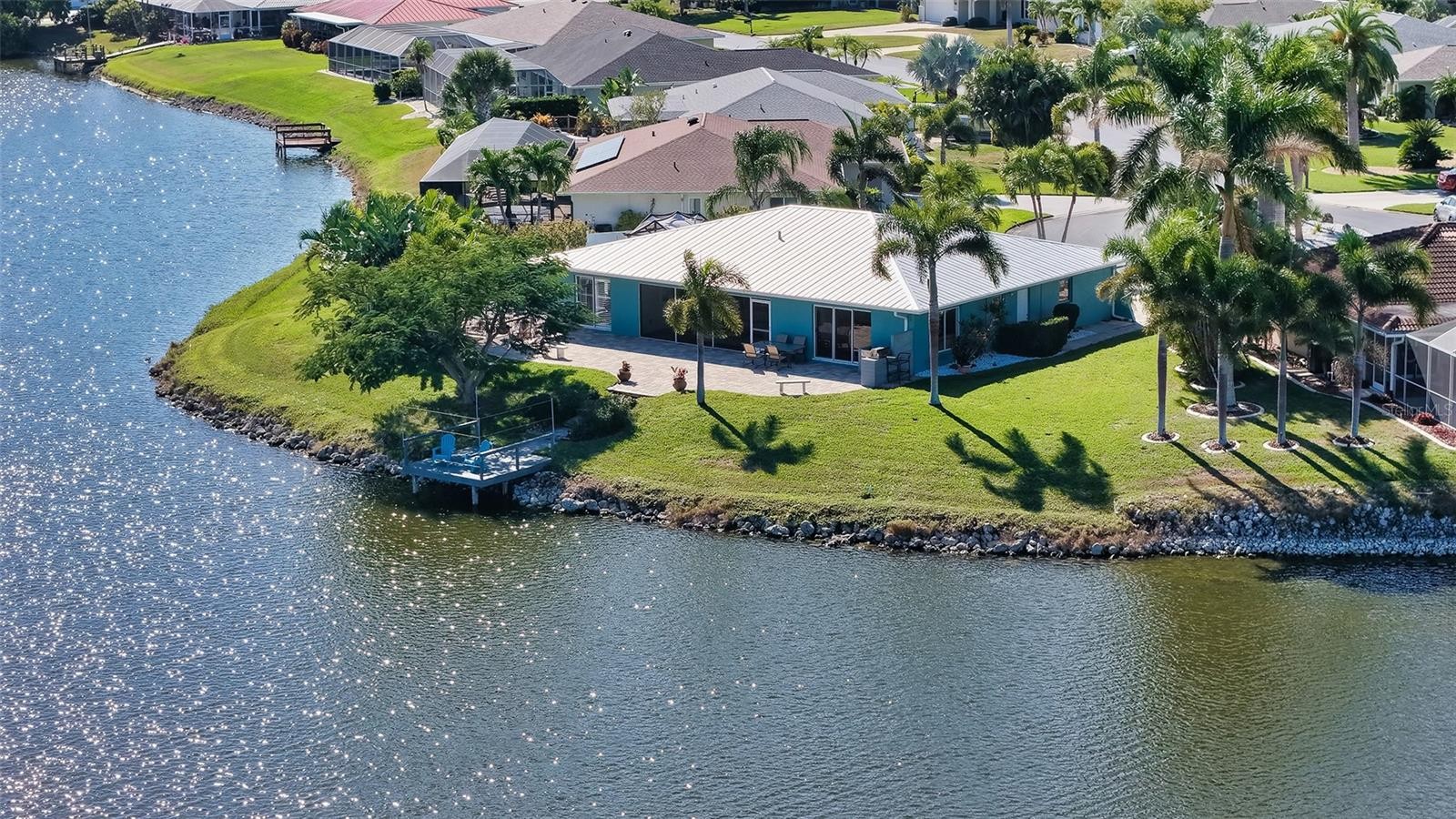 Welcome to Jacaranda West, where this premier peninsula homesite at the end of a quiet cul-de-sac captures 149 feet of shoreline and wide 180-degree open-water views across the broadest stretch of Claw Lake—an outlook that brings light, space, and privacy to everyday living. Claw Lake is spring-fed and winds for more than two miles through the community, bordered by gently curving riprap shoreline. It’s designed for the kind of lake life community actually want: kayaking, canoeing, paddlecraft, sailing, and electric-motor boating are welcome, while combustible engines are prohibited. Whether you enjoy a quiet paddle, casting a line, or simply watching the water change throughout the day, the setting supports it naturally. Inside, the home offers 1,704 square feet of thoughtfully updated, open-concept living with two bedrooms, two baths, and an oversized two-car garage. The interior lives bright and wide, with expansive windows and sliding glass doors that keep the lake present throughout the main living spaces. The result is a seamless relationship between indoors and outdoors—easy for everyday living and equally comfortable for entertaining. Outdoor living has been planned with intention: the 30-by-15-foot pool and heated spa are positioned along the side of the home so they preserve the full sweep of shoreline and water views from the primary rooms. More than 1,000 square feet of brick pavers span the patio and pool deck, creating generous space for dining, lounging, and gathering. At the water’s edge, the 12-by-12-foot dock with railing becomes the natural destination—sunrise coffee, a quiet afternoon, or a glass of wine at sunset as the lake settles into evening. Inside, the layout follows the waterline, keeping the view as the home’s defining feature. As you move through the house, the lake remains the constant backdrop—breathtaking in scale, calming in effect. Satin walls, higher crown molding, and paneled doors and casings provide a finished, cohesive feel that complements the setting without distracting from it. The overall impression is calm, casual elegance. The residence has been comprehensively improved with hand-crafted cabinetry and custom built-ins, granite countertops, and new luxury vinyl flooring—creating a refined yet comfortable environment that is ready to enjoy. Convenience completes the package: approximately 10 minutes to downtown Venice shops and restaurants, 10 to 15 minutes to area beaches, and about five minutes to Jacaranda West Country Club, with additional golf options close by. Recent improvements include a new metal roof, gutters, soffits, and full interior/exterior painting (Jan 2023); a new air-conditioning system with all-new ductwork; a remodeled kitchen; new flooring (Aug 2020); attic insulation upgraded to R-49 (Sep 2022); and a new lake-fed irrigation pump and timer (Sep 2025). If you’ve been waiting for a home where the view truly defines the experience—and where the lake feels like part of daily life—this is one you must see in person.