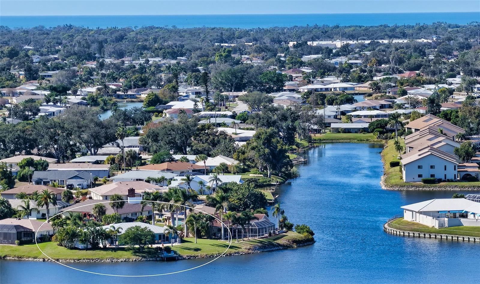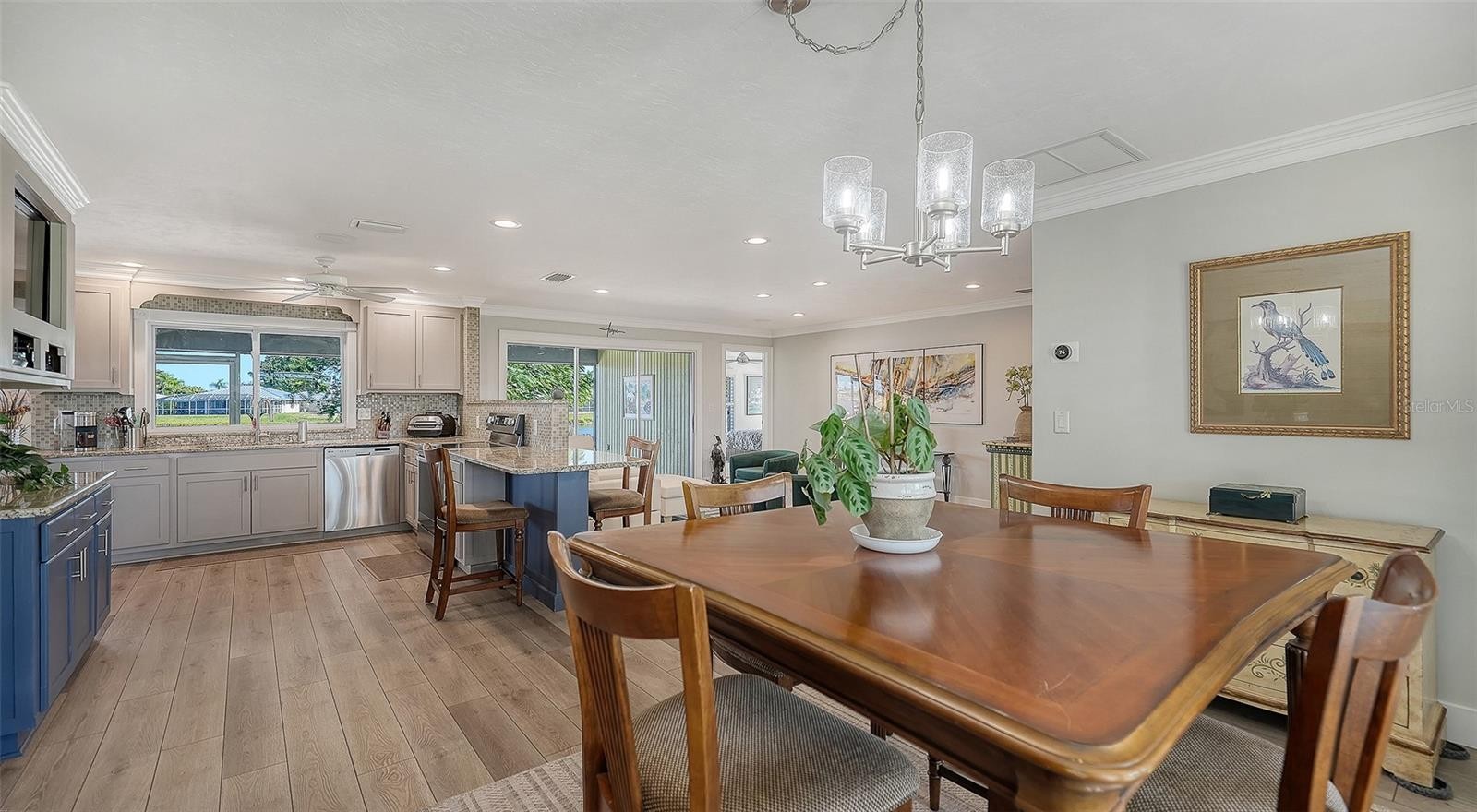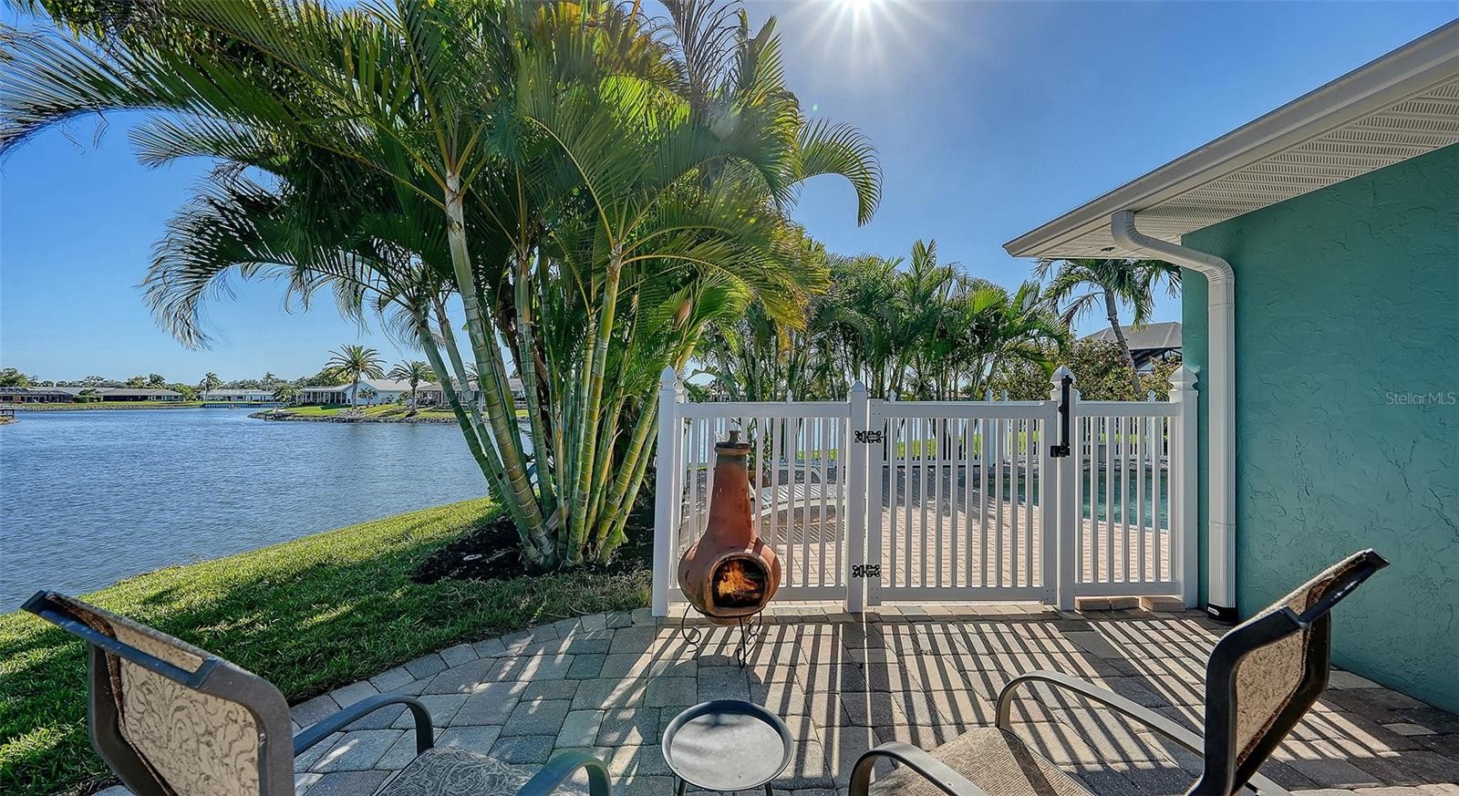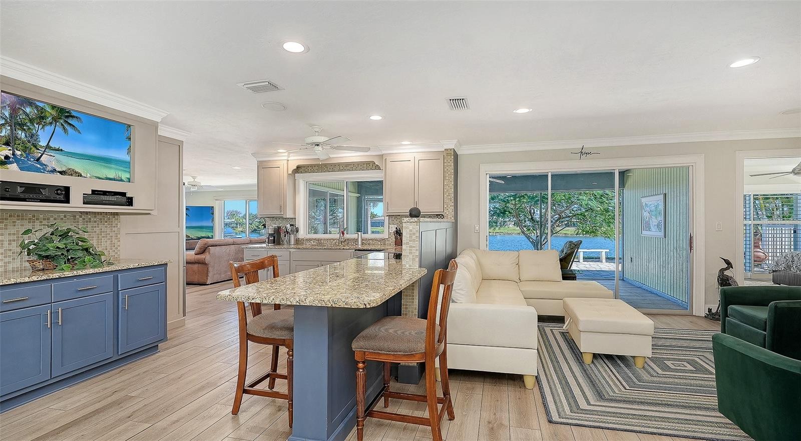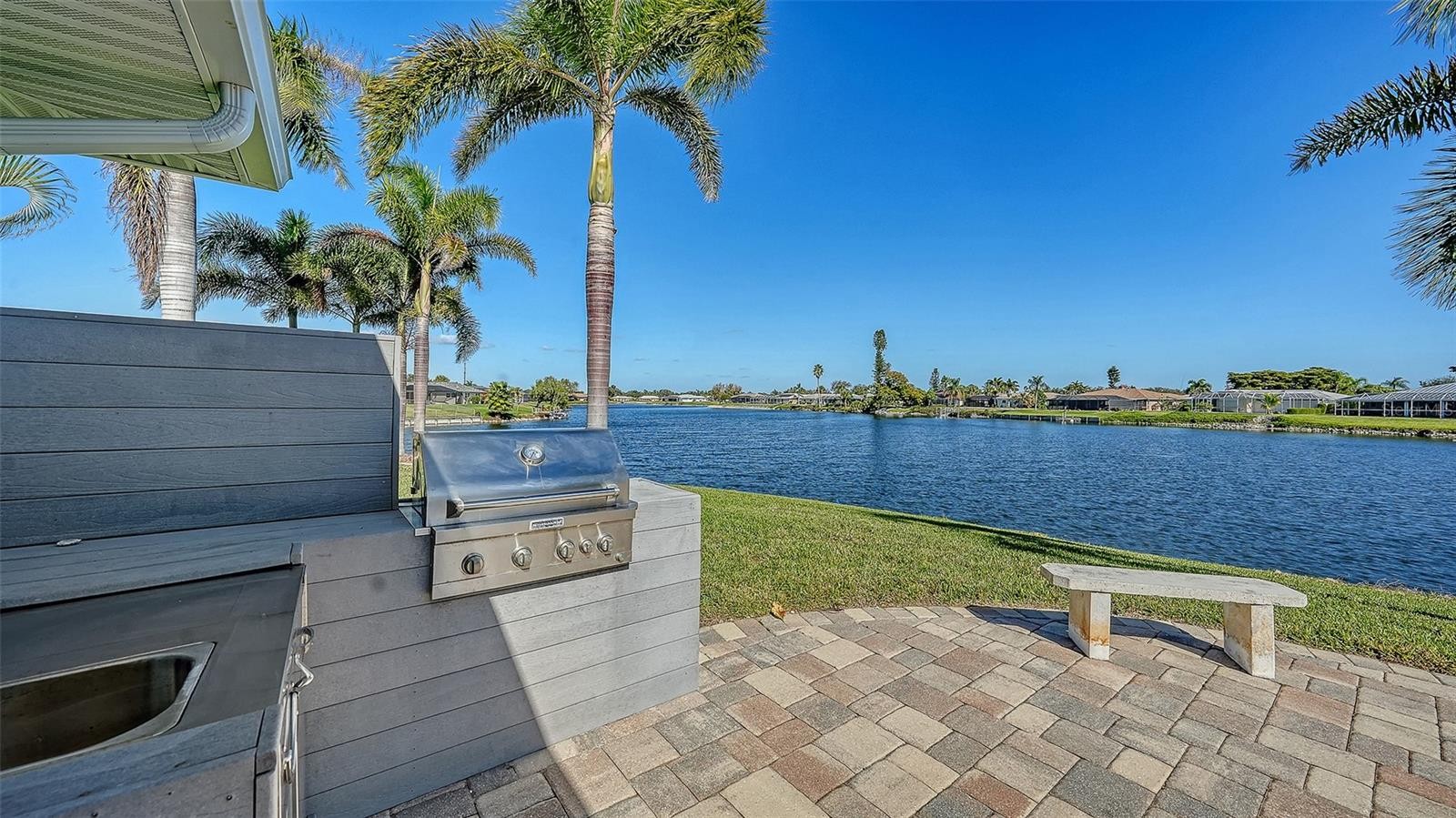 Welcome to Jacaranda West, where this premier peninsula homesite at the end of a quiet cul-de-sac captures 149 feet of shoreline and wide 180-degree open-water views across the broadest stretch of Claw Lake—an outlook that brings light, space, and privacy to everyday living. Claw Lake is spring-fed and winds for more than two miles through the community, bordered by gently curving riprap shoreline. It’s designed for the kind of lake life community actually want: kayaking, canoeing, paddlecraft, sailing, and electric-motor boating are welcome, while combustible engines are prohibited. Whether you enjoy a quiet paddle, casting a line, or simply watching the water change throughout the day, the setting supports it naturally. Inside, the home offers 1,704 square feet of thoughtfully updated, open-concept living with two bedrooms, two baths, and an oversized two-car garage. The interior lives bright and wide, with expansive windows and sliding glass doors that keep the lake present throughout the main living spaces. The result is a seamless relationship between indoors and outdoors—easy for everyday living and equally comfortable for entertaining. Outdoor living has been planned with intention: the 30-by-15-foot pool and heated spa are positioned along the side of the home so they preserve the full sweep of shoreline and water views from the primary rooms. More than 1,000 square feet of brick pavers span the patio and pool deck, creating generous space for dining, lounging, and gathering. At the water’s edge, the 12-by-12-foot dock with railing becomes the natural destination—sunrise coffee, a quiet afternoon, or a glass of wine at sunset as the lake settles into evening. Inside, the layout follows the waterline, keeping the view as the home’s defining feature. As you move through the house, the lake remains the constant backdrop—breathtaking in scale, calming in effect. Satin walls, higher crown molding, and paneled doors and casings provide a finished, cohesive feel that complements the setting without distracting from it. The overall impression is calm, casual elegance. The residence has been comprehensively improved with hand-crafted cabinetry and custom built-ins, granite countertops, and new luxury vinyl flooring—creating a refined yet comfortable environment that is ready to enjoy. Convenience completes the package: approximately 10 minutes to downtown Venice shops and restaurants, 10 to 15 minutes to area beaches, and about five minutes to Jacaranda West Country Club, with additional golf options close by. Recent improvements include a new metal roof, gutters, soffits, and full interior/exterior painting (Jan 2023); a new air-conditioning system with all-new ductwork; a remodeled kitchen; new flooring (Aug 2020); attic insulation upgraded to R-49 (Sep 2022); and a new lake-fed irrigation pump and timer (Sep 2025). If you’ve been waiting for a home where the view truly defines the experience—and where the lake feels like part of daily life—this is one you must see in person.