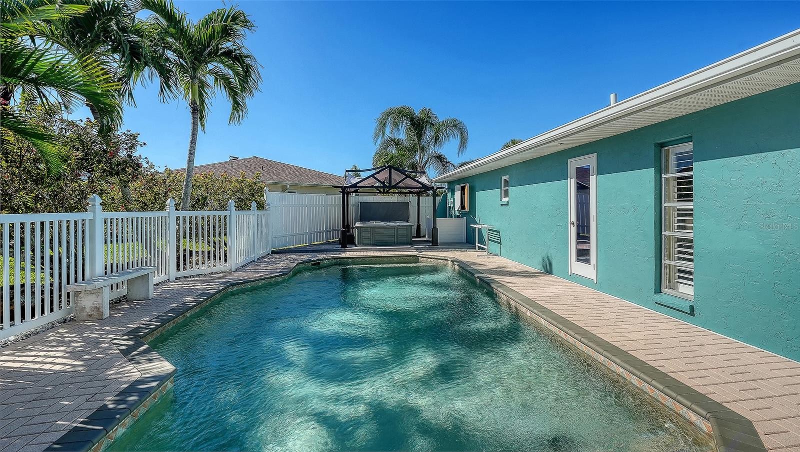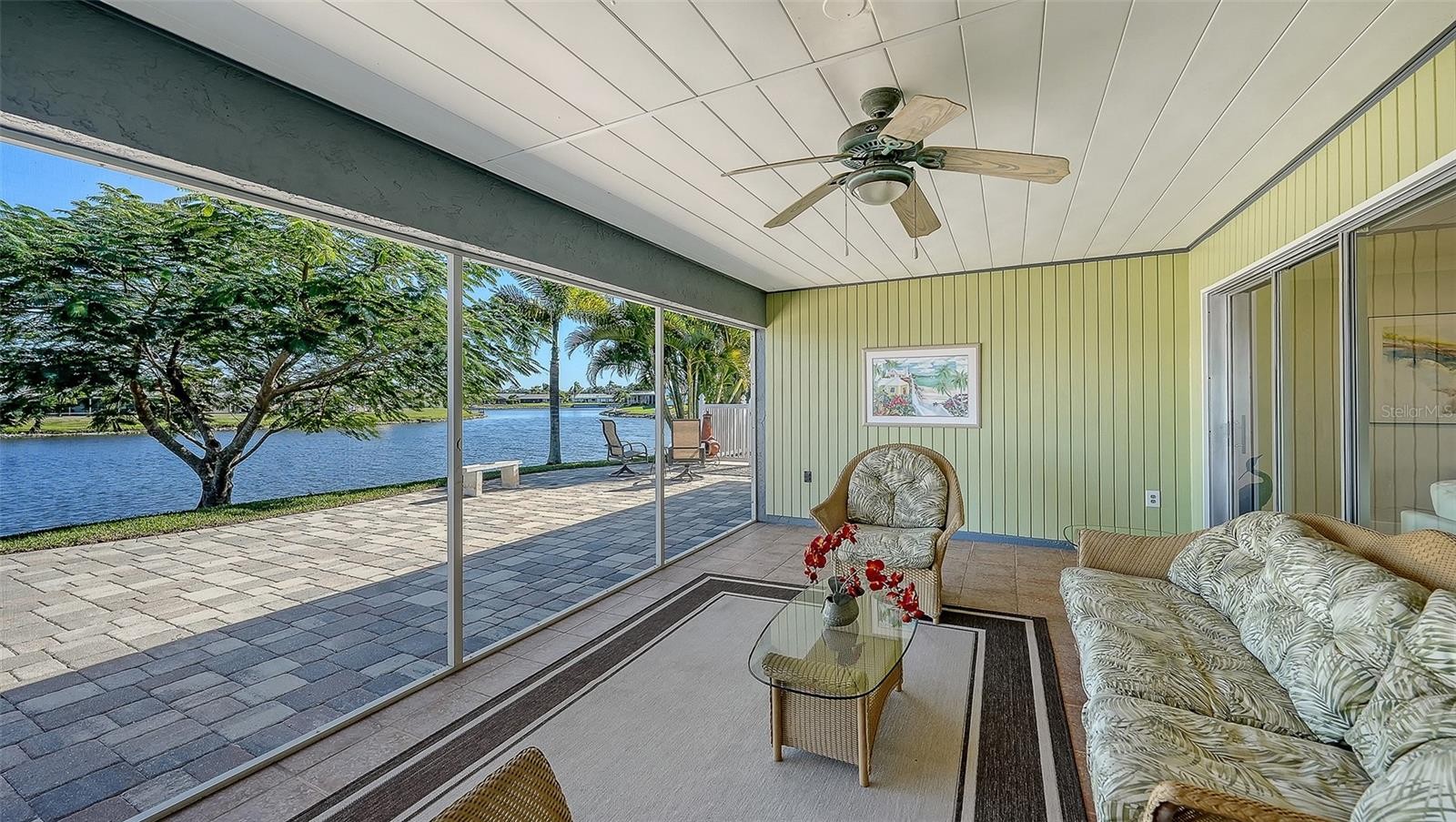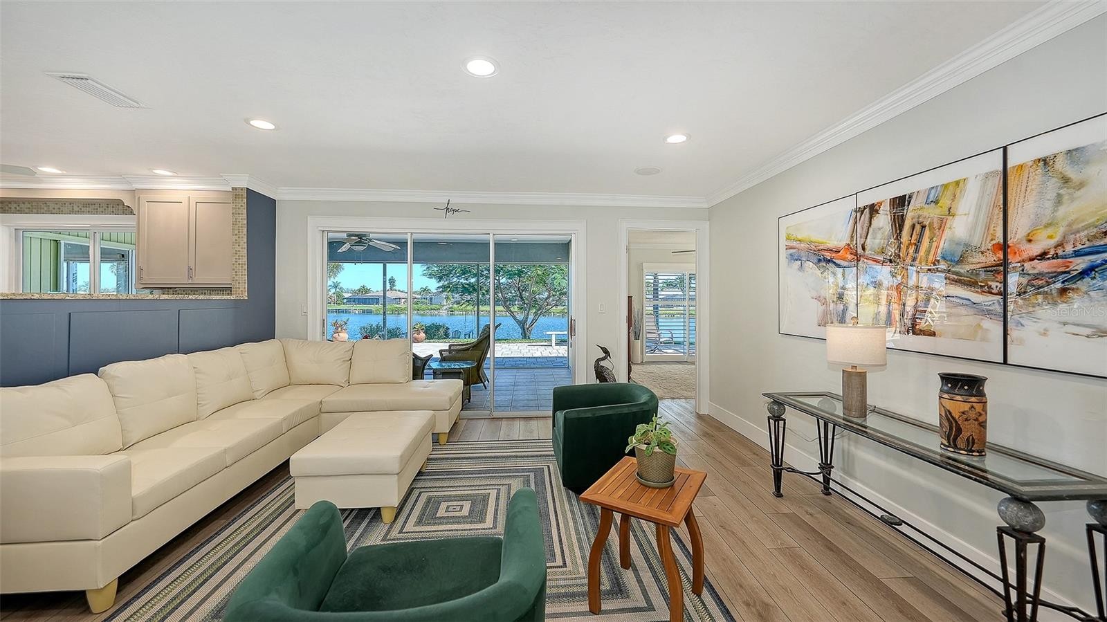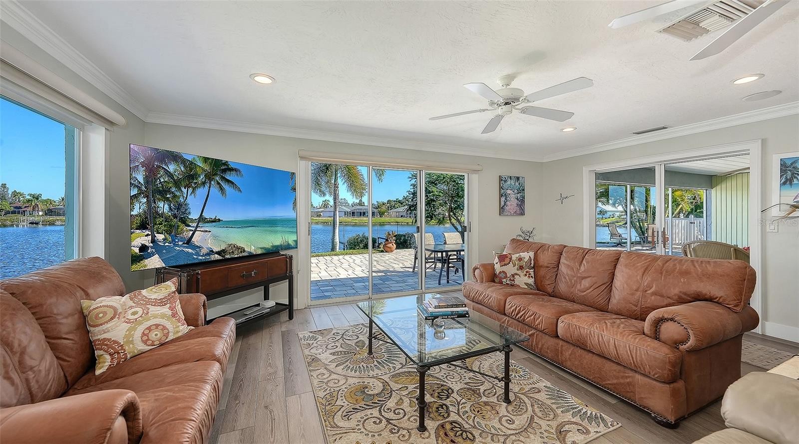 Welcome to Jacaranda West, where this premier peninsula homesite at the end of a quiet cul-de-sac captures 149 feet of shoreline and wide 180-degree open-water views across the broadest stretch of Claw Lake—an outlook that brings light, space, and privacy to everyday living. Claw Lake is spring-fed and winds for more than two miles through the community, bordered by gently curving riprap shoreline. It’s designed for the kind of lake life community actually want: kayaking, canoeing, paddlecraft, sailing, and electric-motor boating are welcome, while combustible engines are prohibited. Whether you enjoy a quiet paddle, casting a line, or simply watching the water change throughout the day, the setting supports it naturally. Inside, the home offers 1,704 square feet of thoughtfully updated, open-concept living with two bedrooms, two baths, and an oversized two-car garage. The interior lives bright and wide, with expansive windows and sliding glass doors that keep the lake present throughout the main living spaces. The result is a seamless relationship between indoors and outdoors—easy for everyday living and equally comfortable for entertaining. Outdoor living has been planned with intention: the 30-by-15-foot pool and heated spa are positioned along the side of the home so they preserve the full sweep of shoreline and water views from the primary rooms. More than 1,000 square feet of brick pavers span the patio and pool deck, creating generous space for dining, lounging, and gathering. At the water’s edge, the 12-by-12-foot dock with railing becomes the natural destination—sunrise coffee, a quiet afternoon, or a glass of wine at sunset as the lake settles into evening. Inside, the layout follows the waterline, keeping the view as the home’s defining feature. As you move through the house, the lake remains the constant backdrop—breathtaking in scale, calming in effect. Satin walls, higher crown molding, and paneled doors and casings provide a finished, cohesive feel that complements the setting without distracting from it. The overall impression is calm, casual elegance. The residence has been comprehensively improved with hand-crafted cabinetry and custom built-ins, granite countertops, and new luxury vinyl flooring—creating a refined yet comfortable environment that is ready to enjoy. Convenience completes the package: approximately 10 minutes to downtown Venice shops and restaurants, 10 to 15 minutes to area beaches, and about five minutes to Jacaranda West Country Club, with additional golf options close by. Recent improvements include a new metal roof, gutters, soffits, and full interior/exterior painting (Jan 2023); a new air-conditioning system with all-new ductwork; a remodeled kitchen; new flooring (Aug 2020); attic insulation upgraded to R-49 (Sep 2022); and a new lake-fed irrigation pump and timer (Sep 2025). If you’ve been waiting for a home where the view truly defines the experience—and where the lake feels like part of daily life—this is one you must see in person.