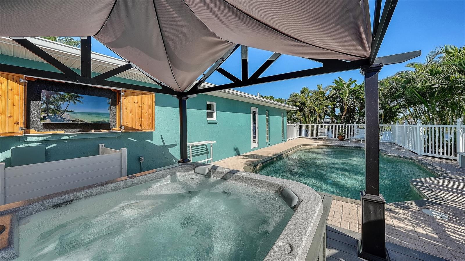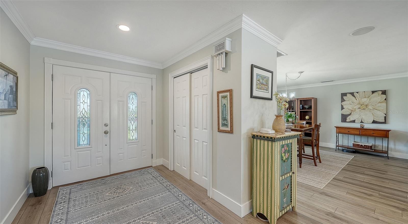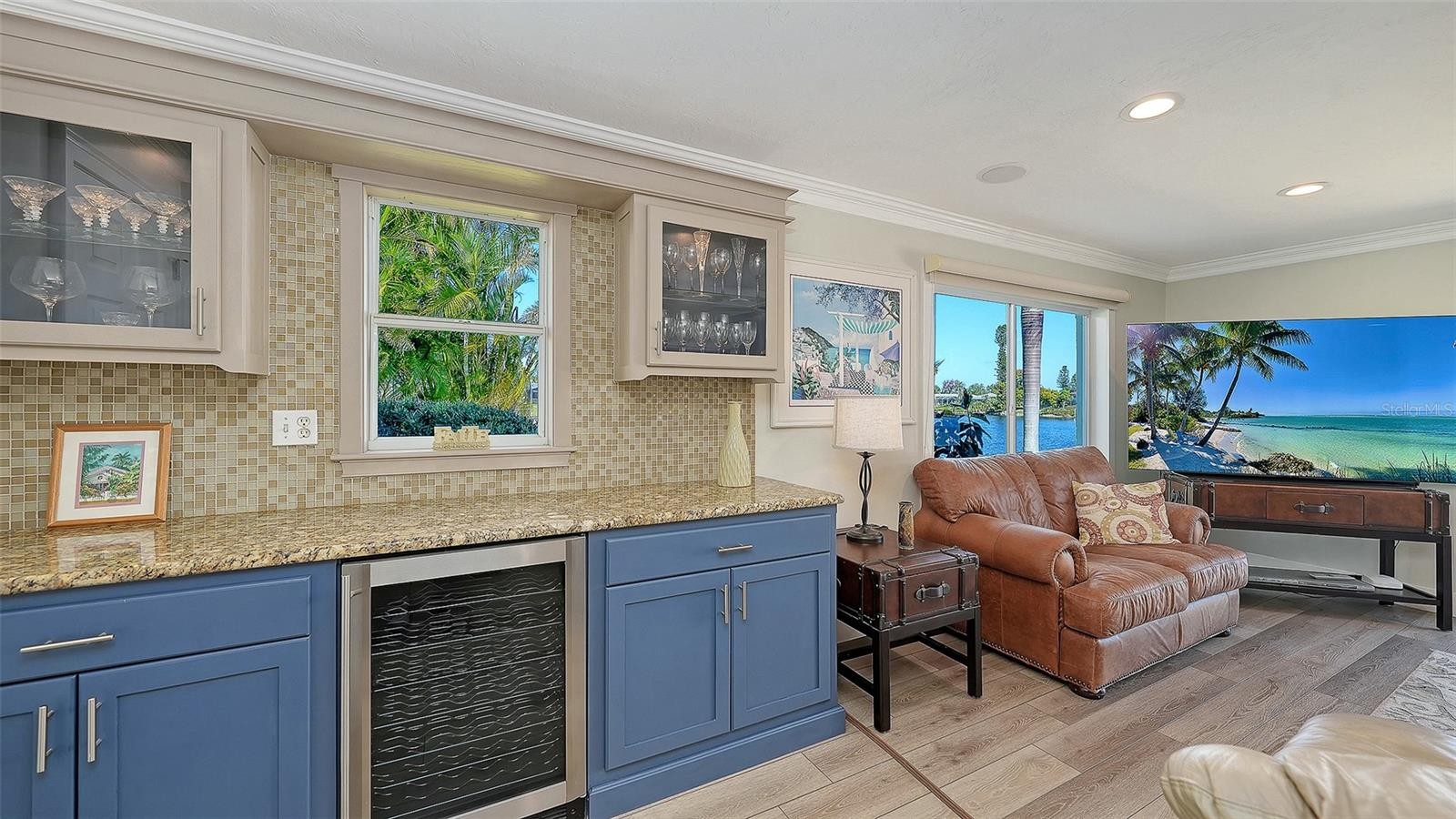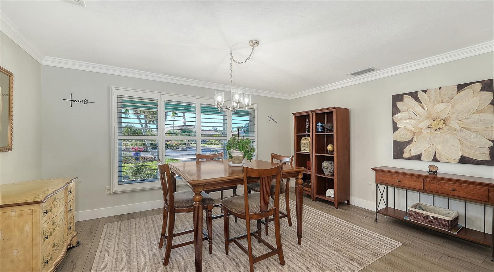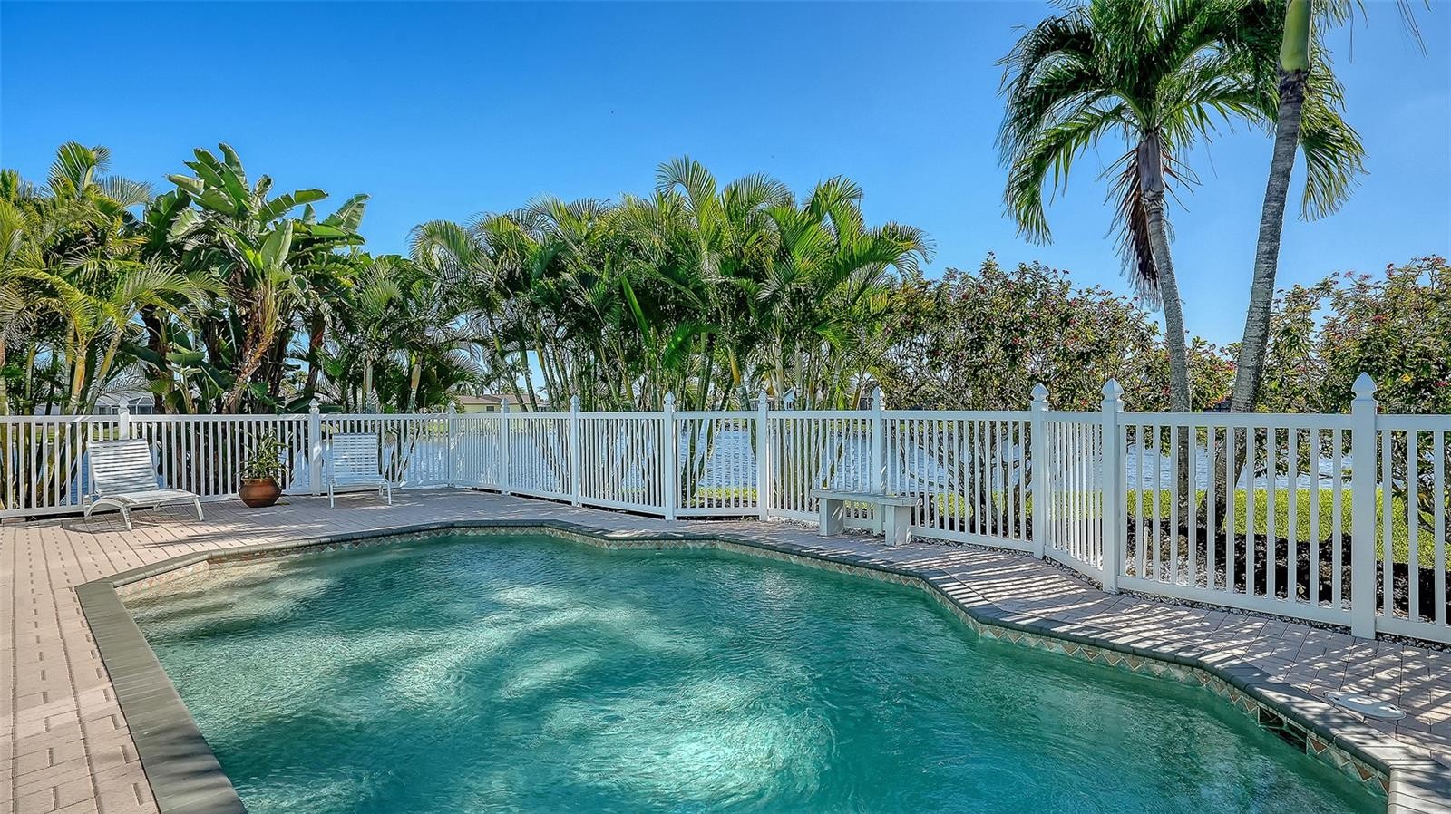 Welcome to Jacaranda West, where this premier peninsula homesite at the end of a quiet cul-de-sac captures 149 feet of shoreline and wide 180-degree open-water views across the broadest stretch of Claw Lake—an outlook that brings light, space, and privacy to everyday living. Claw Lake is spring-fed and winds for more than two miles through the community, bordered by gently curving riprap shoreline. It’s designed for the kind of lake life community actually want: kayaking, canoeing, paddlecraft, sailing, and electric-motor boating are welcome, while combustible engines are prohibited. Whether you enjoy a quiet paddle, casting a line, or simply watching the water change throughout the day, the setting supports it naturally. Inside, the home offers 1,704 square feet of thoughtfully updated, open-concept living with two bedrooms, two baths, and an oversized two-car garage. The interior lives bright and wide, with expansive windows and sliding glass doors that keep the lake present throughout the main living spaces. The result is a seamless relationship between indoors and outdoors—easy for everyday living and equally comfortable for entertaining. Outdoor living has been planned with intention: the 30-by-15-foot pool and heated spa are positioned along the side of the home so they preserve the full sweep of shoreline and water views from the primary rooms. More than 1,000 square feet of brick pavers span the patio and pool deck, creating generous space for dining, lounging, and gathering. At the water’s edge, the 12-by-12-foot dock with railing becomes the natural destination—sunrise coffee, a quiet afternoon, or a glass of wine at sunset as the lake settles into evening. Inside, the layout follows the waterline, keeping the view as the home’s defining feature. As you move through the house, the lake remains the constant backdrop—breathtaking in scale, calming in effect. Satin walls, higher crown molding, and paneled doors and casings provide a finished, cohesive feel that complements the setting without distracting from it. The overall impression is calm, casual elegance. The residence has been comprehensively improved with hand-crafted cabinetry and custom built-ins, granite countertops, and new luxury vinyl flooring—creating a refined yet comfortable environment that is ready to enjoy. Convenience completes the package: approximately 10 minutes to downtown Venice shops and restaurants, 10 to 15 minutes to area beaches, and about five minutes to Jacaranda West Country Club, with additional golf options close by. Recent improvements include a new metal roof, gutters, soffits, and full interior/exterior painting (Jan 2023); a new air-conditioning system with all-new ductwork; a remodeled kitchen; new flooring (Aug 2020); attic insulation upgraded to R-49 (Sep 2022); and a new lake-fed irrigation pump and timer (Sep 2025). If you’ve been waiting for a home where the view truly defines the experience—and where the lake feels like part of daily life—this is one you must see in person.