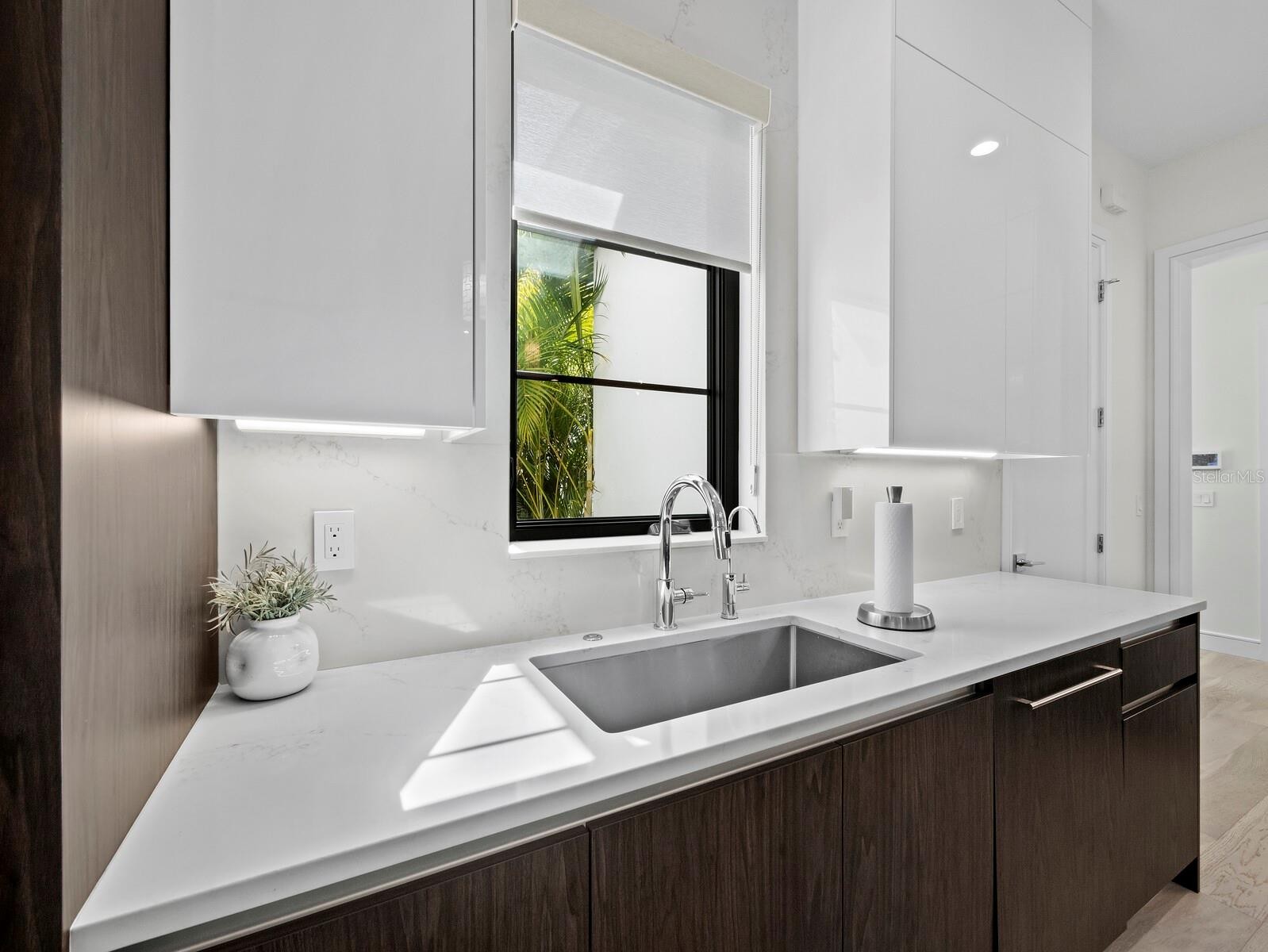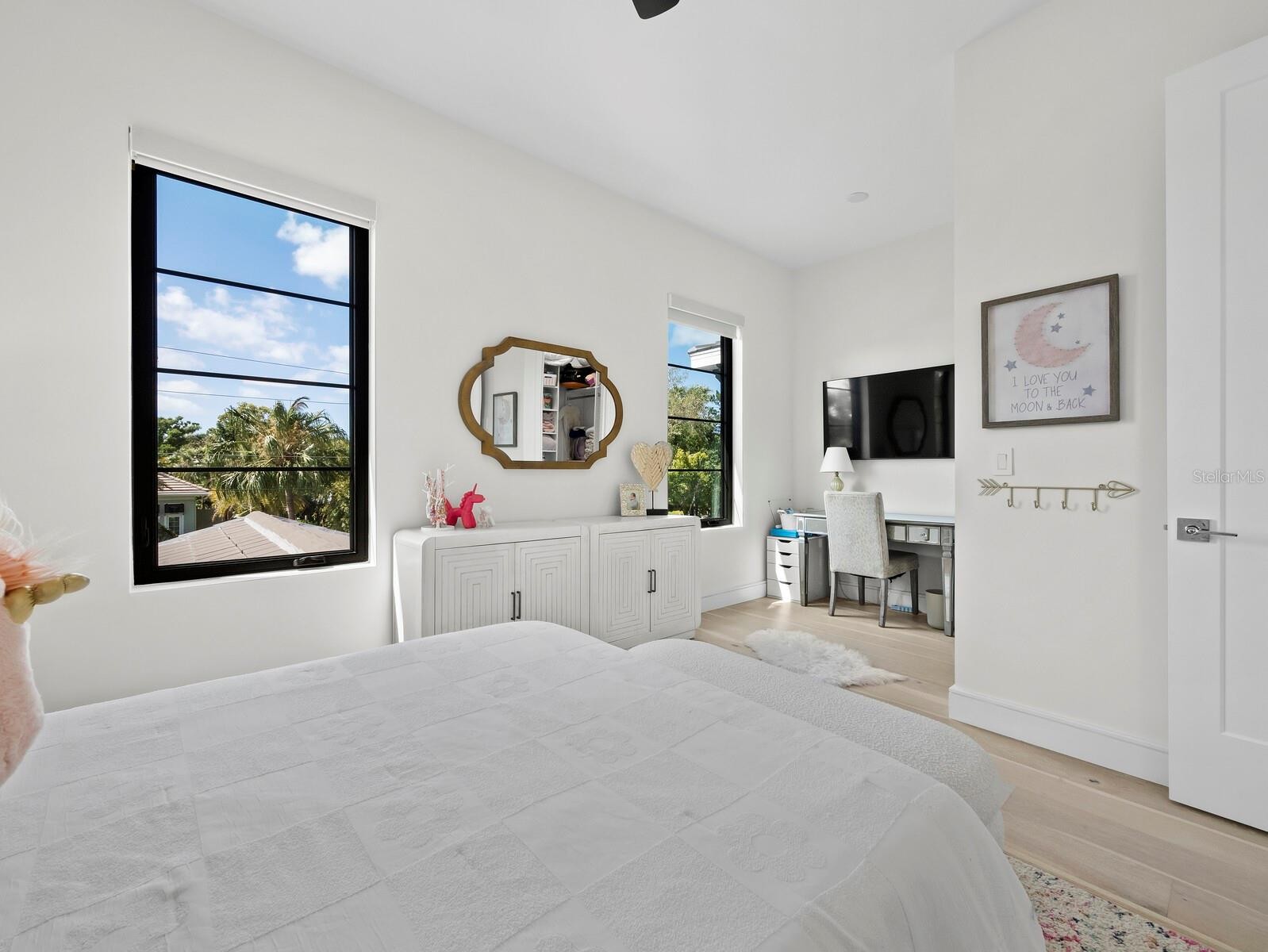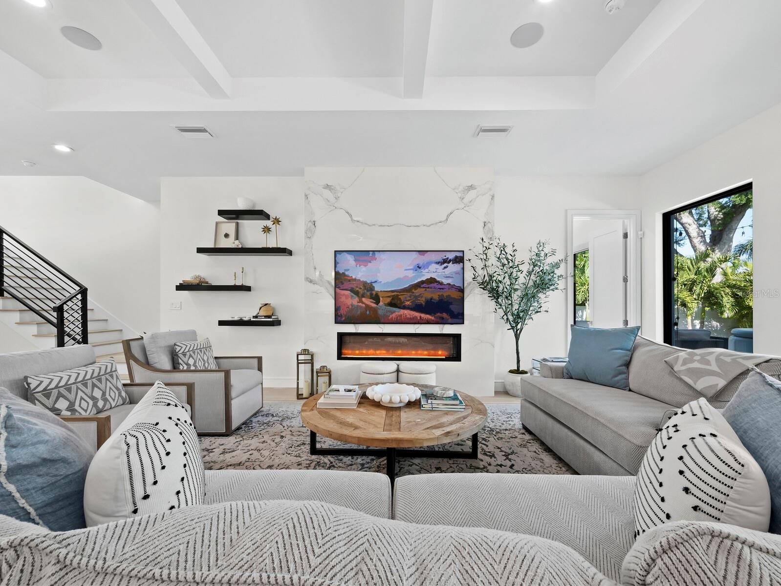 Prime Location in the Hudson Bayou neighborhood. Built in 2023 this home offers 5 Bedrooms, 4.5 bathrooms and designer finishes. The interior features an open floor plan with wide plank wood flooring throughout and impact-rated windows and doors. The great room is anchored by a tray ceiling, custom built-ins, and a marble fireplace feature wall. The kitchen is designed for both everyday living and entertaining, offering Viking appliances, a dual fuel range, built-in refrigerator, custom cabinetry, quartz countertops, and a walk-in pantry. A dedicated wine room is located just off the kitchen. The primary suite is positioned on the first floor with direct access to the lanai, two custom walk-in closets, and a well-appointed bathroom with dual vanities, soaking tub, and frameless glass shower. The main level also includes a flexible office or guest suite with a full bath, along with a spacious laundry room. Outdoor living is fully integrated with a covered lanai featuring a complete outdoor kitchen with gas grill, vent hood, sink, and refrigerator, along with electric screens. The heated saltwater pool and spa are finished in PebbleTec and complemented by a gas fire feature, updated landscaping for privacy, and an outdoor shower. Upstairs includes three additional bedrooms, all with walk-in closets, two full bathrooms, and a loft space. Additional features include Sonos audio on the main level and natural gas generator. Located within the Southside Elementary school district, with a neighborhood park nearby. Downtown Sarasota, the Bayfront, Marie Selby Botanical Gardens, and Southside Village are all just minutes away, with convenient access to the Lido Key and Siesta beaches.