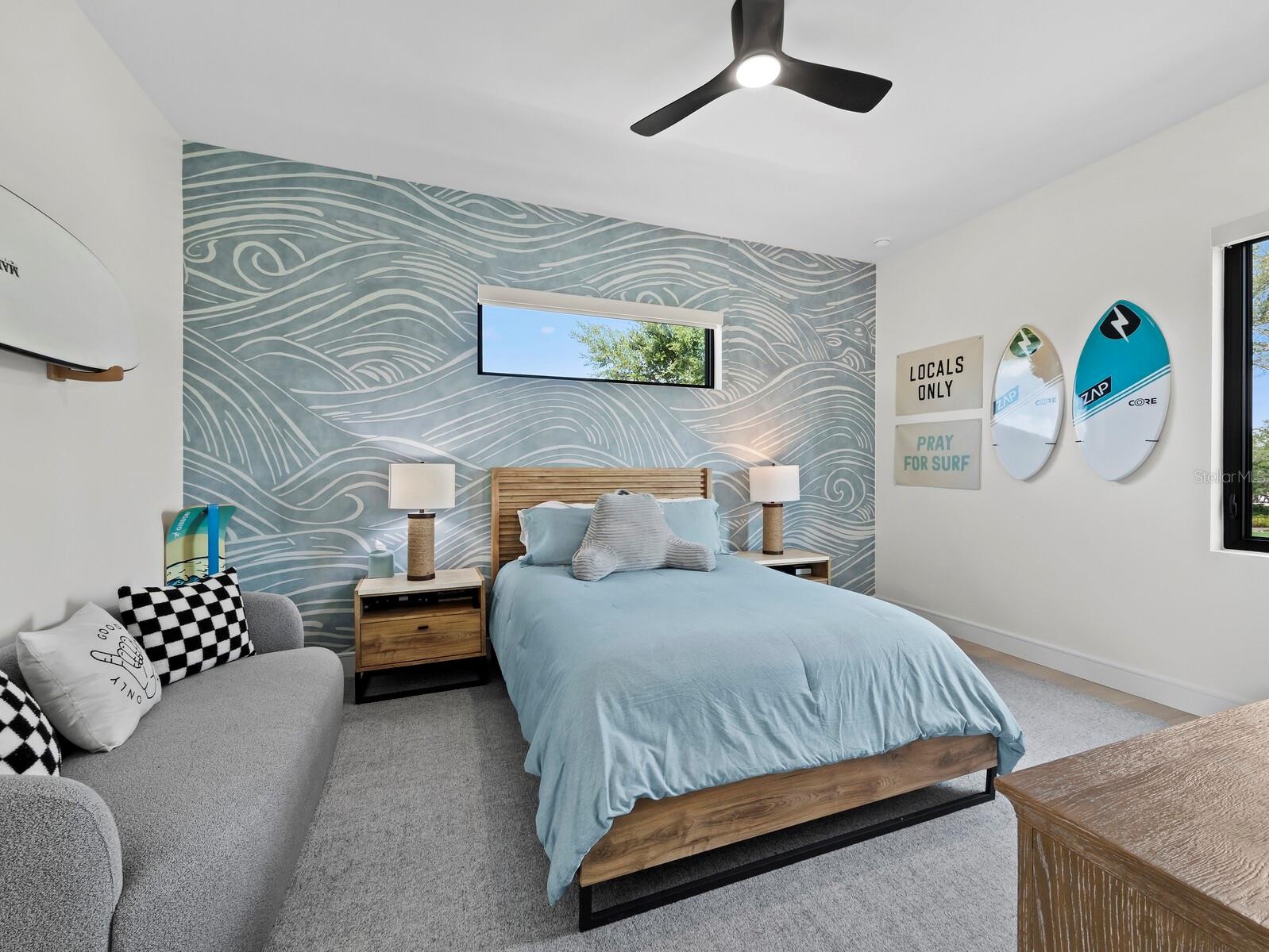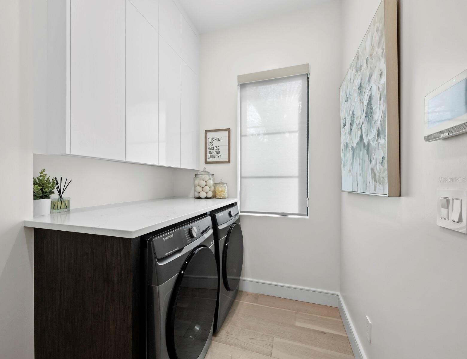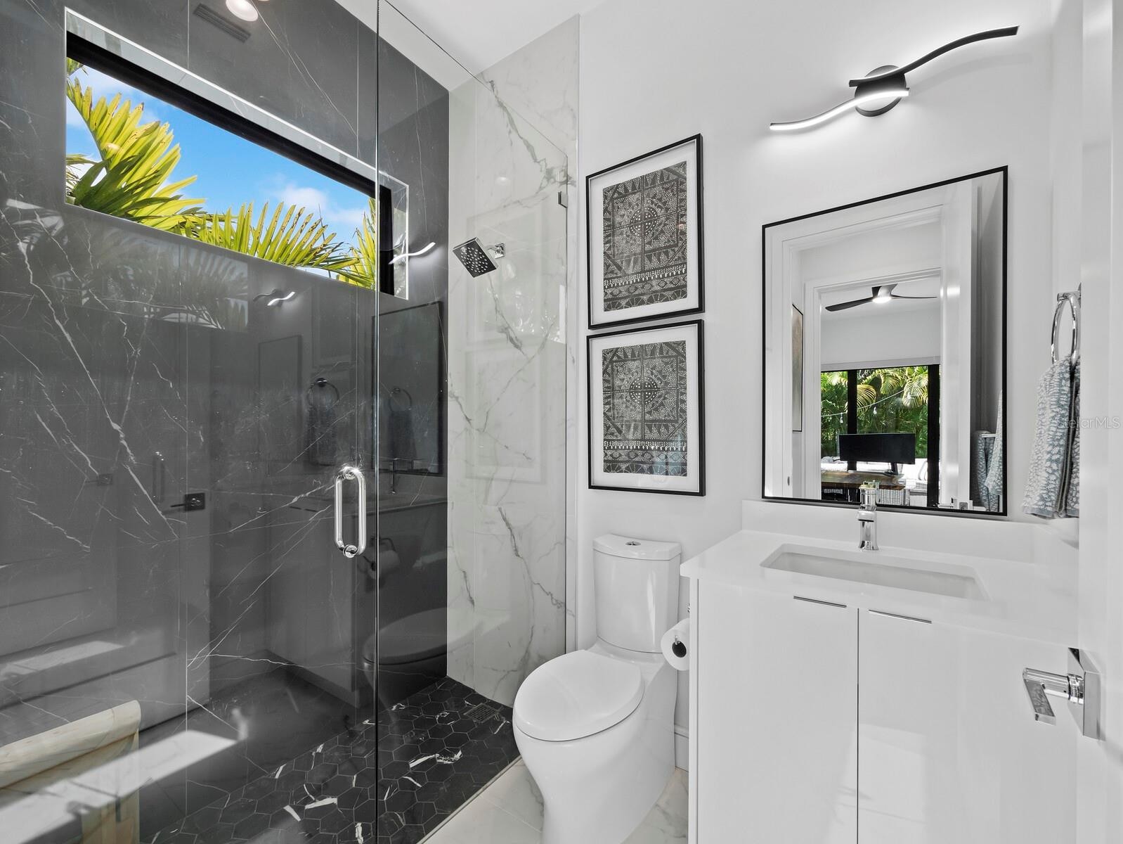 Prime Location in the Hudson Bayou neighborhood. Built in 2023 this home offers 5 Bedrooms, 4.5 bathrooms and designer finishes. The interior features an open floor plan with wide plank wood flooring throughout and impact-rated windows and doors. The great room is anchored by a tray ceiling, custom built-ins, and a marble fireplace feature wall. The kitchen is designed for both everyday living and entertaining, offering Viking appliances, a dual fuel range, built-in refrigerator, custom cabinetry, quartz countertops, and a walk-in pantry. A dedicated wine room is located just off the kitchen. The primary suite is positioned on the first floor with direct access to the lanai, two custom walk-in closets, and a well-appointed bathroom with dual vanities, soaking tub, and frameless glass shower. The main level also includes a flexible office or guest suite with a full bath, along with a spacious laundry room. Outdoor living is fully integrated with a covered lanai featuring a complete outdoor kitchen with gas grill, vent hood, sink, and refrigerator, along with electric screens. The heated saltwater pool and spa are finished in PebbleTec and complemented by a gas fire feature, updated landscaping for privacy, and an outdoor shower. Upstairs includes three additional bedrooms, all with walk-in closets, two full bathrooms, and a loft space. Additional features include Sonos audio on the main level and natural gas generator. Located within the Southside Elementary school district, with a neighborhood park nearby. Downtown Sarasota, the Bayfront, Marie Selby Botanical Gardens, and Southside Village are all just minutes away, with convenient access to the Lido Key and Siesta beaches.