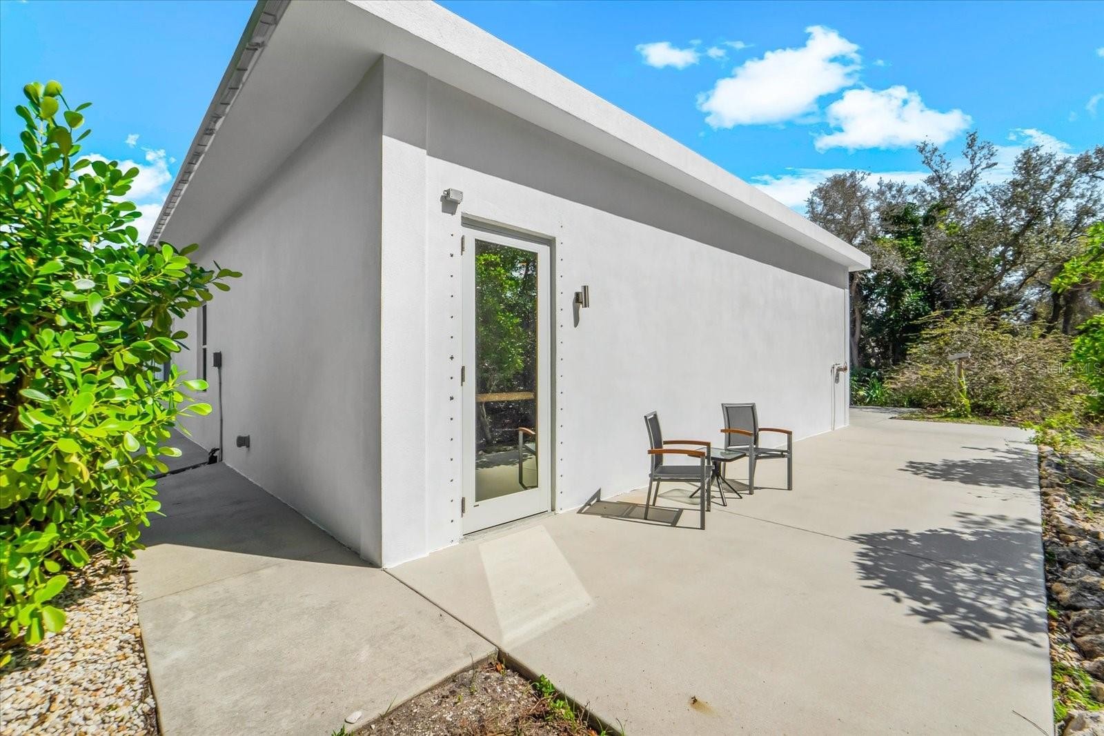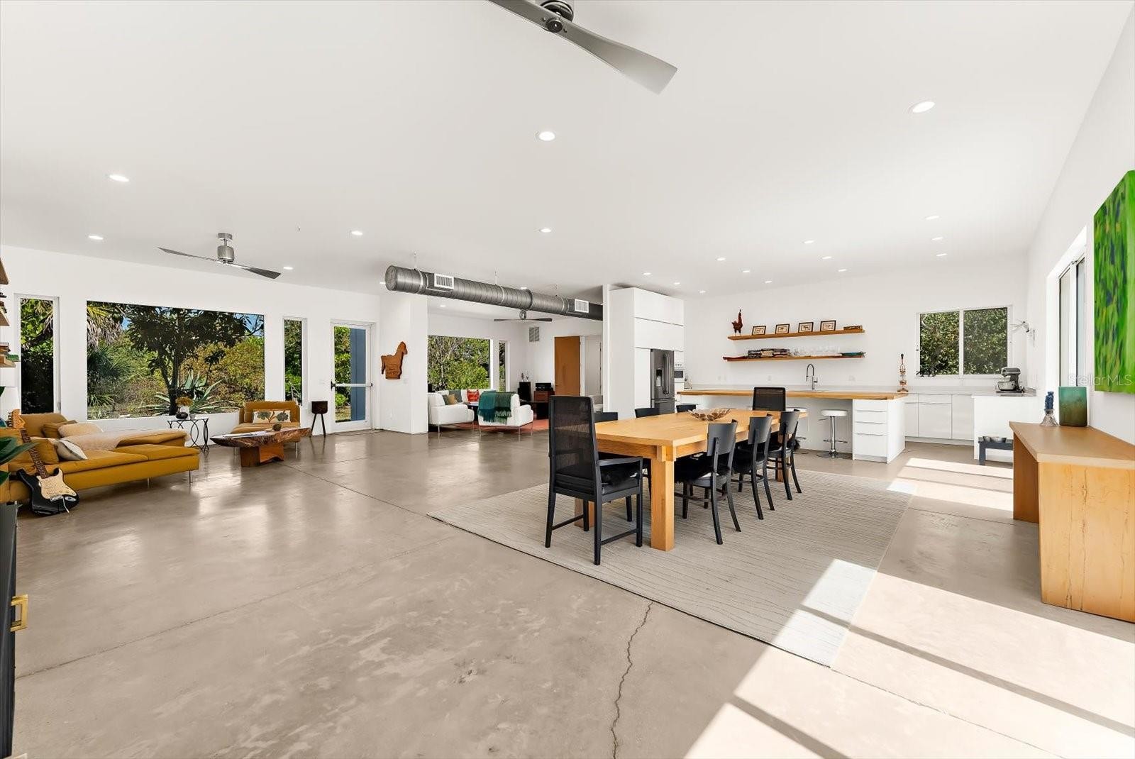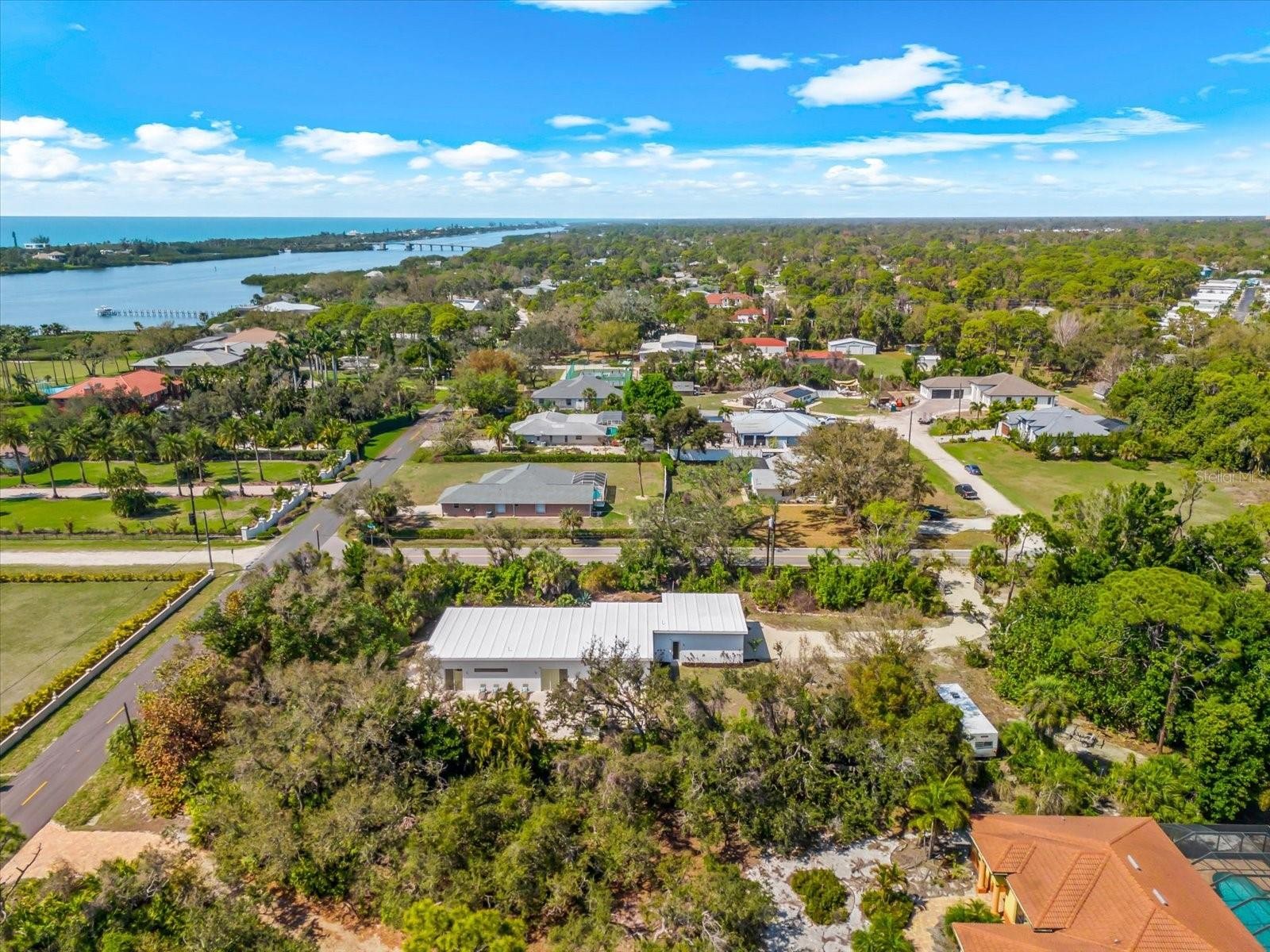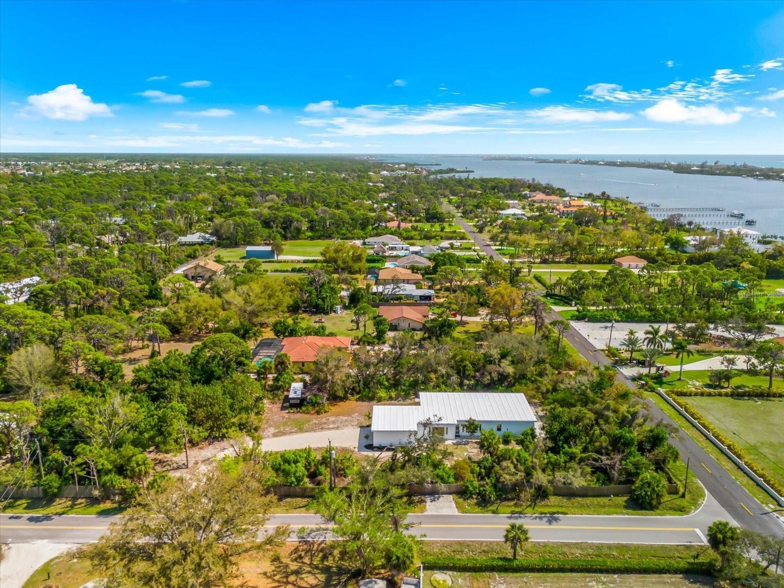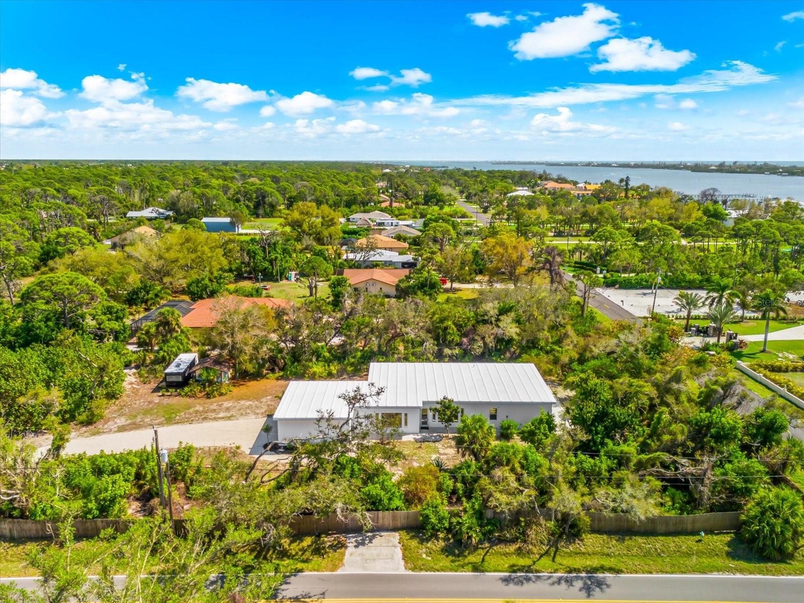 Private. Custom. Energy-Efficient. Low-Maintenance. Built with Strength. This one-of-a-kind residence blends solid concrete construction (including the roof) with open, light-filled living. Set on 1.3 acres just minutes from Manasota Beach, with the Intracoastal Waterway across the street, the property offers a rare mix of seclusion, durability, and coastal convenience. The 3-bedroom, 3-bath home spans 2,887 sq ft and showcases polished concrete floors, high ceilings, exposed ductwork, clean architectural lines, and oversized windows that frame the surrounding natural landscape. The open-concept kitchen features a 100+ year-old maple island, modern cabinetry, and stainless steel appliances, flowing seamlessly into expansive living and dining areas ideal for entertaining or everyday living. Sliding glass doors open to a wide outdoor patio, extending the living space into the serene setting. Thoughtfully designed native Florida landscaping complements the green roof and concrete design, supporting natural cooling, efficient drainage, and low-maintenance living. Designed with a resort-style pool in mind beyond the patio, the property presents a rare opportunity to craft a truly private outdoor retreat. Enjoy the convenience of a short bike or golf-cart ride over the bridge to Manasota Beach, with the option to join the Englewood Gardens Beach Club, offering private beach access, dedicated parking, and a calendar of social events. This exceptional home is a must-see to truly appreciate.