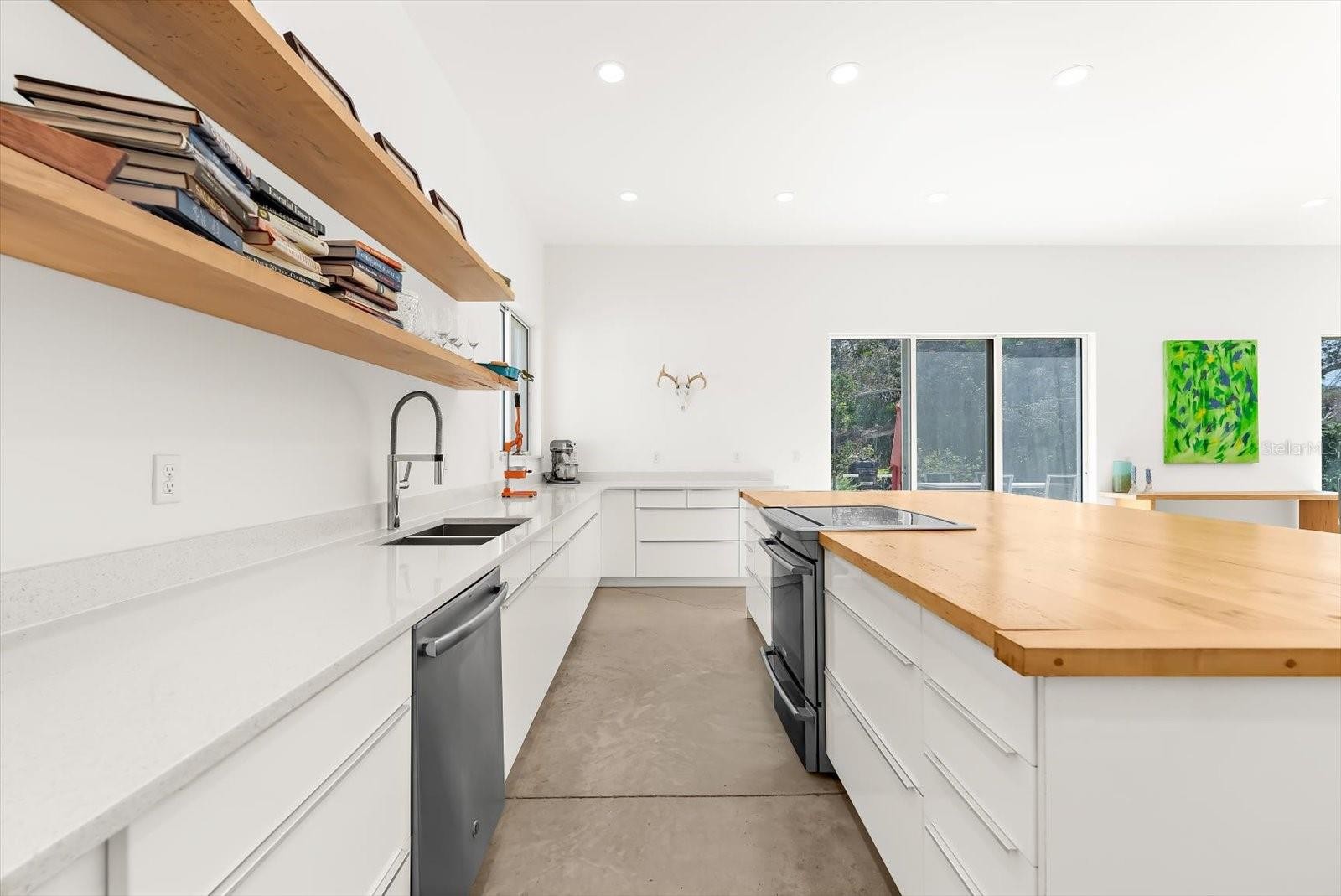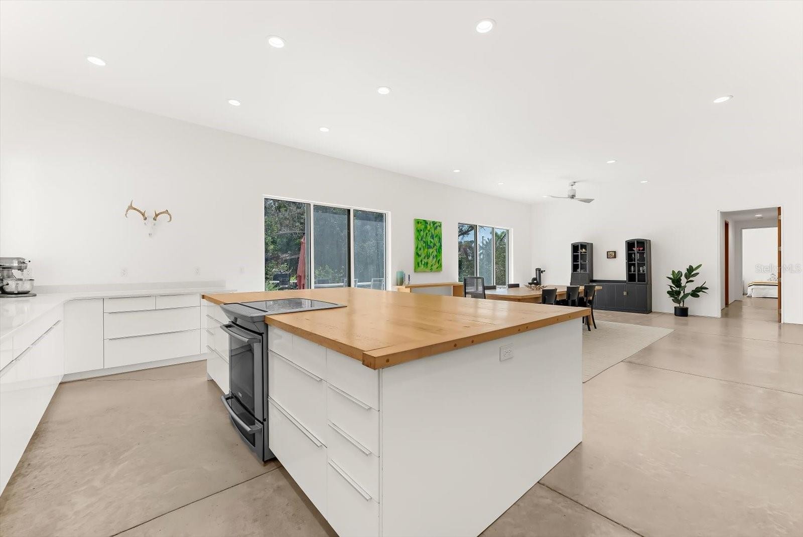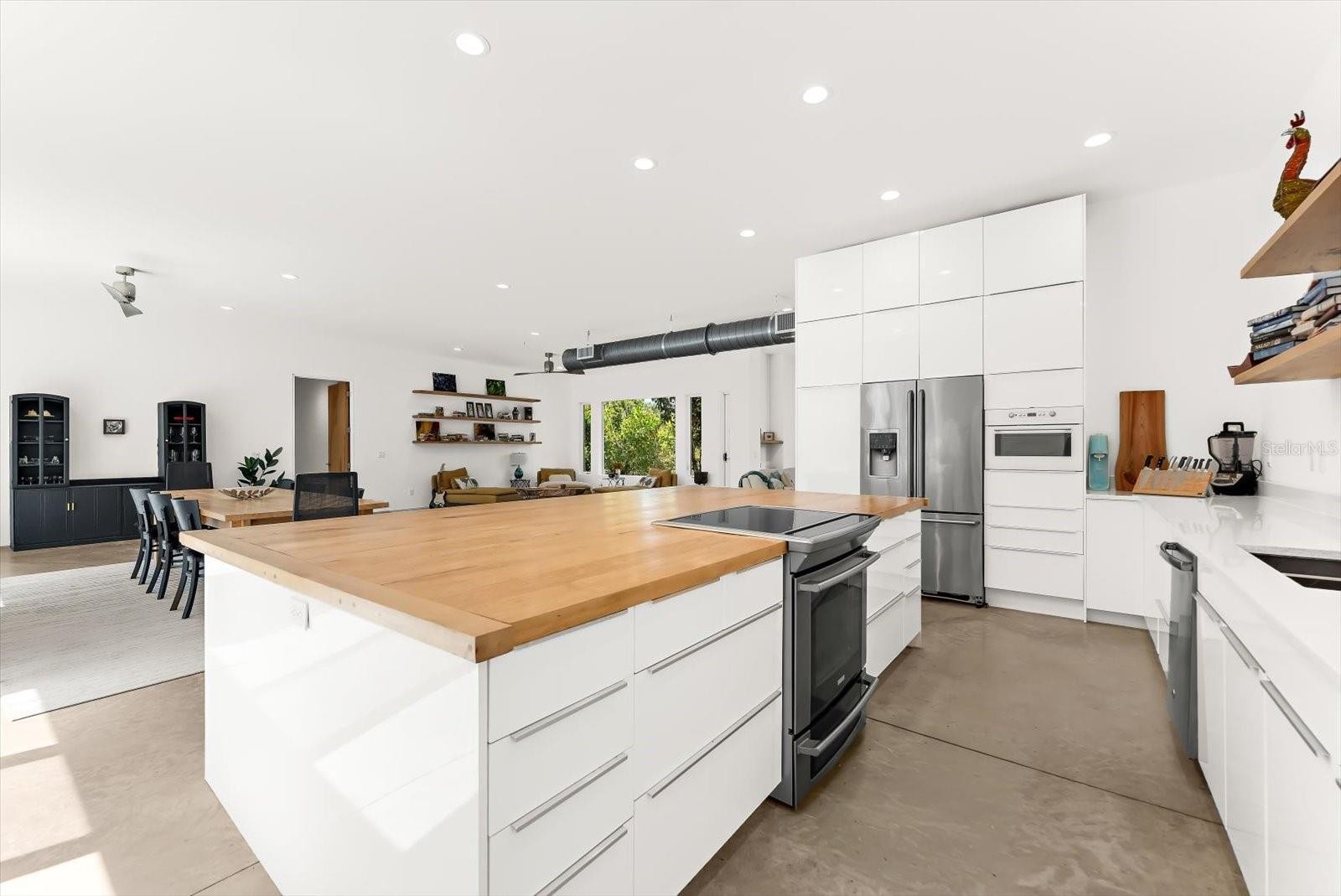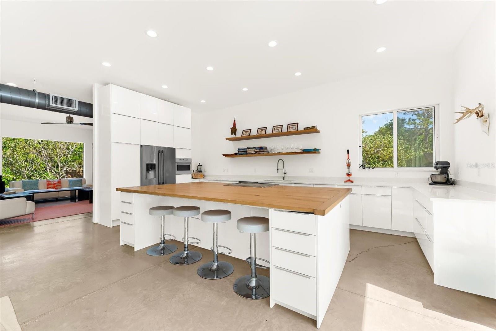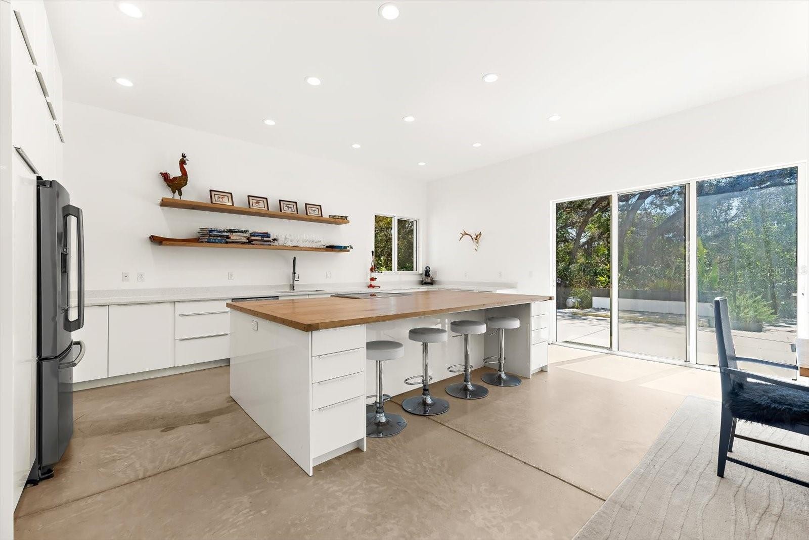 Private. Custom. Energy-Efficient. Low-Maintenance. Built with Strength. This one-of-a-kind residence blends solid concrete construction (including the roof) with open, light-filled living. Set on 1.3 acres just minutes from Manasota Beach, with the Intracoastal Waterway across the street, the property offers a rare mix of seclusion, durability, and coastal convenience. The 3-bedroom, 3-bath home spans 2,887 sq ft and showcases polished concrete floors, high ceilings, exposed ductwork, clean architectural lines, and oversized windows that frame the surrounding natural landscape. The open-concept kitchen features a 100+ year-old maple island, modern cabinetry, and stainless steel appliances, flowing seamlessly into expansive living and dining areas ideal for entertaining or everyday living. Sliding glass doors open to a wide outdoor patio, extending the living space into the serene setting. Thoughtfully designed native Florida landscaping complements the green roof and concrete design, supporting natural cooling, efficient drainage, and low-maintenance living. Designed with a resort-style pool in mind beyond the patio, the property presents a rare opportunity to craft a truly private outdoor retreat. Enjoy the convenience of a short bike or golf-cart ride over the bridge to Manasota Beach, with the option to join the Englewood Gardens Beach Club, offering private beach access, dedicated parking, and a calendar of social events. This exceptional home is a must-see to truly appreciate.