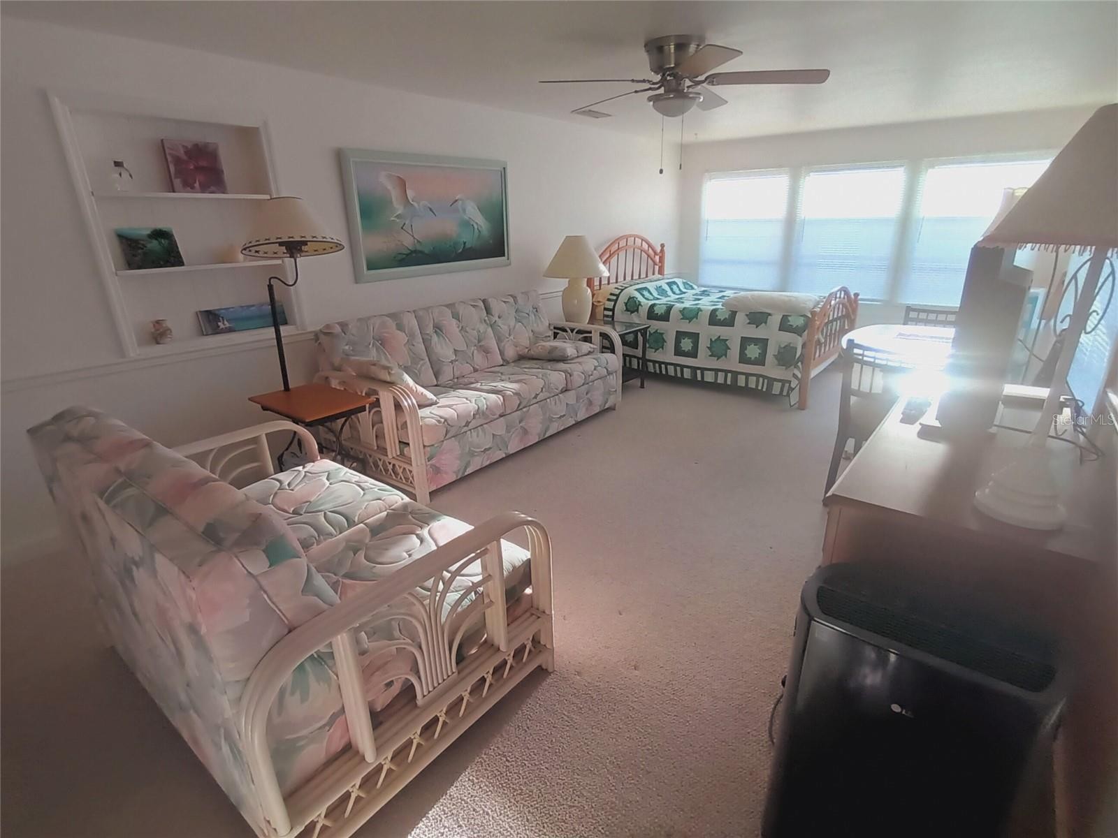 This fully furnished, double-wide home features 2 bedrooms and 2 bathrooms, having undergone a complete rebuild in 1985. Although tax records list its size as 624 square feet, the actual living space is about 984 square feet under air, including a combined living and dining area plus a spacious bonus or family room where the laundry is conveniently situated inside. The house offers several recent upgrades, such as a 2023 AC unit with ceiling registers for better cooling, a 2022 membrane roof, vinyl siding, and an attached shed for ample storage. Tri-par Estates provides a wealth of amenities: enjoy a heated and cooled large pool for year-round swimming, a brand-new spa, tiki hut, pickleball courts, fitness center, shuffleboard, miniature golf, horseshoes, and various recreation hall rooms equipped with ping-pong, billiards, card tables, a kitchenette, sewing areas, and more. The expansive clubhouse regularly hosts dinners, dances, and other events. Situated only minutes from downtown Sarasota, you’ll have easy access to marinas, shopping, restaurants, museums, the world-renowned Siesta Key and Lido Key beaches, and Sarasota airport. In this special park and recreation district, residents own their land directly, with no separate HOA fees—an annual fee of $1,648 is included in your property taxes. This is also a golf cart-friendly community with optional RV or boat storage when available. Don’t miss the opportunity to join this lively, well-established neighborhood.