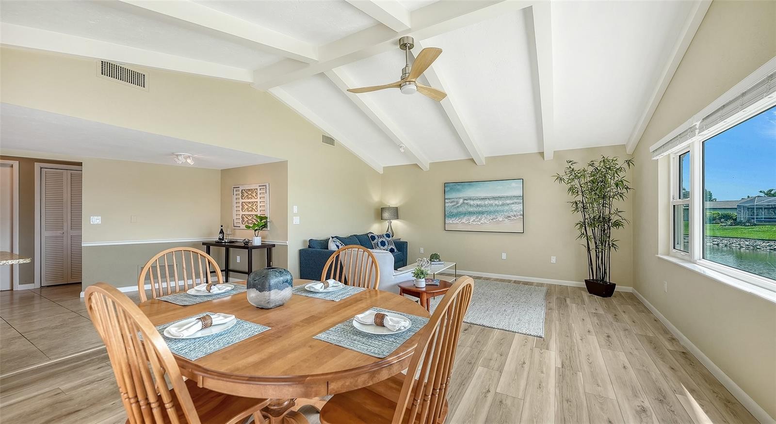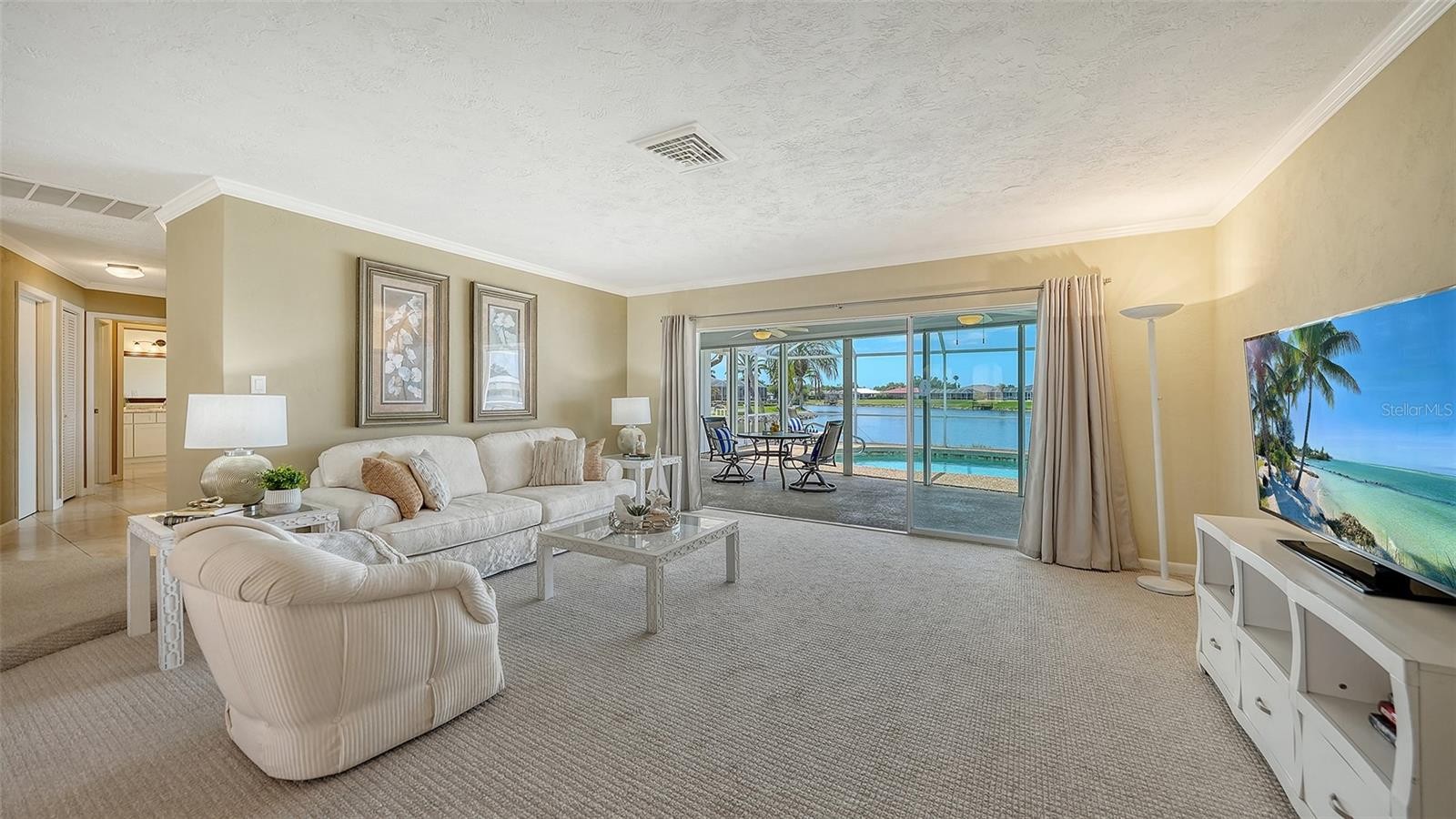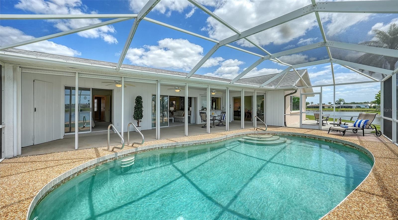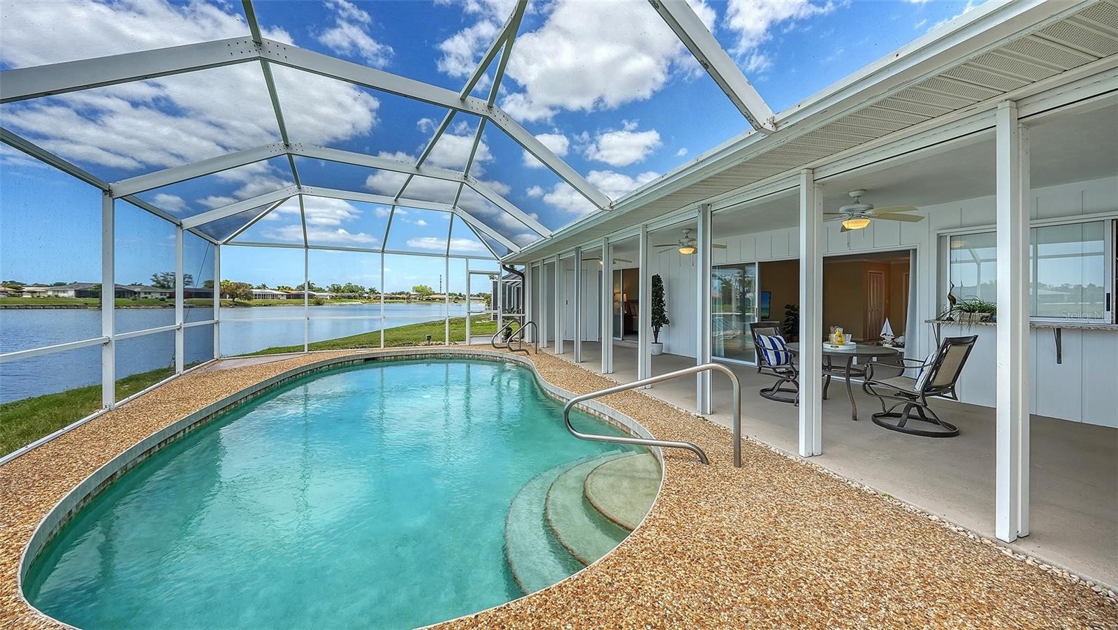Discover the sweeping, breathtaking, views of Claw Lake featuring idyllic and vibrant sunsets. Desirable .23 acre lot, at the end of a cul-de-sac, offers tranquility and privacy in the well-established community of Jacaranda West. This comfortably designed home provides a split-plan, spacious living areas, and dual sliding doors leading to the sizable 37-by-32 foot, covered lanai. A pass-through from the kitchen enhances entertaining poolside as you enjoy the 30-by-16 foot, heated, screen-enclosed pool year-round or dine al fresco on the paved patio, should you desire. The gourmet kitchen boasts wood cabinetry, 2 built-in pantries, granite countertops, stainless appliances, and a breakfast bar. Natural light abounds throughout the family room through three large, impact, windows and dances across the vaulted ceiling. Freshly painted primary bedroom and closet, guest bedroom, and guest bathroom. Home has been replumbed. The electrical panel and duct work have been replaced. Electric hurricane shutters for lanai provide peace of mind. The Irrigation system keeps the lawn and landscaping looking lush, the pump was replaced only 2 years ago. This exquisite home harmonizes with its surroundings and is ideally close to beautiful beaches, dining options, shopping, Legacy Trail, and Jacaranda West Golf and Country Club. Benefit from the low HOA fees, No CDD fees, and convenient location to all the best that the West Coast of Florida has to share!