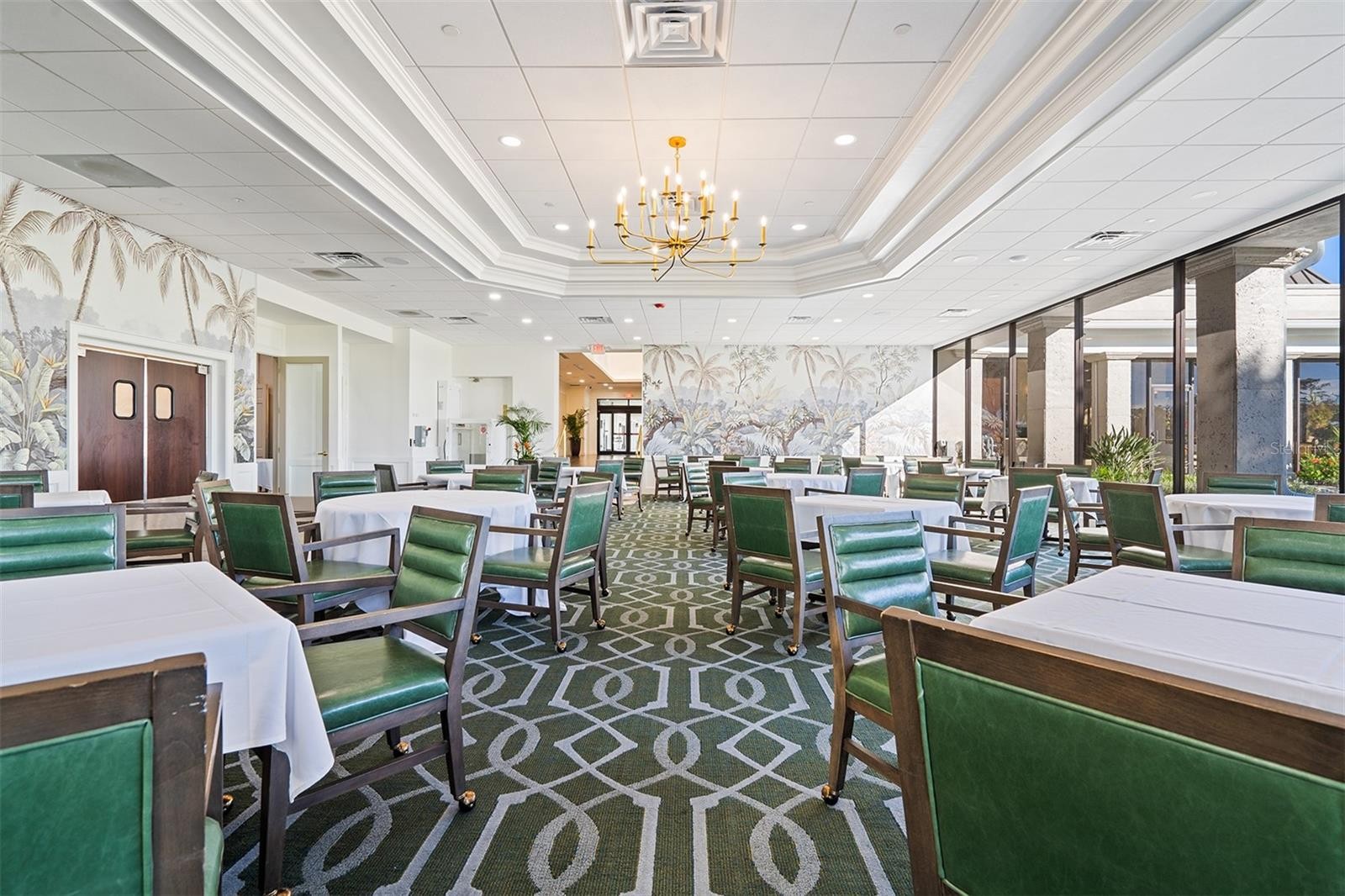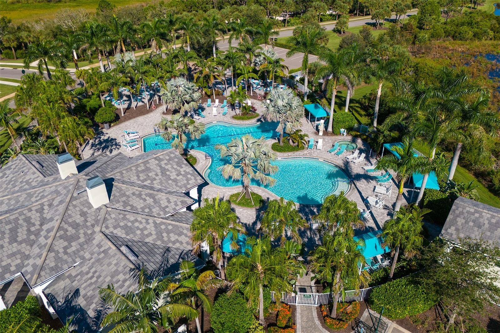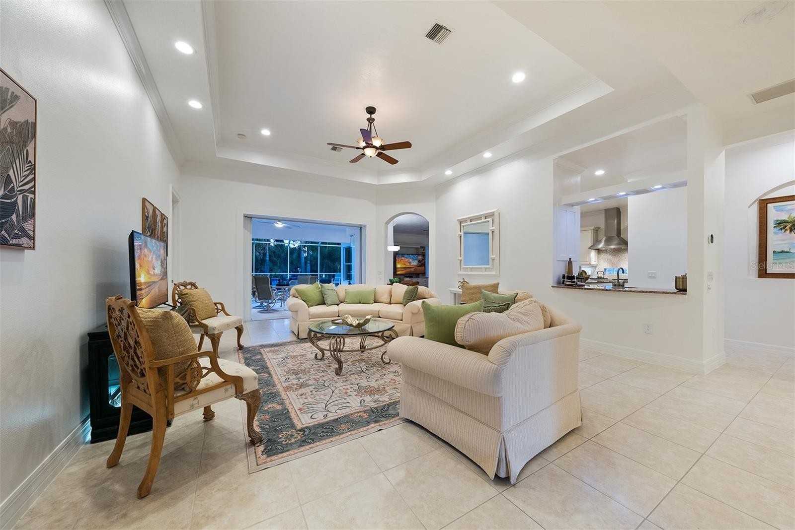 Low-maintenance, country club home with a private setting! Over 3,000 square feet of living area, including three bedrooms plus office, three and a half baths and an oversized garage with rear golf cart entrance. The leaded double doors open to the grand living room and dining room with high tray ceiling, moldings and a built-in wet bar. Bright and airy as you gaze through the 10-foot vanishing pocket sliders to the secluded travertine lanai, pool/spa area and a greenbelt view with no homes in sight. The beautiful kitchen has everything you could want, including an island with granite countertop, custom lighting, gas range, built-in ovens and a breakfast nook with aquarium windows and wide-open views. The family/kitchen room allows for even more space for family and friends. Beyond the family room is the conservatory/office with plenty of natural light and more views. The enlarged primary suite includes another large aquarium window, walk-in closets, tray ceilings and a private door to the pool and Jacuzzi. The primary bath has a soaking tub, Roman shower, marble countertops, dual sinks and makeup vanity. Each bedroom has its bath and large closets. Play golf, pickleball, tennis, enjoy fitness or just collect seashells on the beach. Soon Boca Royale’s gates will open in Wellen Park for dining, shopping and the ballpark! This neighborhood is a place you make friends, entertain or just meet at the club for dinner or a glass of wine. Are you ready?