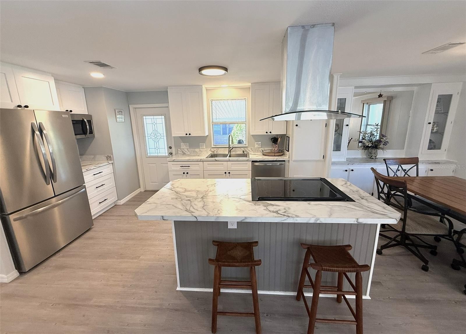 Welcome to this beautifully updated 2 bedroom, 2 bathroom manufactured home located in the highly sought-after, land-owned, pet-friendly community of Harbor Isles. Designed with a sleek, modern open-concept layout, this home offers both style and comfort. The recently renovated kitchen is the centerpiece of the home, featuring stainless steel appliances, a spacious cooking island with an eye-catching range hood, and an abundance of solid wood shaker cabinetry for exceptional storage. New plywood subfloors and luxury vinyl plank flooring run throughout, providing durability and a clean, cohesive look. Both bathrooms have been tastefully updated with new showers and toilets, with the guest bath showcasing a modern vanity. Each bedroom includes a walk-in closet, offering generous storage. Updated black hardware throughout the home adds a refined, contemporary touch. The newly added Florida room is light and inviting, with large glass windows that fill the space with natural light. Additional improvements include a newly built solid wood carport and a 2023 roof , offering peace of mind for years to come. Harbor Isles is a gated, active 55+ waterfront community located along the Myakka River and offers an impressive array of amenities, including a heated resort-style pool and spa, fitness center, tennis and pickleball courts, bocce ball, shuffleboard, and a full social calendar. The private marina offers boat slips on a first-come basis with access to the Gulf of Mexico, ideal for boating enthusiasts. Conveniently located near shopping, dining, entertainment, and some of Florida’s most beautiful beaches, this home offers the best of Florida living.