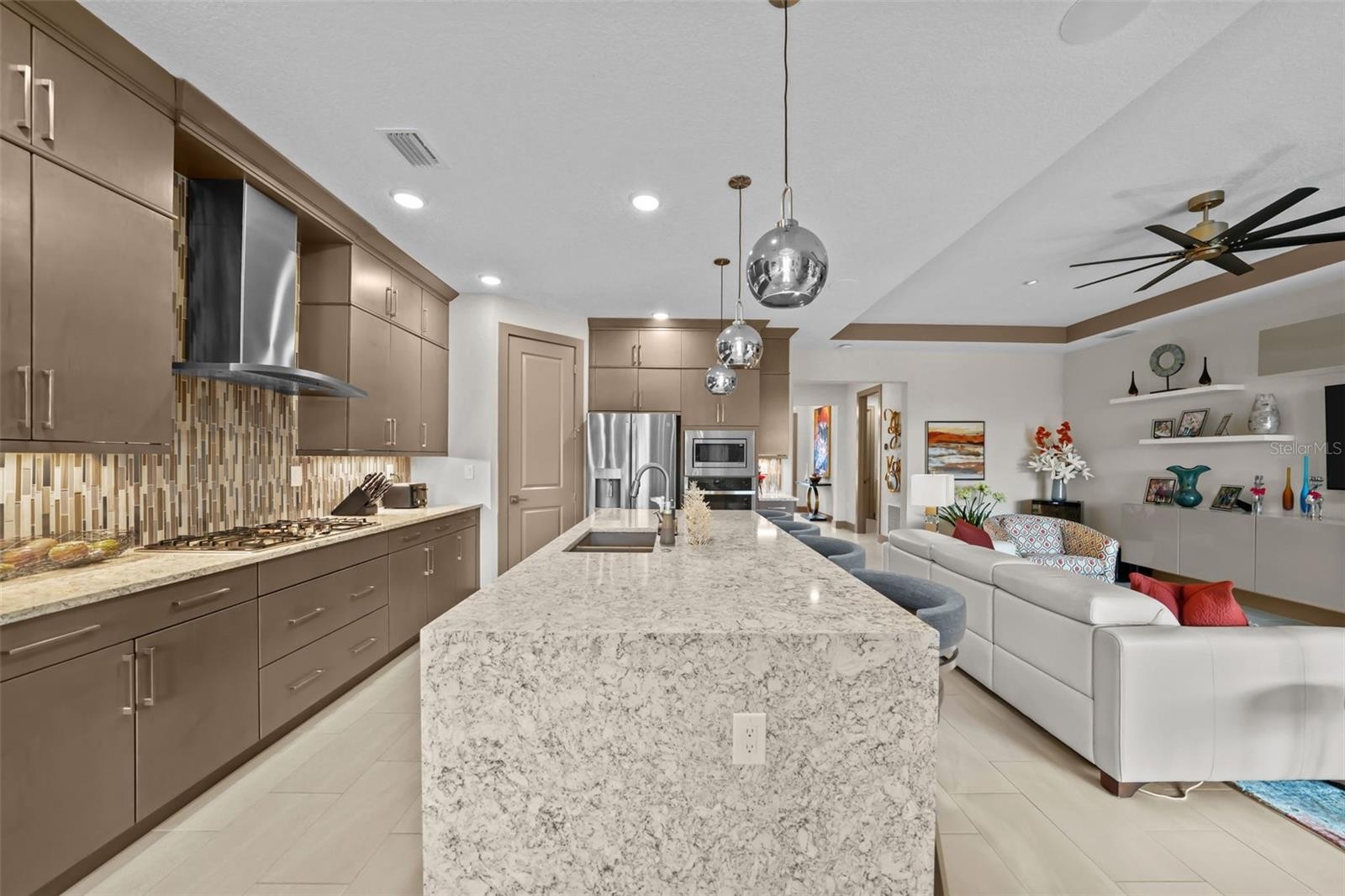 This stunning home, located in a vibrant 55+ community, boasts upgrades at every turn. Step outside to discover an expansive outdoor kitchen, perfect for entertaining, overlooking a luxurious pool and an extended caged lanai, offering the ultimate in outdoor living. The home features a bright and airy open floor plan, with a thoughtfully designed split layout that provides both privacy and spaciousness. Inside, the gourmet kitchen will inspire the chef in you with soft-close cabinetry, gas cooktop, stainless appliances, while the oversized island with a waterfall edge serves a stunning centerpiece, all open to the casual dining area and family room. The whole house has porcelain tile, 8’ solid core doors, custom trim package, upgraded lighting with dimmer switches, custom closets and window treatments. The owner’s suite features double vanities, frameless shower with seat, designer cabinetry and upgraded plumbing fixtures. You also enjoy access to a resident-exclusive clubhouse that features outdoor amenities including pickleball & tennis courts; a dog park with large & small breed sections; wide, lit walkways; resort-style pool and spa; resistance pool; event plaza with food court truck; bocce courts and outdoor social areas. The Cresswind SmartFIT Training Center is powered by EGYM and uses state-of-the-art fitness technology. The full-time Lifestyle Director keeps the social and event calendar full of activities designed for the 55 + lifestyle. This home is the epitome of modern comfort and style, with every detail meticulously designed to create a serene and inviting atmosphere.