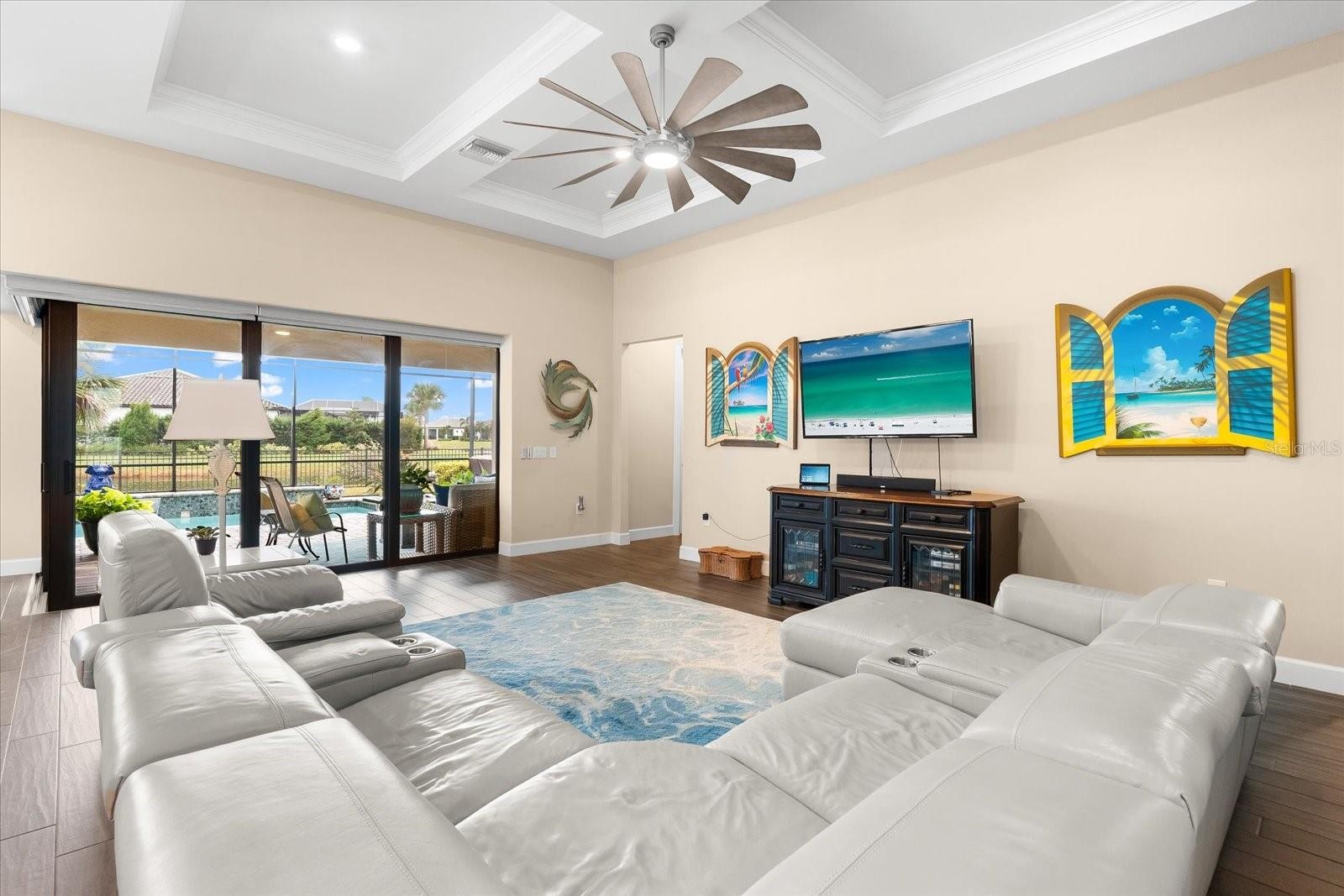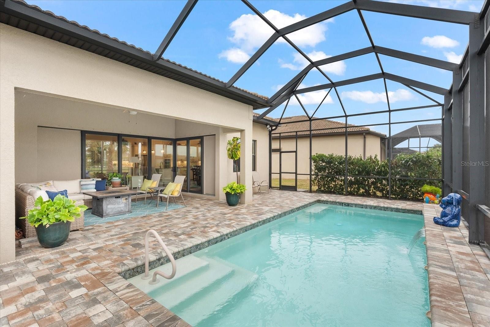 Welcome to the Pinnacle of Perfection. Prepare to be impressed by this remarkable Pinnacle Model, beautifully positioned on a tranquil water view lot within the highly coveted Del Webb 55+ community in Lakewood Ranch. Designed for refined Florida living, this exceptional residence seamlessly blends classic elegance with modern upgrades, offering both stye and everyday functionality. Featuring 3 bedrooms, 3 bathrooms, a private den, and a thoughtfully crafted open layout, this home is ideal for entertaining guests or enjoying relaxed daily living Designer details abound, including Plantation shutters, a tray ceiling in the owner’s suite, a striking coffered ceiling in the gathering room, and contemporary lighting and ceiling fans throughout. At the heart of the home, the expansive gathering room flows effortlessly into a chef-inspired gourmet kitchen. This show-stopping space highlights a large island with seating for four, stylish pendant lighting,42” cabinetry, quartz countertops, a granite sink, designer backsplash, gas cooktop, and a statement wood hood—perfect for both casual meals and entertaining. Throughout the main living areas, medium-toned plank tile flooring creates warmth and continuity, while plush carpeting in the bedrooms and large- format tile in the owner’s bath add comfort and elegance. Open the zero-corner sliding glass doors to discover an inviting, covered extended lanai---your private outdoor retreat. Enjoy a heated pool with a soothing waterfall, peaceful water views, and a fenced yard ideal for pets, creating the ultimate outdoor lifestyle. The expansive owner’s suite offers a serene escape with space for a sitting area and a spa-like ensuite featuring dual vanities, a spacious walk-in shower, and a custom walk-in closet with drawers, shelving, and abundant hanging space. Two additional guest bedrooms—one with its own ensuite—provide comfort and privacy for visitors. The versatile den easily adapts to your lifestyle, whether as a home office, gym, hobby room, or creative space. This home is loaded with premium upgrades, including a whole-home generator, double-pane windows, 4-foot garage extension with epoxy coated flooring, and convenient attic storage with pull-down access. Opportunities like this are rare. Don’t miss your chance to own this exceptional Pinnacle Model in Del Webb. Schedule your private showing today and experience luxury living at its finest.
