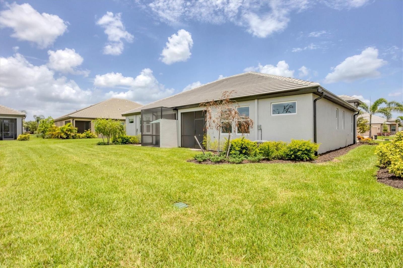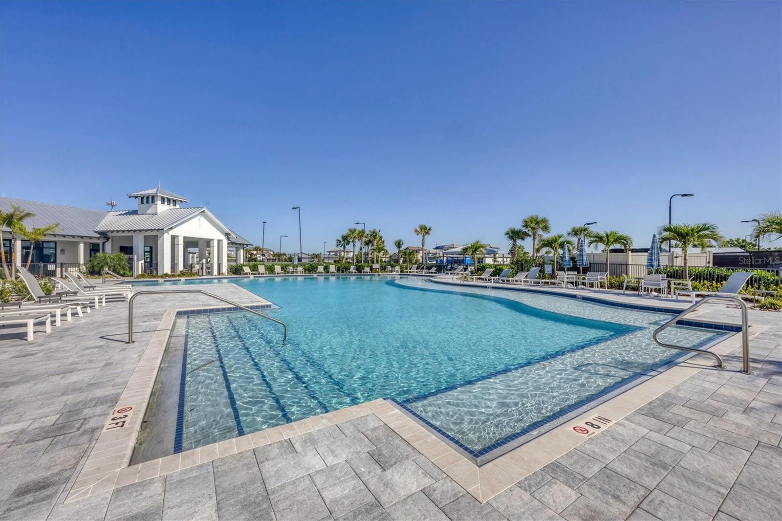 One or more photo(s) has been virtually staged. Why wait to build when you can move right into this new, never-lived-in Emerald model by M/I Homes? Enjoy serene, long water views from this beautifully designed maintenance-free villa near the Sweetwater Villas amenity center and pool. This thoughtfully laid-out home features two bedrooms plus a versatile den with double doors, ideal as a home office, guest room or hobby space. The open-concept floor plan flows seamlessly from the spacious great room to the paver, screened lanai overlooking the lake, an ideal setting for relaxing or entertaining. Inside, you'll find neutral tile flooring throughout, bright white paint and an elegant kitchen featuring white cabinetry, new stainless steel appliances, quartz countertops, a breakfast bar and a sleek glossy white backsplash. The primary suite offers peaceful lake views, a large walk-in closet, and an en-suite bath with dual sinks, quartz counters, white cabinetry and a walk-in glass-enclosed shower. The guest suite is privately tucked away and includes a stylish bath with a marbled tile walk-in shower. A two-car garage and paver driveway complete this move-in-ready home. Enjoy effortless, maintenance-free living with professional landscaping and irrigation included, all in a gated neighborhood offering plentiful resort-style amenities for a carefree lifestyle. Sweetwater at Lakewood Ranch offers an exceptional array of amenities, including two amenity centers, heated pool, playground, multi-purpose sports court, pickleball courts, bocce ball courts, a 24-hour fitness room, social hall, festival lawn and amphitheater. Easy living, lock and leave, ideal for a winter getaway! Your new home awaits in this vibrant, amenity-rich community. This is Florida living at its finest.