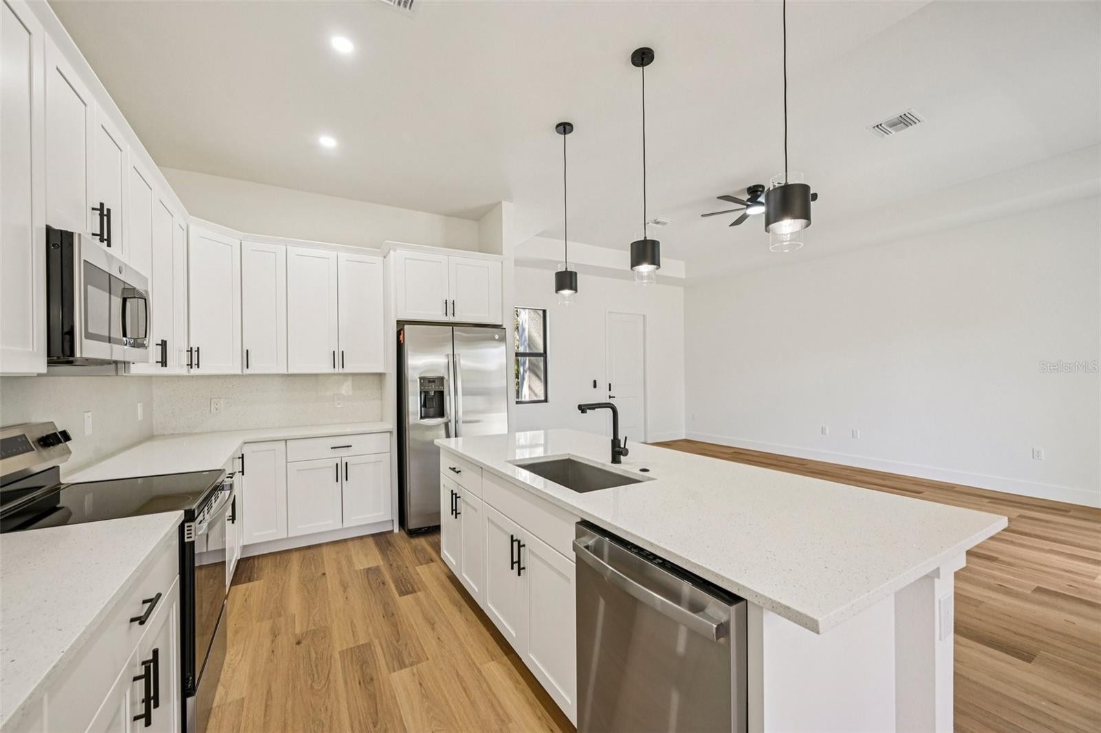 One or more photo(s) has been virtually staged. Move-in ready! Stunning new construction, offering the perfect blend of modern design, luxury finishes, and spacious living—all nestled on a 10,000 sq. ft. lot in the highly desirable city of North Port. This beautifully crafted home features 1,470 square feet of living space (2,124 sq. ft. under roof), with 3 bedrooms, 2 bathrooms, and a floor plan designed for both comfort and style. The bedroom, dining room, and family room add a distinctive architectural touch. Large, high-end, impact windows, with energy efficient low E glass. flood the home with natural light and offer exceptional energy efficiency. The open-concept living area provides generous room for dining, relaxing, and entertaining. The gourmet kitchen is equipped with stainless steel appliances, quartz countertops, an oversized island with breakfast bar, and upgraded soft-close cabinetry with crown molding—perfect for any cooking enthusiast. The luxurious master suite includes dual walk-in closets and a spa-like bathroom with his-and-hers vanities and an oversized tiled walk-in shower. Additional interior highlights include 8-foot interior doors, sliding glass doors, designer ceiling fans and chandeliers, abundant closet shelving, and high-end luxury vinyl tile flooring throughout. Exterior upgrades include a paver driveway, footpath, and entryway, full front gutters, and a Wi-Fi–enabled smart garage door opener. Located in the beautiful area of North Port, this home offers convenient access to top-tier water recreation, local amenities, and the finest beaches—making it an ideal retreat for those seeking both lifestyle and value. This move-in-ready home combines luxury, efficiency, and a modern layout in a premier Southwest Florida location. Don’t miss this opportunity!