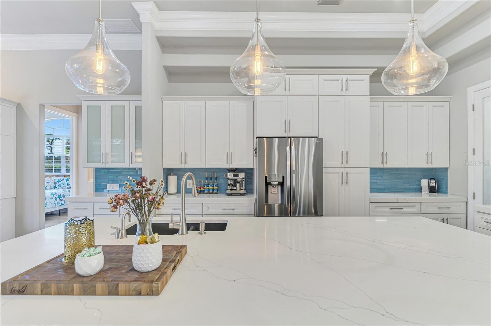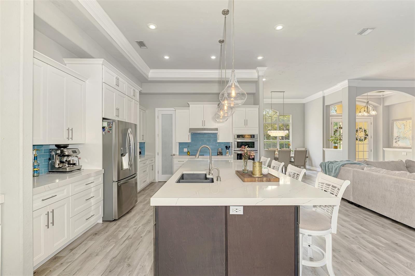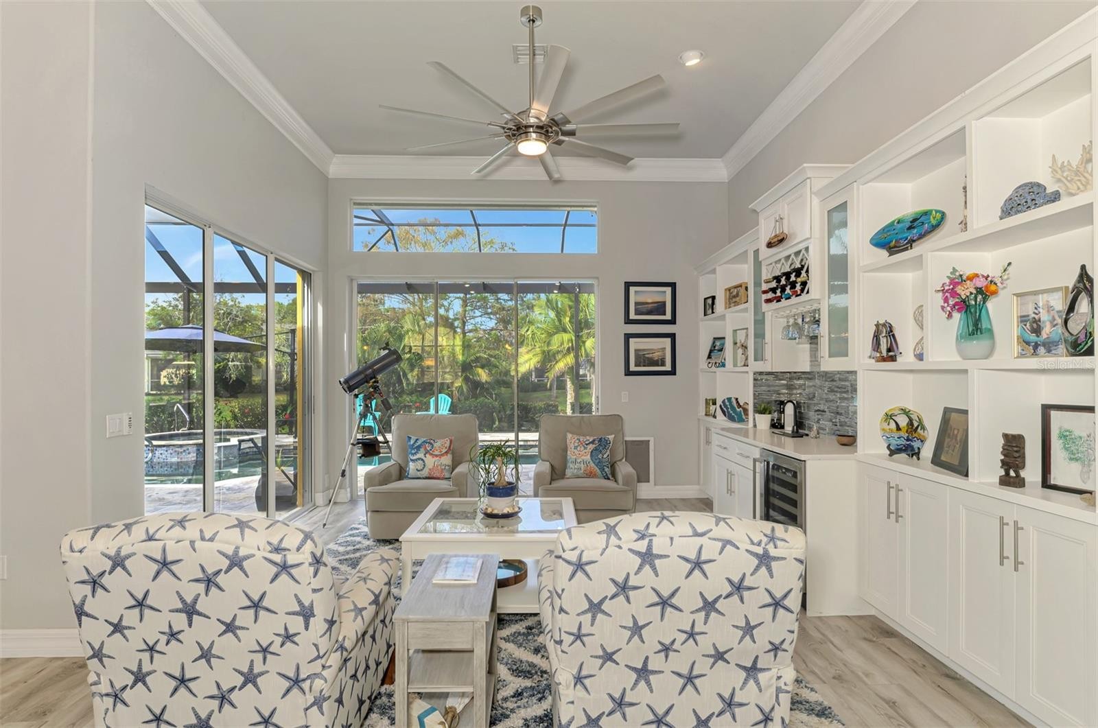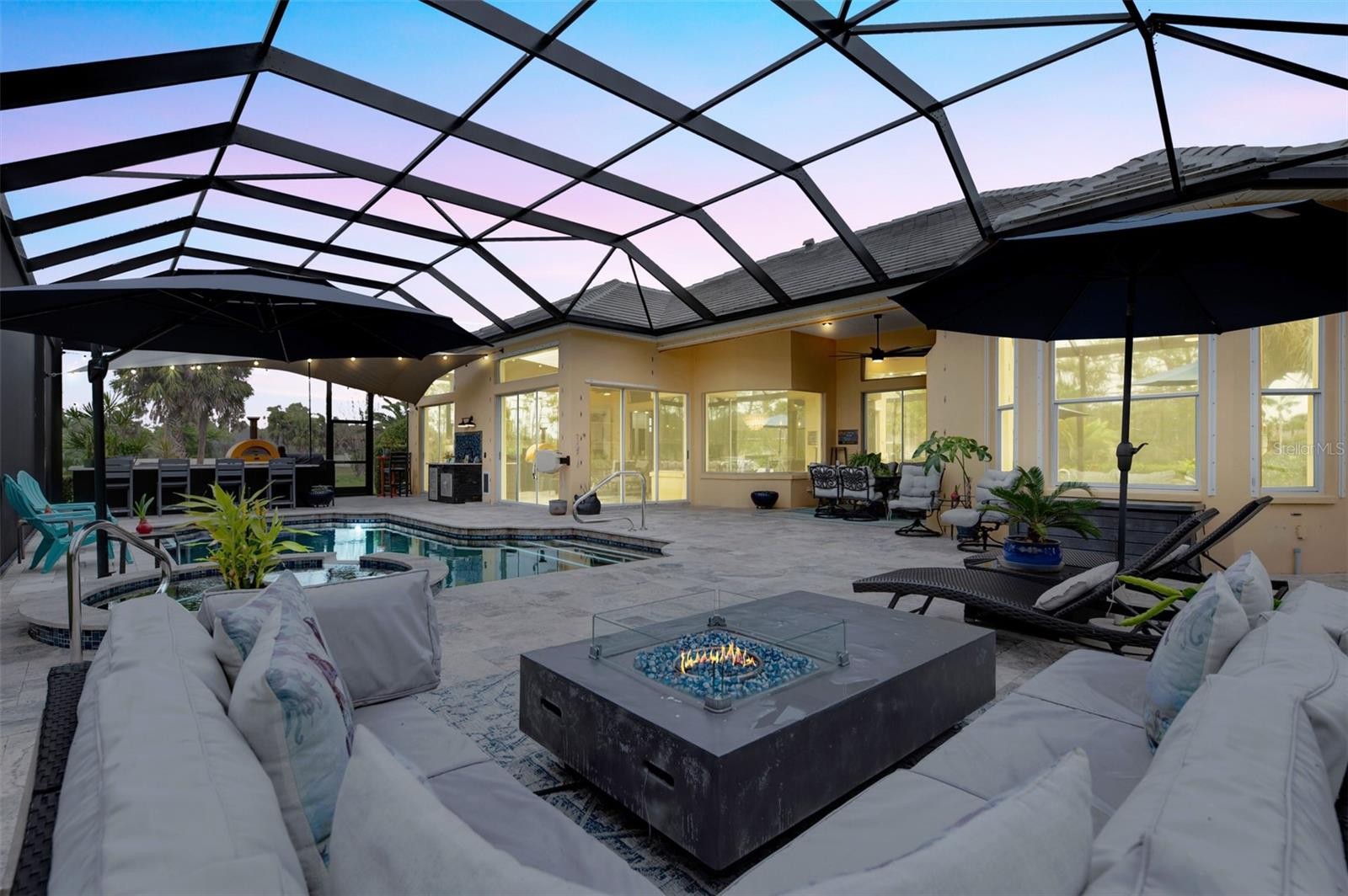 Welcome to this beautifully updated 3-bedroom, 2-bath home located in the highly desirable gated community of Boca Royale. Offering 2,819 square feet of living space and situated on a spacious half-acre lot with 211 feet of serene water frontage, this home combines luxury, comfort, and breathtaking views. Recent upgrades provide peace of mind and modern style, including a new tile roof (2024), new AC (2025), Storm Smart Screens throughout (2025), a new travertine lanai and panoramic view pool cage (2023), resurfaced pool and spa (2022), and an outdoor kitchen added in 2023. Inside, the home features new luxury plank vinyl flooring throughout, soaring ceilings, crown molding, ceiling fans, transom windows, and five sets of sliding glass doors that open to the expansive lanai and stunning water views. The updated chef’s kitchen is truly a standout with quartz countertops, glass hand painted backsplash, induction cooktop, built-in oven and microwave, built-in ice maker, baker’s lift for your stand mixer, and a large walk-in pantry. The breakfast nook features an aquarium window showcasing spectacular water views. The spacious family room and living room both offer sliding doors to the lanai and pool area, creating seamless indoor-outdoor living. The living room also includes built-in shelving and a dry bar with liquor dispenser and wine refrigerator, perfect for entertaining. A formal dining room with large sunlit windows, dedicated desk area for working from home, and a laundry room with abundant cabinetry and storage add convenience and functionality. The expansive primary suite highlighted by a wall of windows and a cozy built-in bench seat, creates the perfect nook for reading and relaxation, sliding doors to the pool and lanai, and two walk-in closets. The ensuite bath offers dual vanities, a relaxing soaking tub, and a separate shower. Two generous guest bedrooms provide comfort for family and visitors, with one offering direct access to the pool and lanai. Step outside to an entertainer’s dream featuring plenty of seating areas, a saltwater heated pool and spa recently resurfaced, and a beautiful outdoor kitchen with granite countertops. The expansive travertine lanai and panoramic pool cage create the perfect setting to relax or host gatherings while enjoying tranquil panoramic water views. The property also features a butterfly garden, fruit trees, and mature landscaping that enhance the peaceful Florida setting. Located in Boca Royale, a gated community with a 24-hour guard, this home offers an exceptional Florida lifestyle in a beautifully maintained neighborhood.