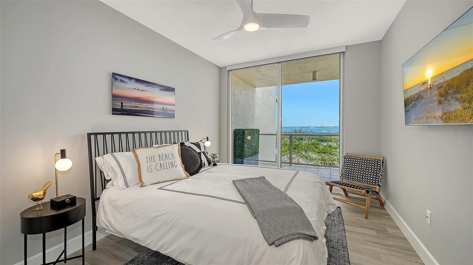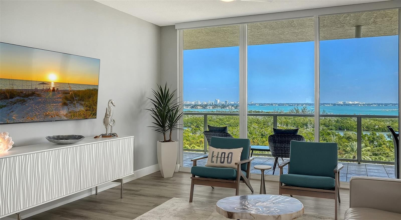 Showcasing breathtaking bay and city skyline views, this impeccably remodeled furnished residence delivers refined coastal elegance and effortless waterfront living. From the moment you enter, panoramic water and skyline vistas take center stage, setting the tone for a light-filled interior designed for both comfort and entertaining. The open floor plan features an inviting living room and dining area with designer lighting and walls of glass opening to the extraordinary 40+ foot terrace, an ideal setting for morning coffee or hosting guests against a stunning waterfront backdrop. The beautifully appointed kitchen blends style and function with custom cabinetry, quartz countertops, under-cabinet lighting, tile backsplash, and a full suite of Bosch appliances including refrigerator with freezer drawer, dishwasher, built-in microwave, oven with warming drawer, electric 5-burner cooktop, and vent hood. A Silhouette Professional dual-zone beverage center completes the space for effortless entertaining. The tranquil primary suite is a private retreat with terrace access, ceiling fan, and a thoughtfully redesigned spa-style bath featuring dual vanities, walk-in shower, and private water closet with Toto toilet and bidet. An office with a Murphy bed offers a closet with barn door enclosure, accent wall, frosted glass double doors, and ceiling fan, while an additional bedroom enjoys terrace access. The guest bath includes a tub/shower combination with Kohler fixtures, and the elegant powder bath showcases marble countertops, textured accent wall, and decorative lighting. A separate laundry room with built-in cabinetry adds everyday convenience. The chic powder bath is perfectly positioned for guests. Outdoor living is exceptional on the expansive terrace, complete with patio furnishings and a Coyote electric grill. Additional features include a hallway trash chute, new water heater (2022), assigned gated under-building parking space, and private storage locker. Located within the prestigious L’Elegance on Lido Key, residents enjoy a secure gated beachfront community with guard service, direct beach access, heated lap pool, spa, children’s pool, fitness center with saunas, tennis courts, kayak and bike storage, social rooms, underground parking, and full-time maintenance staff. Extensive building enhancements are underway including renovated common areas, brand-new elevators nearing completion, and a new roof in 2025. Assessments are fully paid and reserves are funded. With city beach re-nourishment underway, this is a rare opportunity to enjoy turnkey coastal luxury in one of Sarasota’s premier beachfront communities, where every day feels like a private resort escape.