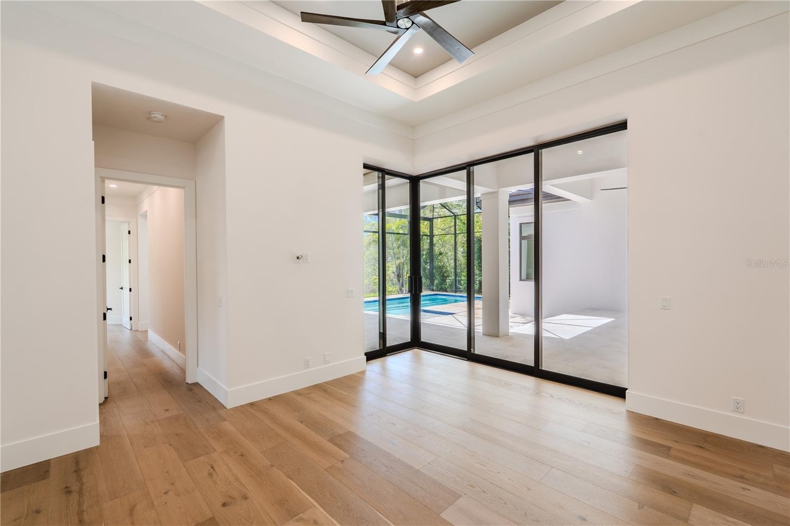 Completed and Move-In Ready. A rare opportunity to own a newly completed custom residence by Nutter Custom Construction, thoughtfully designed and set on an expansive homesite in the sought-after Field Club Estates. Spanning over 4,000 square feet, this single-story home blends refined architectural detail with a layout that offers both openness and privacy. A striking arrival is framed by mature palms and lush landscaping, complemented by a three-car side-load garage with epoxy flooring and a grand iron front door that sets the tone for the home’s elevated design. Impact-rated windows and sliding glass doors, along with solid core doors throughout, further enhance both quality and comfort. Inside, the home unfolds into a grand great room with soaring 15.5-foot ceilings, naturally aged flooring, and expansive 10-foot sliding glass doors that create a seamless connection to the outdoors. The kitchen is designed for both everyday living and entertaining, featuring an oversized island, custom wood cabinetry, luxury appliances, and a gas cooktop, along with a spacious walk-in pantry. The primary suite serves as a private retreat, thoughtfully positioned to capture serene views of the pool and tranquil pond beyond. This space features dual walk-in closets, custom cabinetry, and a spa-inspired bath complete with a soaking tub and a beautifully appointed walk-in shower. Two additional guest suites offer en-suite baths and walk-in closets, while a fourth bedroom is thoughtfully designed to function as a private casita or pool bath with dual access from both the interior and lanai. A media lounge with disappearing corner sliders enhances the home’s indoor-outdoor flow, opening to a resort-style outdoor living space. The covered lanai is designed for year-round enjoyment, highlighted by a 72” ventless gas linear fireplace, a fully equipped outdoor kitchen, and a dedicated dining area. The pool and spa are gas-heated and perfectly positioned to capture tranquil pond views, with a sun shelf and expansive deck creating a true backyard retreat—all enclosed within a clear-view screen for unobstructed views. Designed to balance luxury living with a serene natural setting, the home is equipped with gas service for the cooktop, water heater, outdoor kitchen, and pool/spa heater, offering both efficiency and elevated functionality. Ideally located, it provides convenient access to Sarasota’s renowned beaches, downtown, dining, and shopping. Please inquire for a complete list of features and specifications. Please note: Some photos have been virtually staged for illustration purposes.