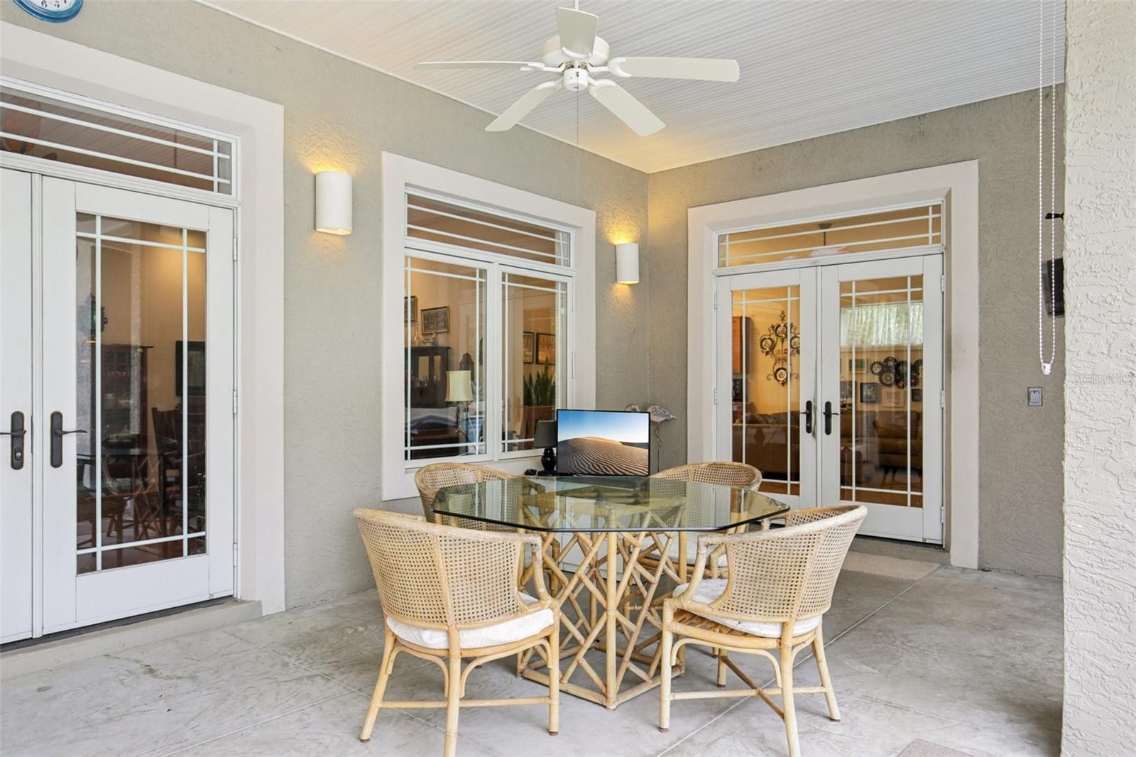 Meticulously maintained Spivey Construction custom-built home located in the highly sought-after Mill Creek community. This exceptional residence offers the perfect blend of luxury, efficiency and comfort on a spacious corner lot homesite bordered on 2 sides by conservation. Step inside the front French doors to discover a light-filled layout featuring hurricane-rated Pella windows and lanai doors, an open-concept living space and vaulted ceilings. The chef’s kitchen is a culinary dream, boasting a Frigidaire electric cooktop, KitchenAid built-in oven and microwave, warming drawer, and two-drawer dishwasher. A Frigidaire commercial-grade refrigerator and freezer add industrial-level performance and storage. Butler's pantry affords ample storage space. For added convenience, a 6-gallon electric water heater is tucked beneath the kitchen sink. Perfect for entertaining or enjoying simple meals with built-in kitchen table and separate formal dining room. Enjoy year-round peace of mind during power outtages with a Kohler 20KW automatic whole-house generator powered by a buried 500-gallon propane tank. Comfort is ensured with two air conditioning systems equipped with ultraviolet light and air purifying systems (updated in 2019 and 2022). Additional highlights include attic isonene insulation, a tankless propane water heater, premium roof shingles with waterproof underlayment, and a central vacuum system (2021). Three bedrooms and bonus room office with Murphy bed, provide plenty of sleeping space. Spacious primary suite features ample natural light, laminate floors, French doors to screened-in lani and pool, large walk-in closet and ensuite primary bathroom with dual sinks, toilet fitted with bidet seat and large stone-walled walk-in shower. The outdoor oasis features a screened lanai with in-ground pool. Ample covered seating area ideal for enjoying outdoor barbeques. Keep your lawn looking great with an irrigation system using reclaimed water. This one-of-a-kind home is ideal for those seeking quality construction, modern systems, and serene Florida living. Deed-restricted Mill Creek features low HOA fees and no CDD. Close to schools, parks, Lakewood Ranch, UTC mall and more. Schedule your private showing today!
