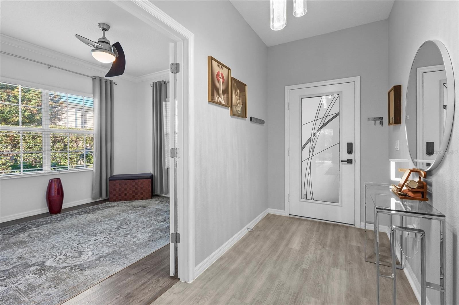 Welcome to this beautifully updated villa offering the perfect blend of modern style, low-maintenance living, and prime location in a gated Lakewood Ranch area community with no CDD fees and low HOA fees. Tucked away at the end of a peaceful cul-de-sac, this home immediately impresses with its lush landscaping, accent lighting with underground wiring, and inviting curb appeal. With over 2,200 square feet of thoughtfully designed living space, this villa features two bedrooms, a dedicated office/den with ultra-fast fiber optic internet, and an open-concept layout ideal for both everyday living and entertaining. The home has been extensively upgraded, including luxury vinyl plank flooring throughout all former carpeted areas, a completely remodeled primary bathroom with modern vanities and a sleek walk-in shower, a built-in generator hookup, and a screened front porch that provides a quiet, comfortable outdoor retreat. The spacious kitchen showcases upgraded cherrywood cabinetry, stainless steel appliances, granite countertops, a breakfast bar, and a gas hookup for those who prefer cooking with gas. The great room features a tray ceiling and flows seamlessly into the extended rear screened lanai, creating the perfect space for relaxing or hosting guests. The primary suite offers dual closets and a fully remodeled en-suite bathroom with a modern walk-in shower. Each room is equipped with ceiling fans for added comfort. The office provides a quiet, functional workspace ideal for remote work or a private study. Residents enjoy resort-style amenities including a community pool and spa, tennis courts, grilling area, and two dog parks. The location is unbeatable, with easy access to shopping, dining, medical facilities, top-rated schools, and Sarasota and Gulf Coast beaches. This is a rare opportunity to enjoy maintenance-free, fully furnished, move-in-ready luxury living in one of the most desirable areas near Lakewood Ranch.