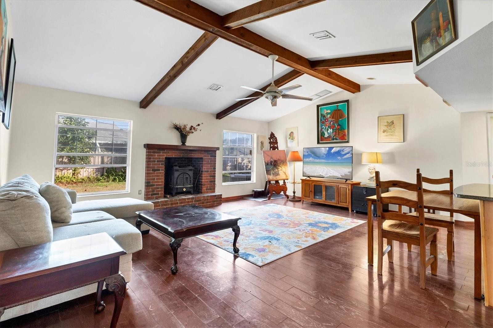 Large Lot is just over 1/2 acre with MAIN HOUSE of Block construction with 3 bedrooms and two full bathrooms laid out in a split floor plan. Enter the Foyer and Living Room - Dining Room combo. Kitchen has an island, granite countertops. Family Room features high ceilings, a brick fireplace with a wood stove. Lots of natural light. POOL has a large pool deck and new screen enclosure 2025. Two car garage with clothes washer and dryer that convey. New roof 2025. Fully fenced back yard. Additional GUEST HOUSE is approximately 750 SF (Buyer must verify measurements). This great-room style house includes a full bathroom and kitchenette. Private parking and even its own municipal trash cans. NO HOA, minutes to Siesta Key, the beach and the salt life!