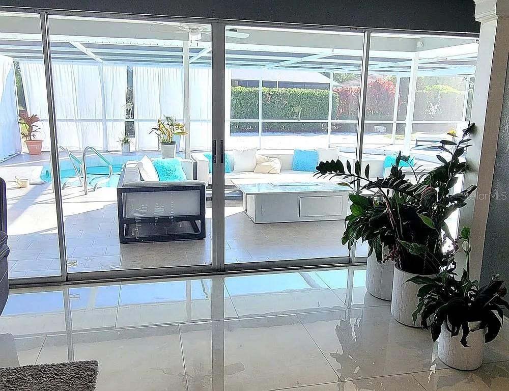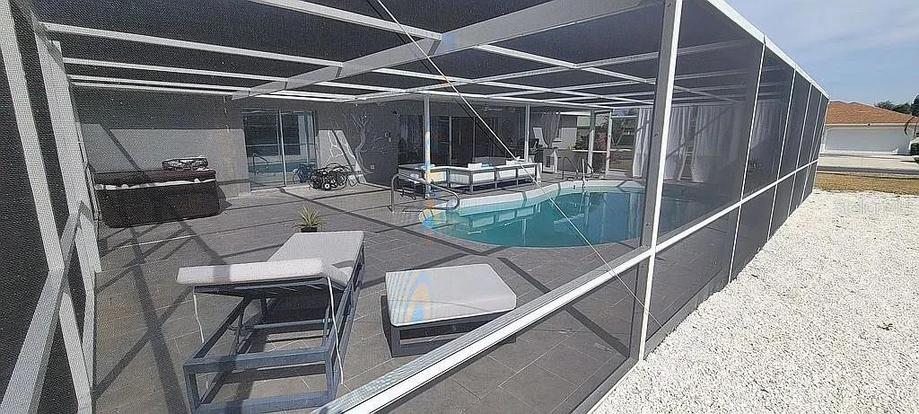 Jacaranda West fully remodeled home (2021) with golf & tennis community access and low HOA approx. $40/month. Features new roof, new appliances, updated kitchen and baths, and extensive smart-home automation controlling lighting, curtains, pool pump, sprinklers, lanai misting system, and keyless Bluetooth entry. The finished garage IN-LAW SUITE offers a private entrance, full kitchen, bathroom with shower, laundry, and added interior/exterior storage. The main kitchen includes a pot filler, RO system, appliance lift, media hub, and integrated touchscreen control center with Wi-Fi, Bluetooth, cameras, and quiet built-in ventilation. Primary suite showcases full-height tile, 5’x5’ walk-in shower with thermostatic valve, bidet, freestanding tub, Bluetooth ceiling speakers, and walk-in closet with direct laundry access. Outdoor living features a freestanding kitchen with refrigerator and Wi-Fi grill. Most furniture included (excluding lanai)