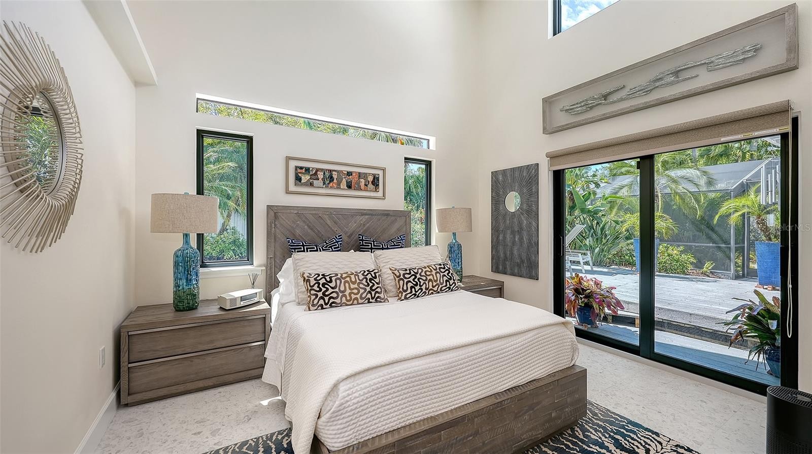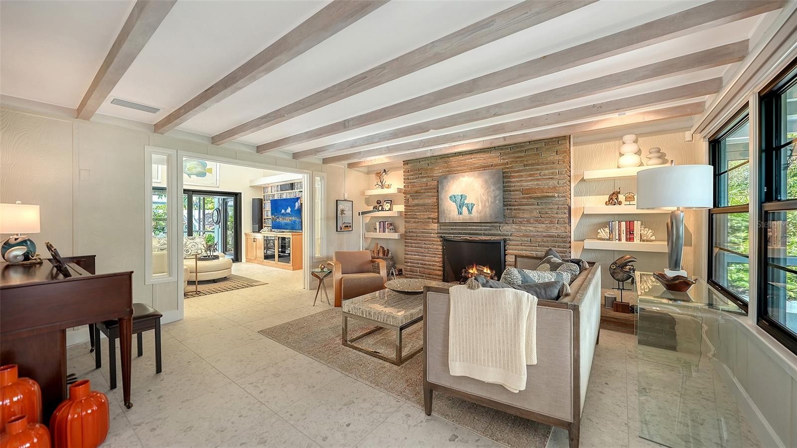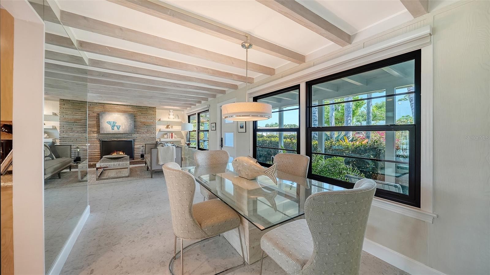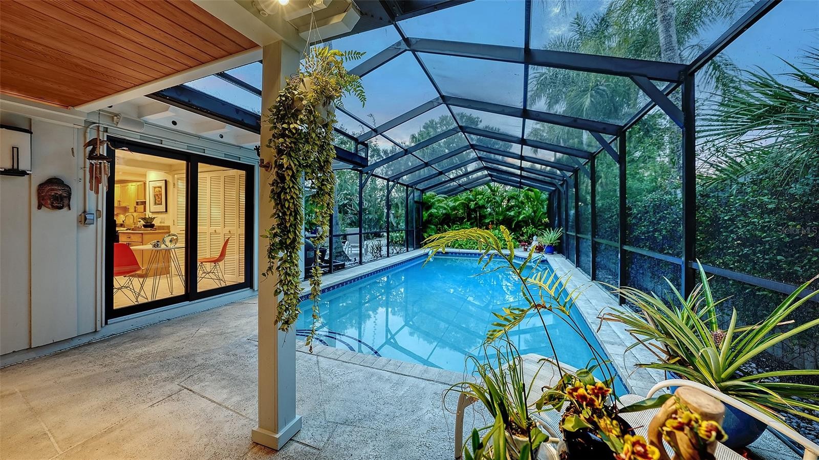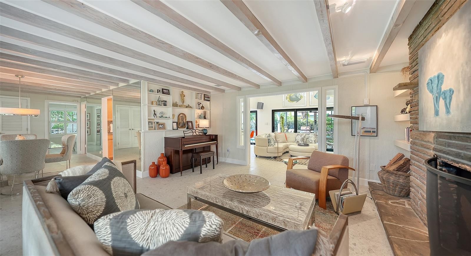 Mid-Century Soul + Coastal Sophistication + West of the Trail. Welcome to a masterfully curated Mid-Century Modern retreat located just north of the Stickney Point Bridge in one of Sarasota's coveted zip codes. Situated on a lush 0.31-acre corner lot, this property offers a rare sense of tranquility and total privacy with no HOA or deed restrictions—all just minutes from the world-renowned quartz sands of Siesta Key or Sarasota’s vibrant Downtown. The Aesthetic: Architectural Artistry. This isn’t just a home; it’s a design statement. Every inch celebrates the iconic MCM silhouette, from the striking floor-to-ceiling stone fireplace to the authentic exposed beams and dramatic vaulted ceilings. The timeless architecture is elevated by contemporary finishes, including large-format porcelain tile, Hunter Douglas window treatments, and custom stained-glass transoms that bathe the space in natural light. The Vibe: Indoor-Outdoor Synergy. Live the Sarasota dream in a space designed for the ultimate entertainer. The family room features pocketing glass sliders that reveal your private outdoor oasis, seamlessly dissolving the line between indoors and out. Host “golden hour” gatherings on the 20’ x 14’ composite deck, dine alfresco beneath the Cypress-wood lanai, or unwind in the heated saltwater pool—all enveloped by lush, professionally designed tropical landscaping and a fully fenced yard. Inside the lanai, a tranquil pond with a pump and cascading waterfall creates the perfect setting for meditation. The private, gated west-side yard—just off the primary bedroom deck—offers an additional secluded retreat, while thoughtfully designed landscape lighting sets the stage for stunning evening vistas. Retreat & Versatility: The Primary suite is a true sanctuary, boasting a sun-drenched reading nook, a spacious walk-in closet, and private deck access perfect for your morning coffee. On the opposite wing, a secondary primary-style suite offers ultimate flexibility for high-end guest hosting or a sophisticated home office. Another spacious guest bedroom completes the floorplan. With three full baths and a thoughtful "split" floor plan, the layout is as functional as it is beautiful. Modern “Peace of Mind Checklist” features include: new roof (2024), new ductwork (2024), fresh exterior paint (2024), 3 new water heaters (2024/2023), impact rated windows & doors (2023/2020), high-efficiency A/C (2020), Honeywell Home WiFi thermostat, and updated ADT monitored security system. Parking Pro: Two separate driveways plus a one-car garage for all your toys.