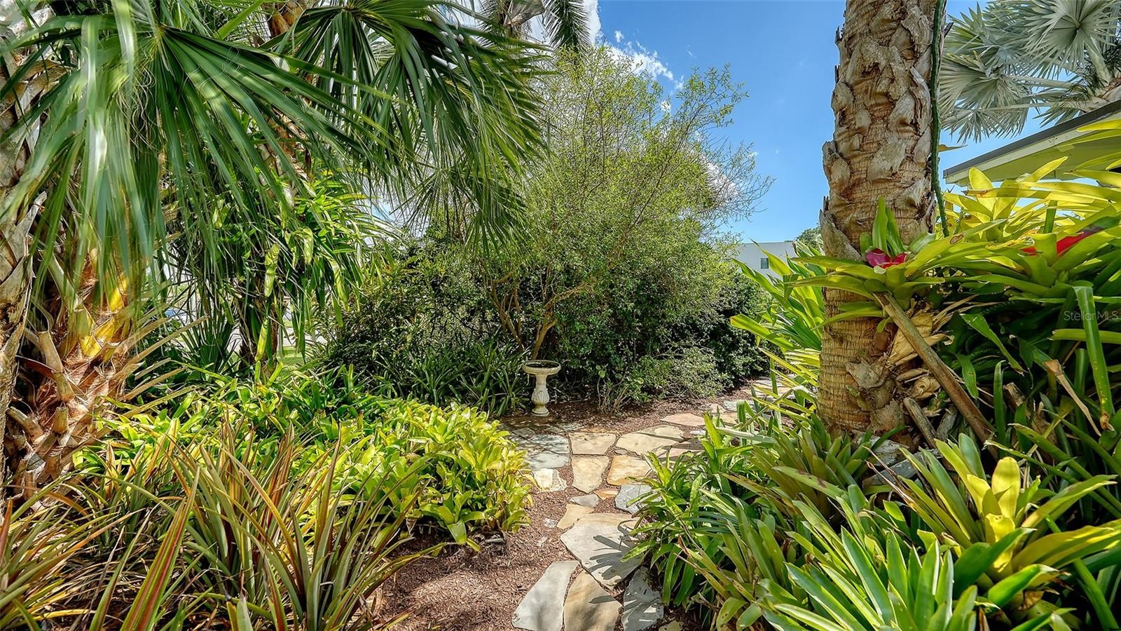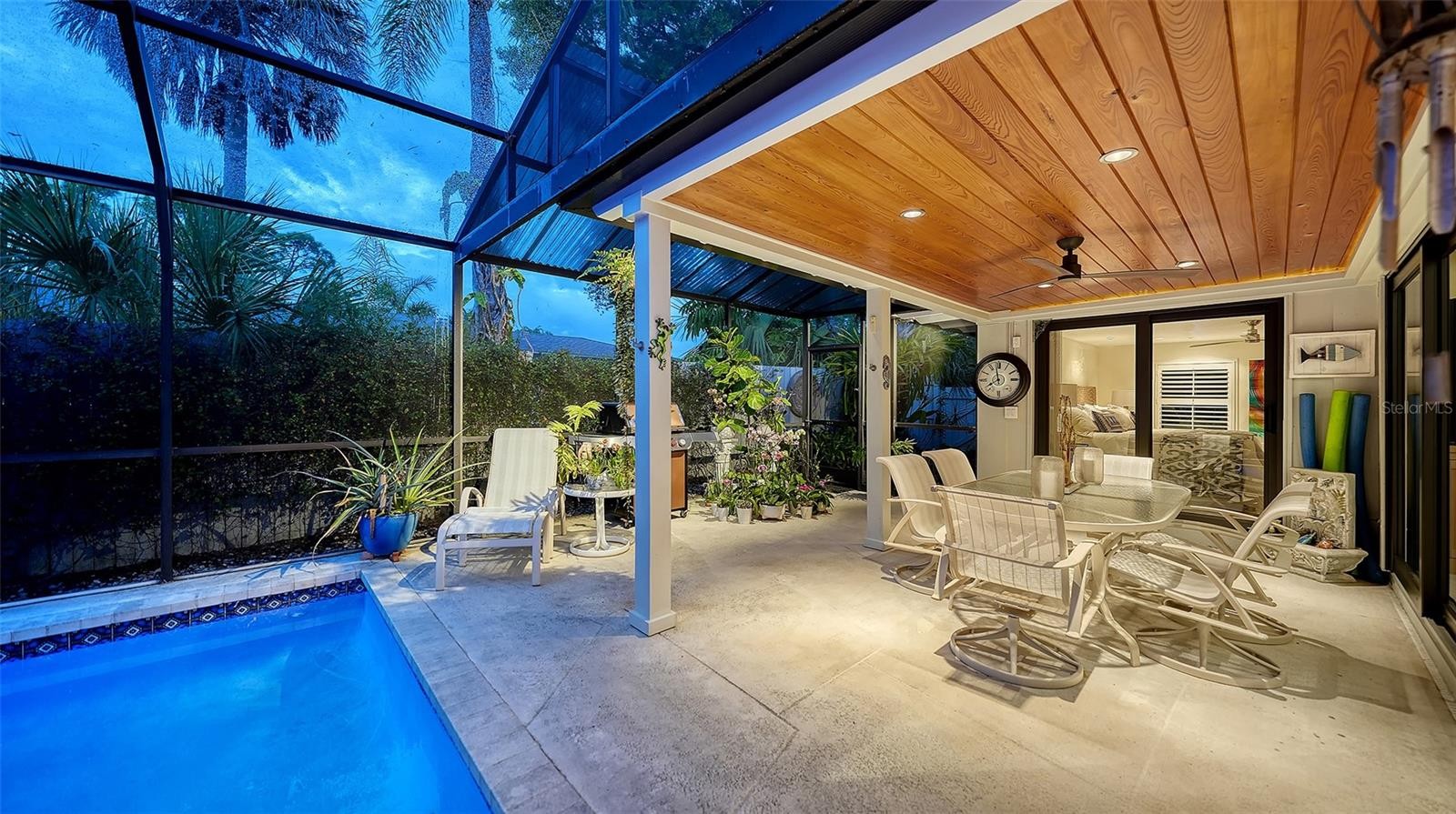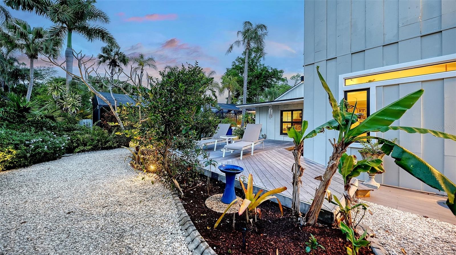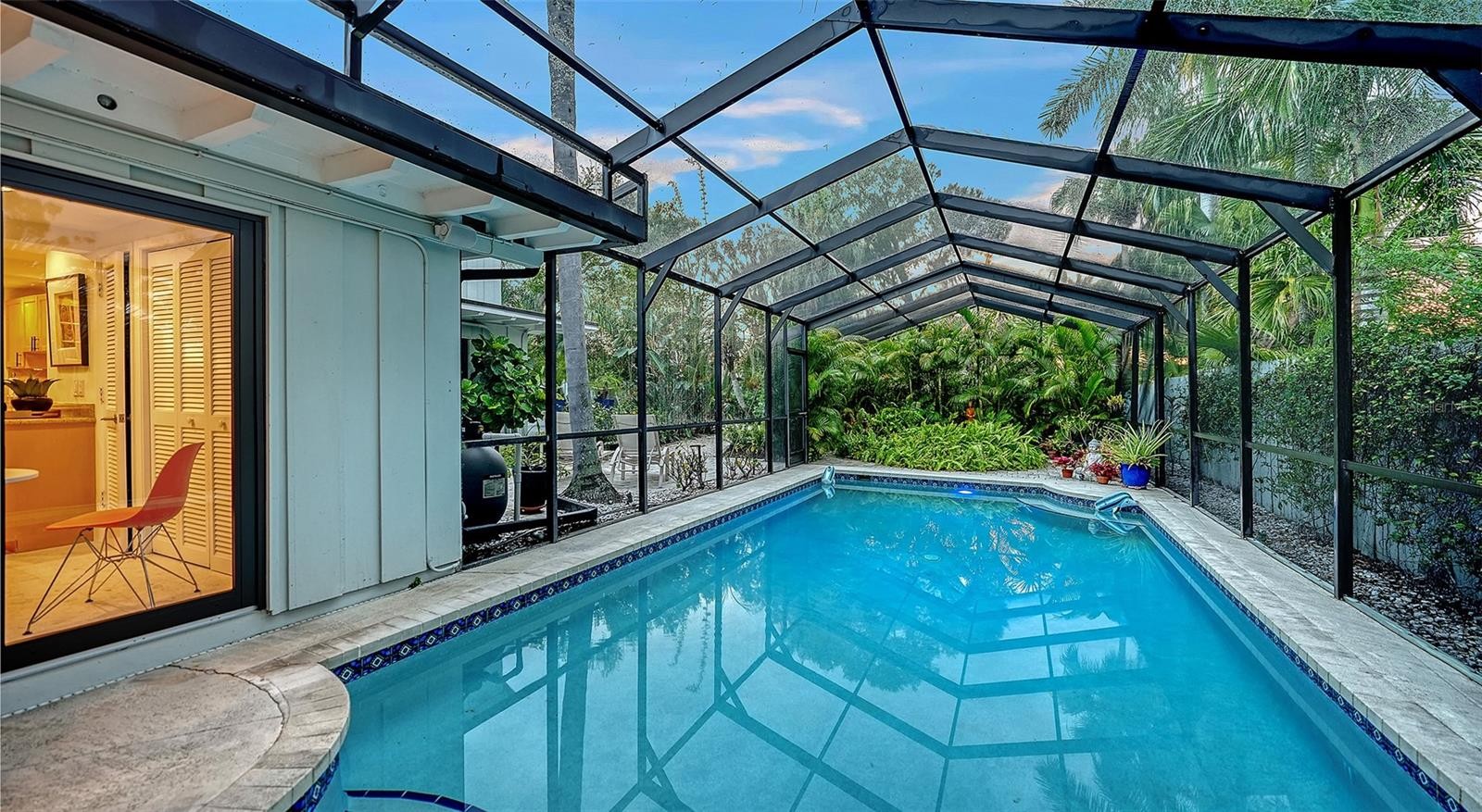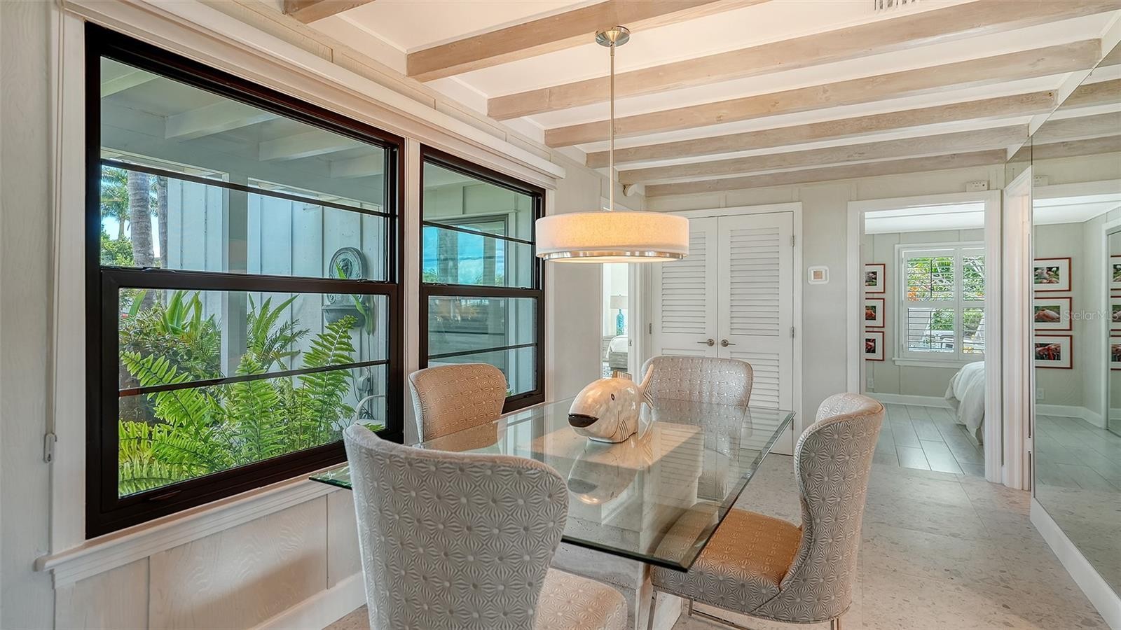 Mid-Century Soul + Coastal Sophistication + West of the Trail. Welcome to a masterfully curated Mid-Century Modern retreat located just north of the Stickney Point Bridge in one of Sarasota's coveted zip codes. Situated on a lush 0.31-acre corner lot, this property offers a rare sense of tranquility and total privacy with no HOA or deed restrictions—all just minutes from the world-renowned quartz sands of Siesta Key or Sarasota’s vibrant Downtown. The Aesthetic: Architectural Artistry. This isn’t just a home; it’s a design statement. Every inch celebrates the iconic MCM silhouette, from the striking floor-to-ceiling stone fireplace to the authentic exposed beams and dramatic vaulted ceilings. The timeless architecture is elevated by contemporary finishes, including large-format porcelain tile, Hunter Douglas window treatments, and custom stained-glass transoms that bathe the space in natural light. The Vibe: Indoor-Outdoor Synergy. Live the Sarasota dream in a space designed for the ultimate entertainer. The family room features pocketing glass sliders that reveal your private outdoor oasis, seamlessly dissolving the line between indoors and out. Host “golden hour” gatherings on the 20’ x 14’ composite deck, dine alfresco beneath the Cypress-wood lanai, or unwind in the heated saltwater pool—all enveloped by lush, professionally designed tropical landscaping and a fully fenced yard. Inside the lanai, a tranquil pond with a pump and cascading waterfall creates the perfect setting for meditation. The private, gated west-side yard—just off the primary bedroom deck—offers an additional secluded retreat, while thoughtfully designed landscape lighting sets the stage for stunning evening vistas. Retreat & Versatility: The Primary suite is a true sanctuary, boasting a sun-drenched reading nook, a spacious walk-in closet, and private deck access perfect for your morning coffee. On the opposite wing, a secondary primary-style suite offers ultimate flexibility for high-end guest hosting or a sophisticated home office. Another spacious guest bedroom completes the floorplan. With three full baths and a thoughtful "split" floor plan, the layout is as functional as it is beautiful. Modern “Peace of Mind Checklist” features include: new roof (2024), new ductwork (2024), fresh exterior paint (2024), 3 new water heaters (2024/2023), impact rated windows & doors (2023/2020), high-efficiency A/C (2020), Honeywell Home WiFi thermostat, and updated ADT monitored security system. Parking Pro: Two separate driveways plus a one-car garage for all your toys.