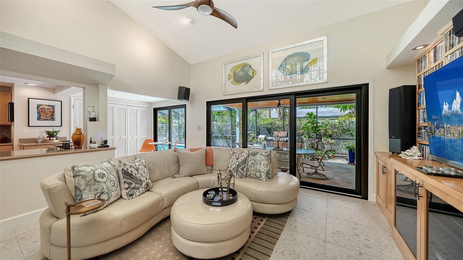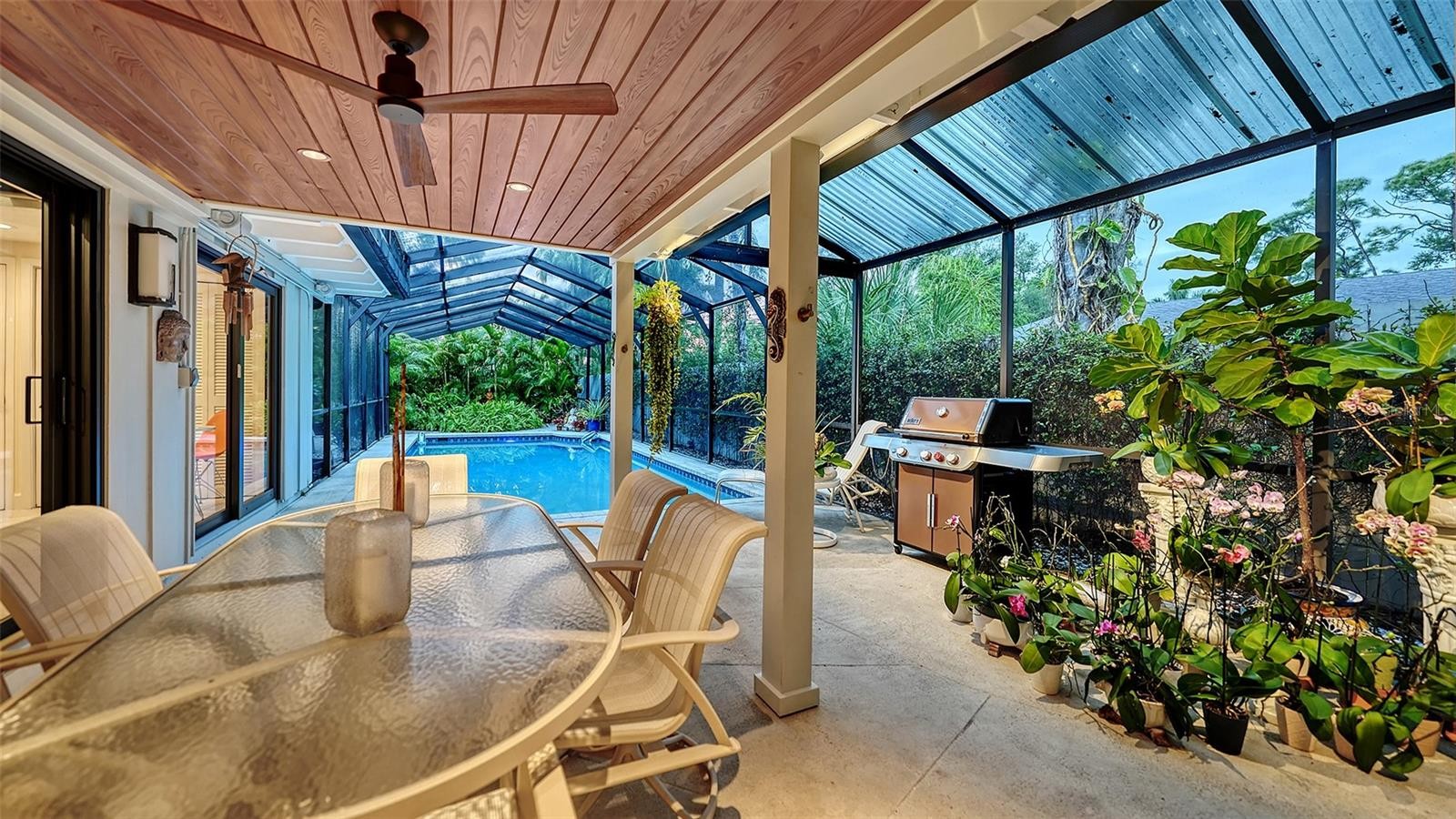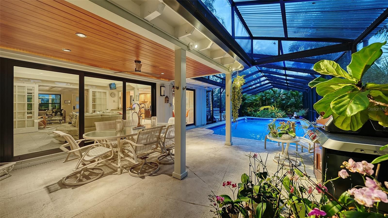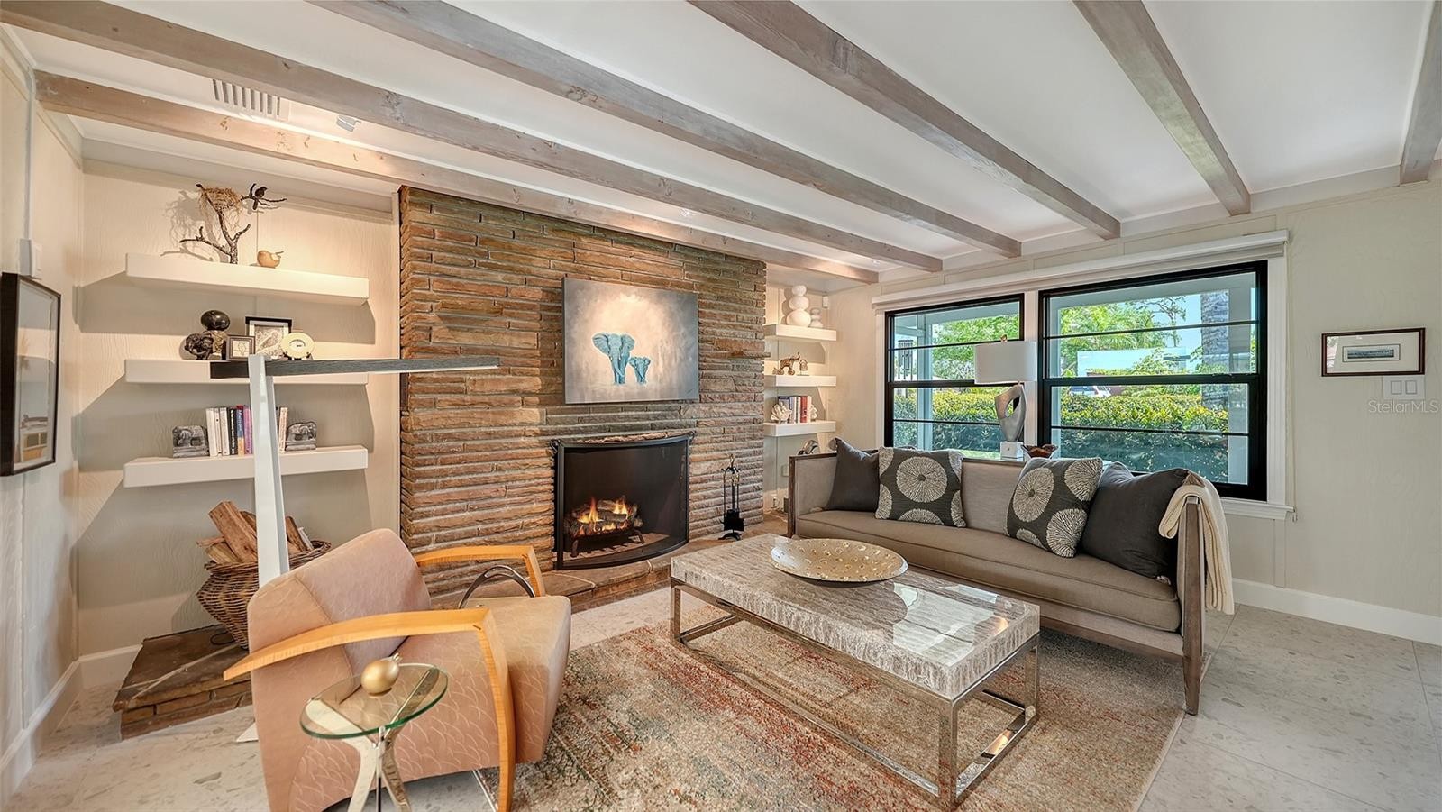 Mid-Century Soul + Coastal Sophistication + West of the Trail. Welcome to a masterfully curated Mid-Century Modern retreat located just north of the Stickney Point Bridge in one of Sarasota's coveted zip codes. Situated on a lush 0.31-acre corner lot, this property offers a rare sense of tranquility and total privacy with no HOA or deed restrictions—all just minutes from the world-renowned quartz sands of Siesta Key or Sarasota’s vibrant Downtown. The Aesthetic: Architectural Artistry. This isn’t just a home; it’s a design statement. Every inch celebrates the iconic MCM silhouette, from the striking floor-to-ceiling stone fireplace to the authentic exposed beams and dramatic vaulted ceilings. The timeless architecture is elevated by contemporary finishes, including large-format porcelain tile, Hunter Douglas window treatments, and custom stained-glass transoms that bathe the space in natural light. The Vibe: Indoor-Outdoor Synergy. Live the Sarasota dream in a space designed for the ultimate entertainer. The family room features pocketing glass sliders that reveal your private outdoor oasis, seamlessly dissolving the line between indoors and out. Host “golden hour” gatherings on the 20’ x 14’ composite deck, dine alfresco beneath the Cypress-wood lanai, or unwind in the heated saltwater pool—all enveloped by lush, professionally designed tropical landscaping and a fully fenced yard. Inside the lanai, a tranquil pond with a pump and cascading waterfall creates the perfect setting for meditation. The private, gated west-side yard—just off the primary bedroom deck—offers an additional secluded retreat, while thoughtfully designed landscape lighting sets the stage for stunning evening vistas. Retreat & Versatility: The Primary suite is a true sanctuary, boasting a sun-drenched reading nook, a spacious walk-in closet, and private deck access perfect for your morning coffee. On the opposite wing, a secondary primary-style suite offers ultimate flexibility for high-end guest hosting or a sophisticated home office. Another spacious guest bedroom completes the floorplan. With three full baths and a thoughtful "split" floor plan, the layout is as functional as it is beautiful. Modern “Peace of Mind Checklist” features include: new roof (2024), new ductwork (2024), fresh exterior paint (2024), 3 new water heaters (2024/2023), impact rated windows & doors (2023/2020), high-efficiency A/C (2020), Honeywell Home WiFi thermostat, and updated ADT monitored security system. Parking Pro: Two separate driveways plus a one-car garage for all your toys.