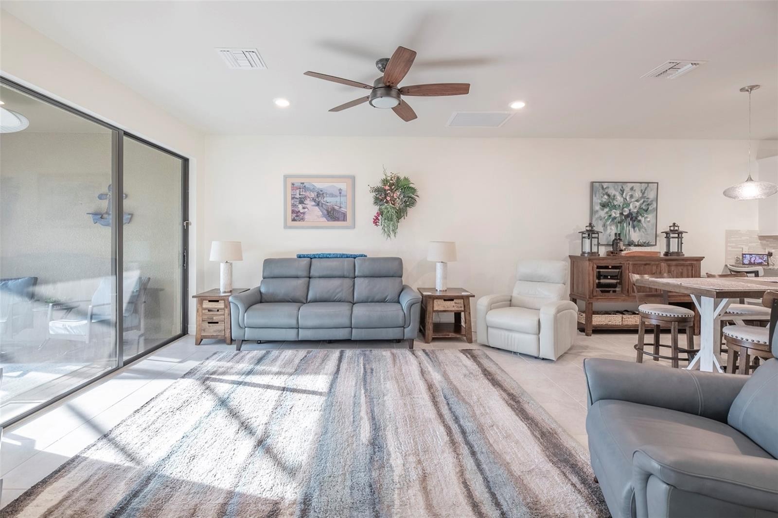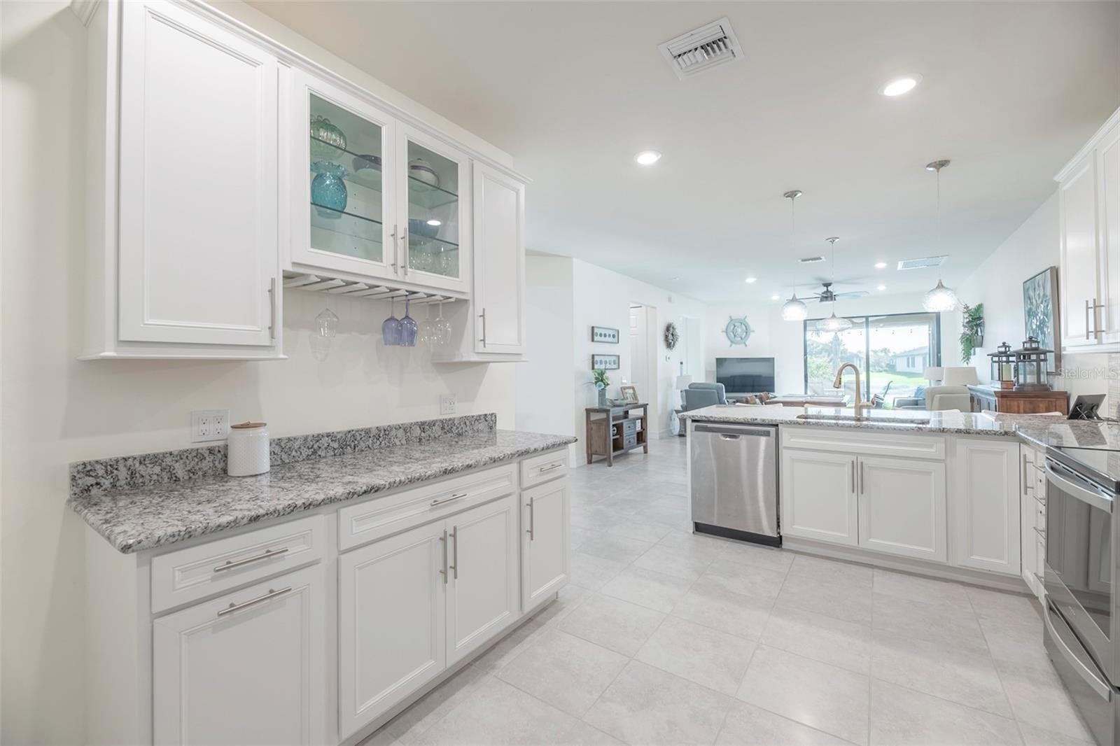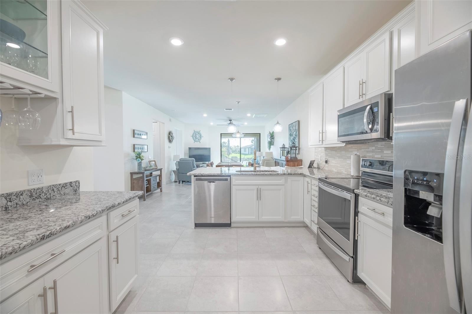 Move-in ready waterfront home with extended lanai in the highly sought-after IslandWalk at Wellen Park—one of Southwest Florida’s premier “plug-and-play” lifestyle communities. Perfect for seasonal or full-time living, IslandWalk is a true destination for those looking to enjoy resort-style living from day one, with extensive amenities, a full-time activity director, maintenance-free living, and 24-hour guard-gated security. Built in 2018 and only lightly lived in, this tastefully upgraded home offers 2 bedrooms plus a flex room and shows like new. Interior features include 9’ ceilings, 8’ doors, 5” baseboards, and 17” ceramic tile flooring throughout. The upgraded kitchen features 42” cabinetry, granite countertops with full bullnose edge, fingerprint-resistant stainless steel appliances, glass and stone backsplash, high-arc faucet, and added custom built-in cabinetry and counter space. The primary suite includes dual sinks, comfort-height cabinetry and toilets, and a multi-jet shower system. Additional upgrades include crown molding, plantation shutters, ceiling fans throughout, decorative lighting, UV-tinted sliding glass doors, and added laundry room cabinetry. Enjoy indoor-outdoor living with an extended 12’ x 18’ lanai featuring clear-view no-see-um screens and stunning 180-degree water views. The garage is finished with epoxy and resin chip flooring, added shelving, insulated overhead door, ceiling fan, and retractable screen. Full-house accordion shutters provide quick and easy storm preparation and added peace of mind. The home's location is optimal in every way. Everything you need can be reached in minutes via golf cart, bike or on foot. Shopping, dining and entertainment are just steps away. Take a short walk to the amenity center or out through the back gate to Downtown Wellen Park, Publix and more. IslandWalk amenities include two resort-style clubhouses, heated pools and lap pools, fitness center, tennis, pickleball, bocce, dog park, community gardens, and miles of walking and biking trails—all designed to support an active, social lifestyle. Don't miss out, this is truly an incredible opportunity to own an upgraded, water view, newer villa that is optimally located!
