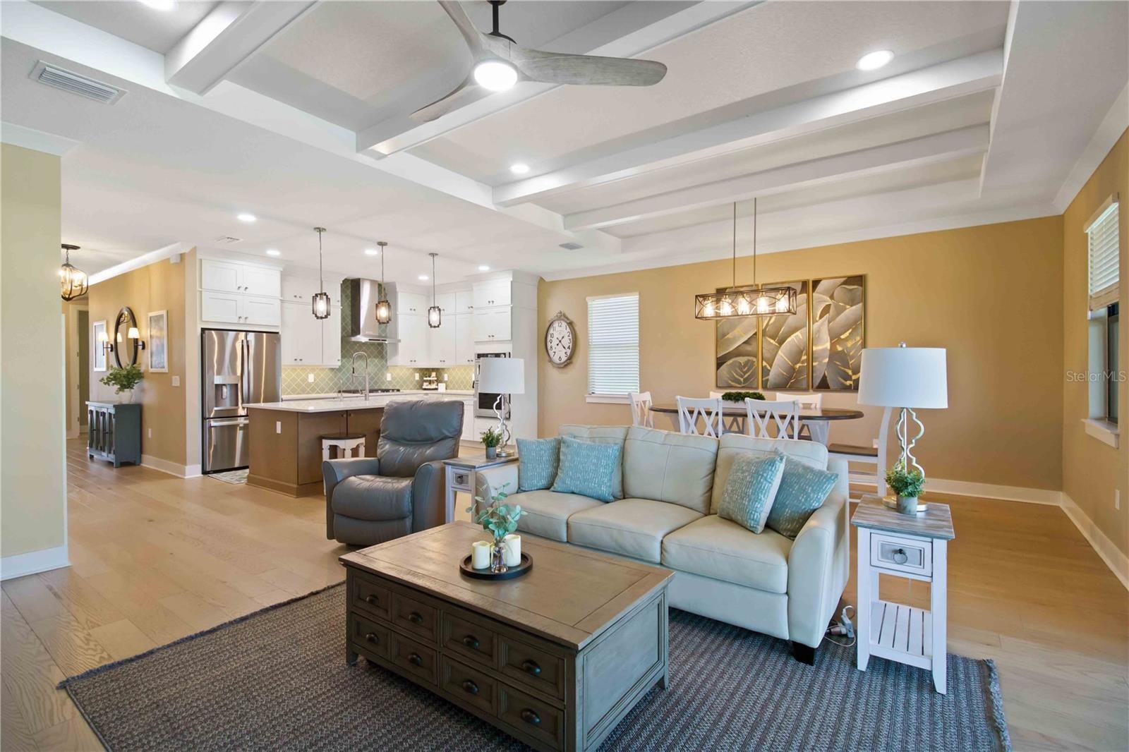 One or more photo(s) has been virtually staged. Why wait to build? This better-than-new 3BR/2BA home sits on a premium pond-view homesite in the gated, maintenance-free community of Solstice at Wellen Park. Featuring $60K+ in upgrades: hardwood & LVP throughout, custom ceiling beams, crown molding, and designer lighting. Built for peace of mind with impact windows/doors, whole-house Generac generator, and full gutters. The chef's kitchen includes KitchenAid appliances, premium cabinetry, full-height backsplash, expansive pantry, and whole-house water softener with reverse osmosis. Enjoy western exposure on the extended paver patio and screened lanai — prepped for outdoor kitchen, with room for a pool. The primary suite features a tray ceiling and large custom closet. Additional upgrades: custom drop zone, glass shower doors, blinds, designer fans, Electrolux washer/dryer, fresh paint, and upgraded garage lighting. Professional inspection completed. Furnishings available separately. Resort amenities include pool, clubhouse, and yoga lawn with golf cart access to Downtown Wellen Park and Cool Today Park. Under 15 minutes to Gulf beaches.