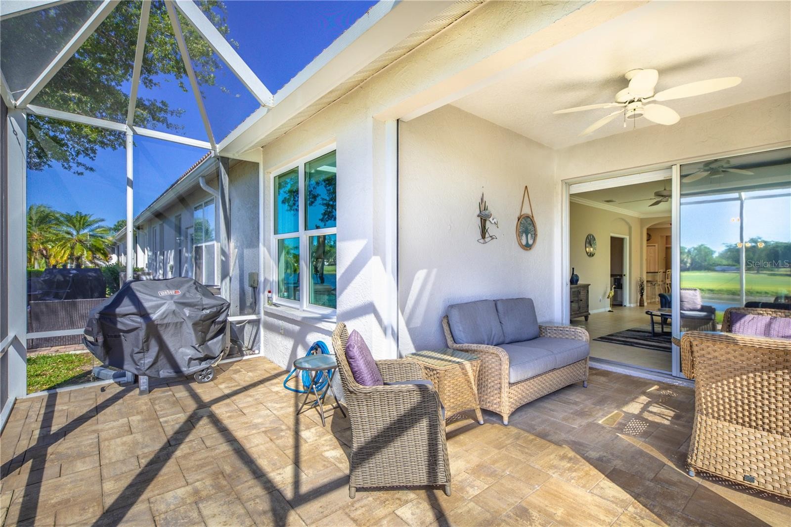 THIS HAS IT ALL! NEW ROOF 2023, NEW A/C 2024, END UNIT, WATER & GOLF COURSE VIEWS (on the 12th fairway) and can you believe it - TURNKEY FURNISHED! Located in the award winning community of Pelican Pointe Golf & Country Club, this villa is waiting for its new owner. IF that's not enough, all windows have been replaced with thermal pane hurricane resistant glass. Hurricane protection for the front door and lanai. The lanai is newer (2021) with heavy duty screens, expanded and a new paved floor. Newer Stainless Steel appliances complete the kitchen and new luxury vinyl flooring is in the bedrooms and office. The den/study has built-ins plus a Murphy bed. Crown molding in living areas and bedrooms. Having guests is a breeze with the split bedroom plan to ensure privacy for everyone! With all that this villa has, even the 2 car garage is great with a beautiful epoxy floor. Maintenance free living at its best! Exterior painting (painted in 2025) and roof replacement/repairs are some of the items included in the HOA fees as well as internet, basic cable, ground maintenance, and pest control. As a resident of Pelican Pointe, you will have access to lifestyle amenities including a clubhouse with bar/grille (enjoy Happy Hours at the bar), restaurant, fitness center, BRAND NEW DEDICATED PICKLEBALL COURTS, tennis and a heated lap pool. 24 hour guard gate at the main entrance and back entrances for residents only. Semi-private 27 hole golf course and golf is NOT MANDATORY. Wonderful biking, walking and pet-friendly community. BONUS: In addition to the lap pool by the clubhouse, there is also a community pool just around the corner for The Links residents only. EXTRA BONUS: There is a very active women's association with over 40 clubs. Only minutes from the Gulf, this villa is ideally positioned to enjoy the beaches, quaint shopping, cafes, restaurants & cultural activities of historic downtown Venice. Very accessible to I-75, US 41 and 4 airports. What are you waiting for?