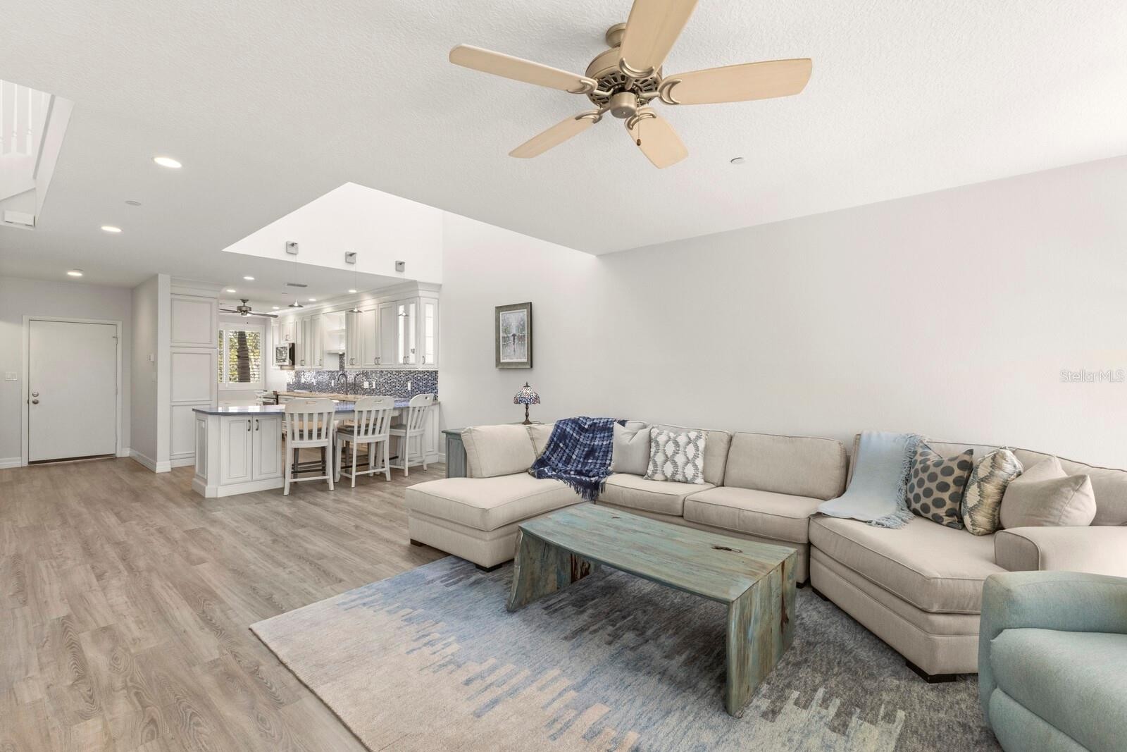 REDUCED PRICE! Are you looking for a RESORT home with spacious rooms, fine finishes, vaulted ceilings and the convenience of a condo community with bay and beach access? Look no further. Luxury and style await in this beautifully updated townhouse, located behind the gates of the exclusive Bay Isles resort. With 1,590 sq. ft. of meticulously designed and finished indoor living space plus another 1,100 sq. ft. of screened lanai, storage and garage space, this resort home provides the ultimate in luxe living, comfort and convenience. Upon entering this home, you're greeted by an open concept great room and designer kitchen, vaulted ceilings, a conveniently placed guest bathroom, and views over the very private community pool. You'll never want to leave! The gourmet kitchen is a chef’s dream, featuring gleaming granite countertops including a striking azure blue granite breakfast bar, custom mosaic glass tile backsplash, solid wood cabinetry, and stainless JennAir appliances. Easy to maintain luxury vinyl plank floors flow throughout, adding sophistication and durability. Soaring cathedral ceilings and abundant natural light enhance the light, bright, spacious feel of this home and the private screened lanai offers a serene retreat with access to lushly landscaped grounds and the resort style pool. The oversized primary suite boasts vaulted ceilings, a walk-in closet, and an elegant ensuite bath with natural stone and custom tile shower. The second bedroom also has a vaulted ceiling plus walk-in closet and beautifully finished adjacent bathroom. The ground-level garage has extra depth enabling covered parking for two cars plus there's a separate room that can be flexibly used for storage, a home gym, or a wine cellar. As a Bay Isles resident, you'll enjoy exclusive access to resident-only amenities including a private clubhouse, fitness center, heated pool and spa, tennis courts, and the private Bay Isles Beach Club. This resort home is just minutes from the vibrant dining, shopping, and cultural scene of St. Armands Circle and downtown Sarasota. See this home today and enjoy the best of Longboat Key living.