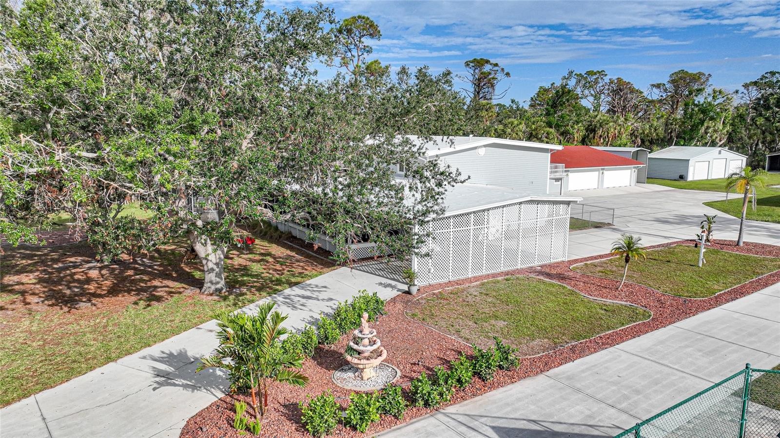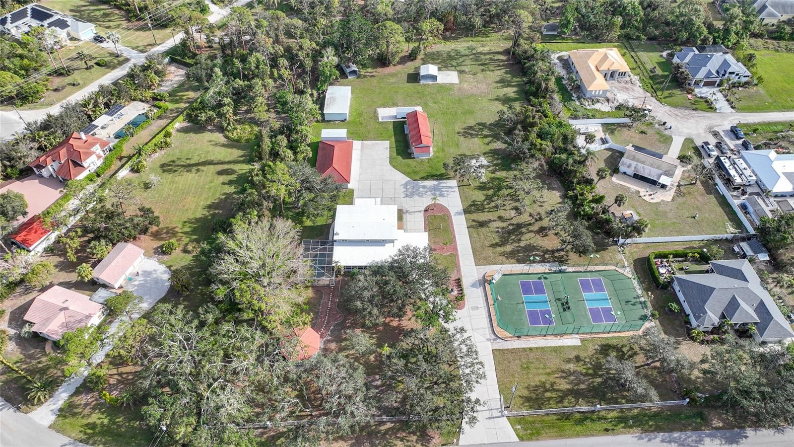 Discover your own slice of paradise with this unique 3.3-acre park-like estate, one mile from beautiful Manasota Beach and a public boat ramp. Boasting over 4,500 square feet of living space, this home embraces natural surroundings, providing a welcoming retreat and serene lifestyle. A charming white gate, adorned with globe lighting, welcomes you to the property. Upon entry, a tile-roof gazebo in the front yard evokes a sense of nostalgia beneath mature oaks, while a lighted and fenced double pickleball court (converted tennis court) offers the perfect outlet for sports enthusiasts. The wide driveway stretches to the back of the home, with a circular section providing easy, sheltered access to the entryway beneath the lattice carport. A screened-in L-shaped wraparound porch offers an ideal spot to relax and enjoy the Florida breeze. Accessible from both the front porch and the yard, the pool and hot tub are surrounded by a spacious pavered deck and screened pool cage. A built-in pet door leads to the exterior fenced dog run, giving pets the freedom to go outside on their own. The kitchen features a large island, solid surface countertops, wood cabinetry, breakfast bar, stainless appliances, stylish chimney hood, walk-in pantry, built-in desk, and decorative lighting. There is also room for a dining table, making it perfect for family gatherings. An archway opens to an additional dinette area, creating a seamless flow for entertaining. With floor-to-ceiling windows in both the dining and living rooms, abundant natural light fills the space. The living room's wood-burning fireplace adds a cozy touch on cooler Florida nights. The home features 4 bedrooms, a separate office/den that can serve as a 5th bedroom, and 4 1/2 baths, with the possibility of 3 master suites for unmatched comfort and privacy. Upstairs, the primary suite spans a generous 1,000 square feet with French doors leading to an expansive outdoor deck, and a spa-inspired bathroom featuring a jetted tub, rainfall shower, dual sinks, separate vanity. Two additional bedrooms are also located on the second floor, sharing a hallway bath with a large closet, walk-in shower, and double sinks. The remaining two rooms are downstairs, each with its own en-suite bathroom. The downstairs laundry room, designed for convenience, features custom built-in cabinets, shelves, and a storage closet. A laundry chute runs from beneath the upstairs bathroom sink cabinet to a laundry room cabinet, where clothes are gathered until wash day. A half bath is located in the hallway just outside the laundry room. The lower level family room will be one of the most frequently used spaces in the home, and features an exterior door leading to the double carport. Outdoors, you will find a total of 9 garage bays and 3 carports offering abundant parking for everything. The closest building is currently used as a game room and also includes a solid concrete safe room and full bath (making the property total 5 1/2 baths). The second building has a 2-car garage, 2 storage rooms, and a room ideal for a home gym with a mirror wall. There are 6 RV plugs on the property (four 30-amp and two 50-amp). There’s also a 3-bay garage with electric roll-up doors and 3 more open metal buildings. Some noteworthy features include public water and sewer, along with a well and pump system for exterior needs. The modified low-slope roof was replaced in 2020. This estate is a true sanctuary. Virtual tour and video are available.