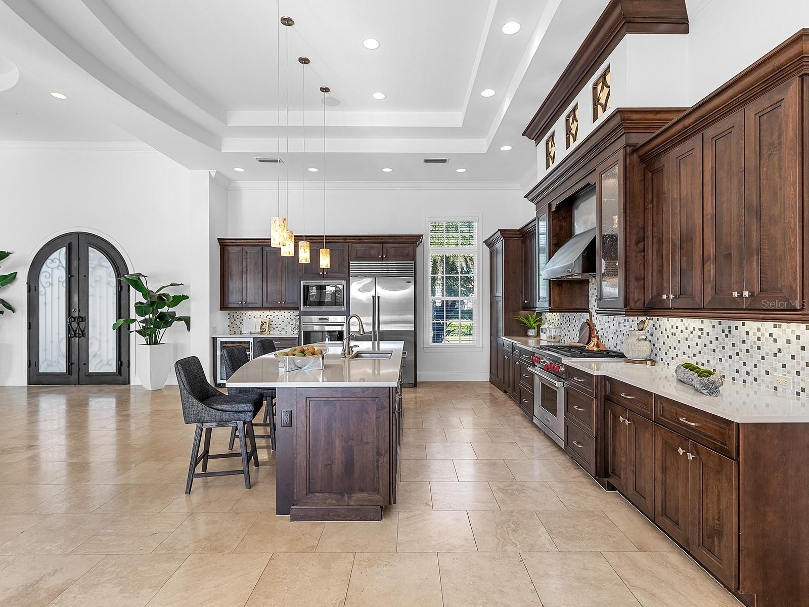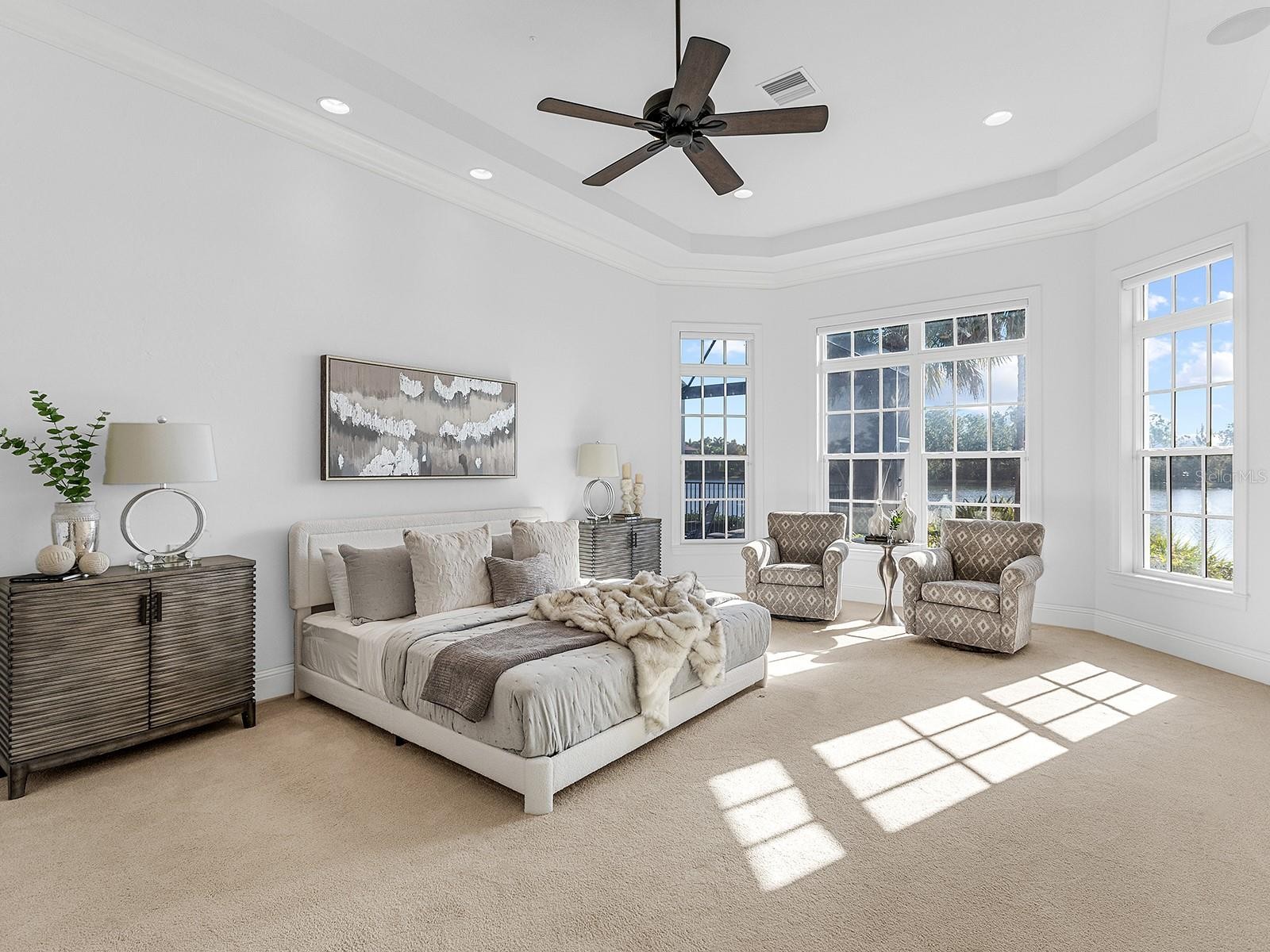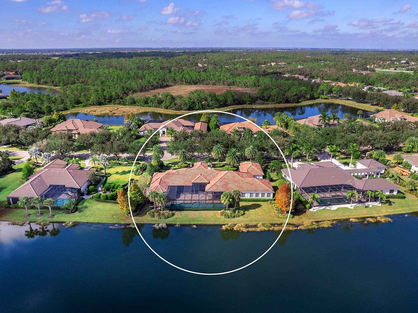 Poised to capture sweeping southeast-facing lake views, this impeccably designed Arthur Rutenberg residence presents a refined interpretation of indoor-outdoor living within the prestigious Concession community. Thoughtfully sited amid lush landscaping, the home blends architectural elegance with everyday comfort, creating an atmosphere that feels both elevated and effortless from the moment you arrive. Iron-and-glass double doors open to a luminous interior where coffered ceilings, polished travertine floors, and expansive pocketing sliders draw the eye outward to the pool and long water views beyond. The great room is both dramatic and inviting, offering generous space for entertaining while maintaining a natural connection to the outdoors. Anchoring the home, the gourmet kitchen is as functional as it is striking, featuring custom cabinetry with under- and over-cabinet lighting, a substantial floating island, quartz countertops, a discreet walk-in pantry, Wolf gas cooktop, a beverage cooler, and premium stainless-steel appliances. Just beyond, the formal dining room and adjoining bar provide an elegant setting for elevated gatherings and intimate dinners alike. A private office offers a refined workspace, while a spacious gym overlooks the lake, creating an inspiring backdrop for an active lifestyle. Three generously sized guest suites are thoughtfully positioned to ensure privacy, separate from the serene owner’s retreat. The primary suite serves as a true sanctuary, complete with a sitting area, expansive walk-in closets, and a spa-inspired bath with dual vanities, a soaking tub, and a walk-in shower. Outdoors, the expansive lanai becomes a natural extension of the living space, finished with travertine pavers, a fully equipped outdoor kitchen, and a resort-style saltwater pool and spa with sun shelf and fountains, all overlooking the tranquil lake. Whether hosting guests or enjoying a quiet evening at home, the setting offers a sense of everyday escape. The home has been thoughtfully enhanced with a suite of recent upgrades focused on comfort, efficiency, and peace of mind, including new air-conditioning systems, a whole-house generator, upgraded security with Ring doorbell, a Culligan reverse osmosis kitchen system, and a designer sound system. Outdoor enhancements include double-sealed travertine, a new patio cage, electric hurricane shades, accent lighting, wiring for an outdoor television, refreshed landscaping, and updated irrigation with front landscape lighting. Additional improvements include new flooring in a guest bedroom, upgraded electrical in select rooms, garage ceiling storage racks, and added utility connections. Smart home technology seamlessly controls lighting, security, sound, and climate, while the 0.70-acre homesite, enclosed by an iron fence, adds both privacy and presence. The Concession, home to the PGA Tour World Golf Championship and Senior PGA Championship is one of the most prestigious golf communities in the country and provides a serene environment.