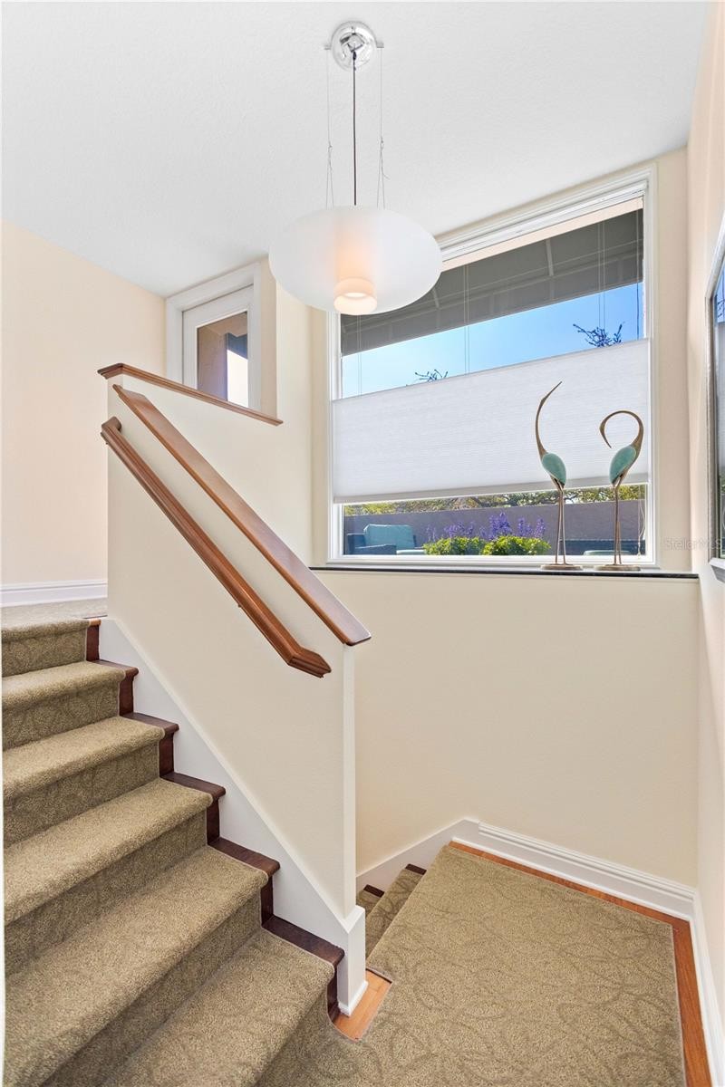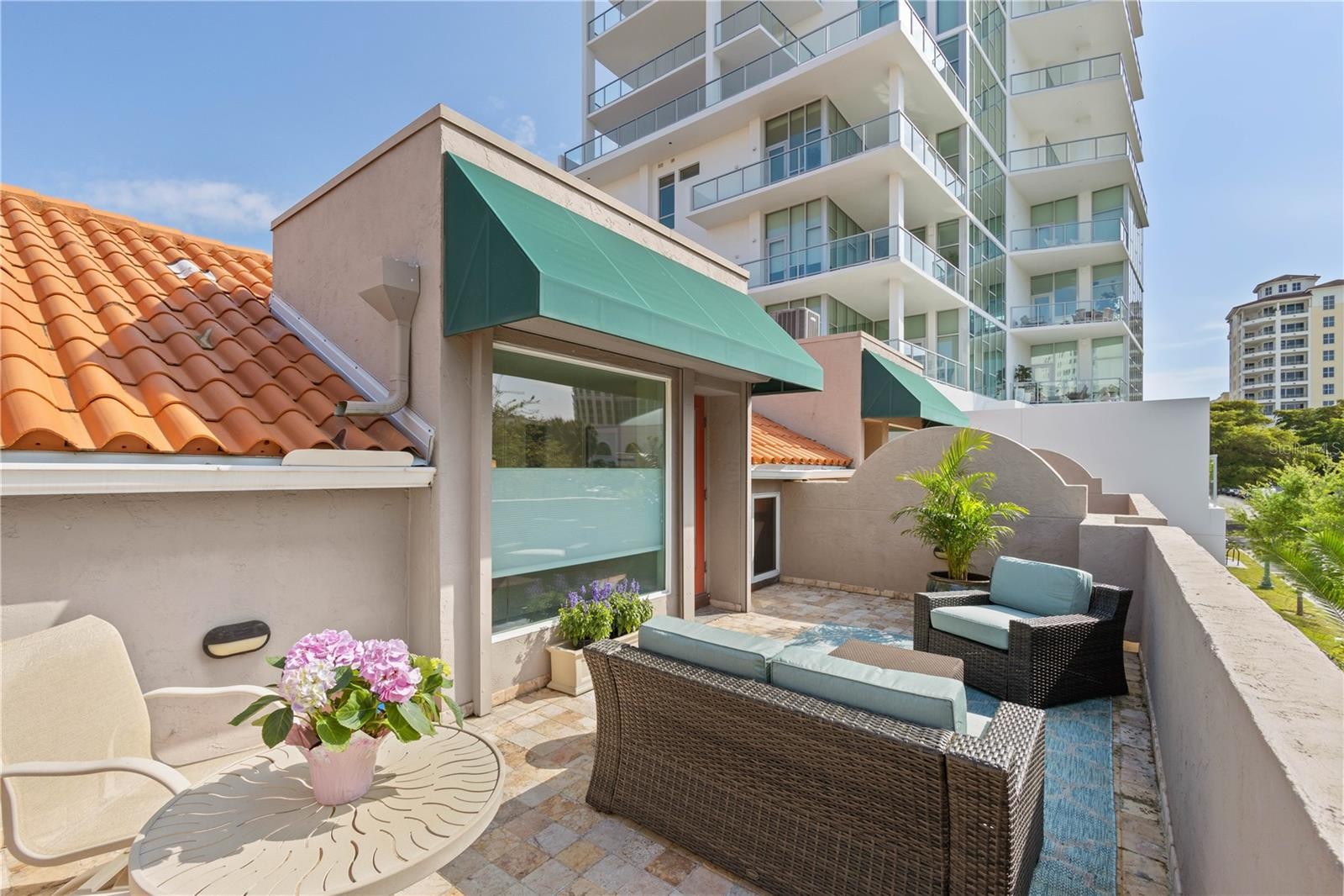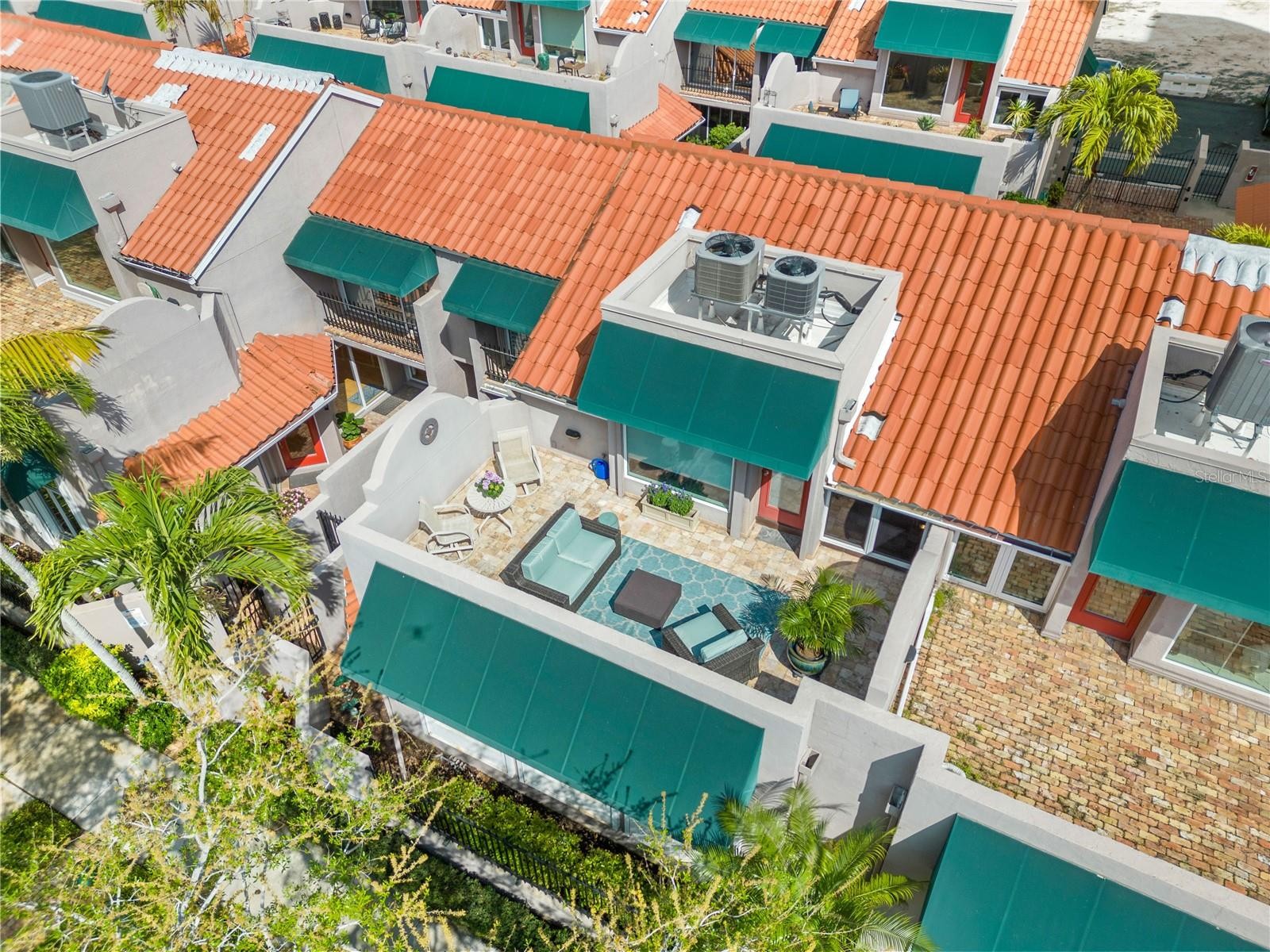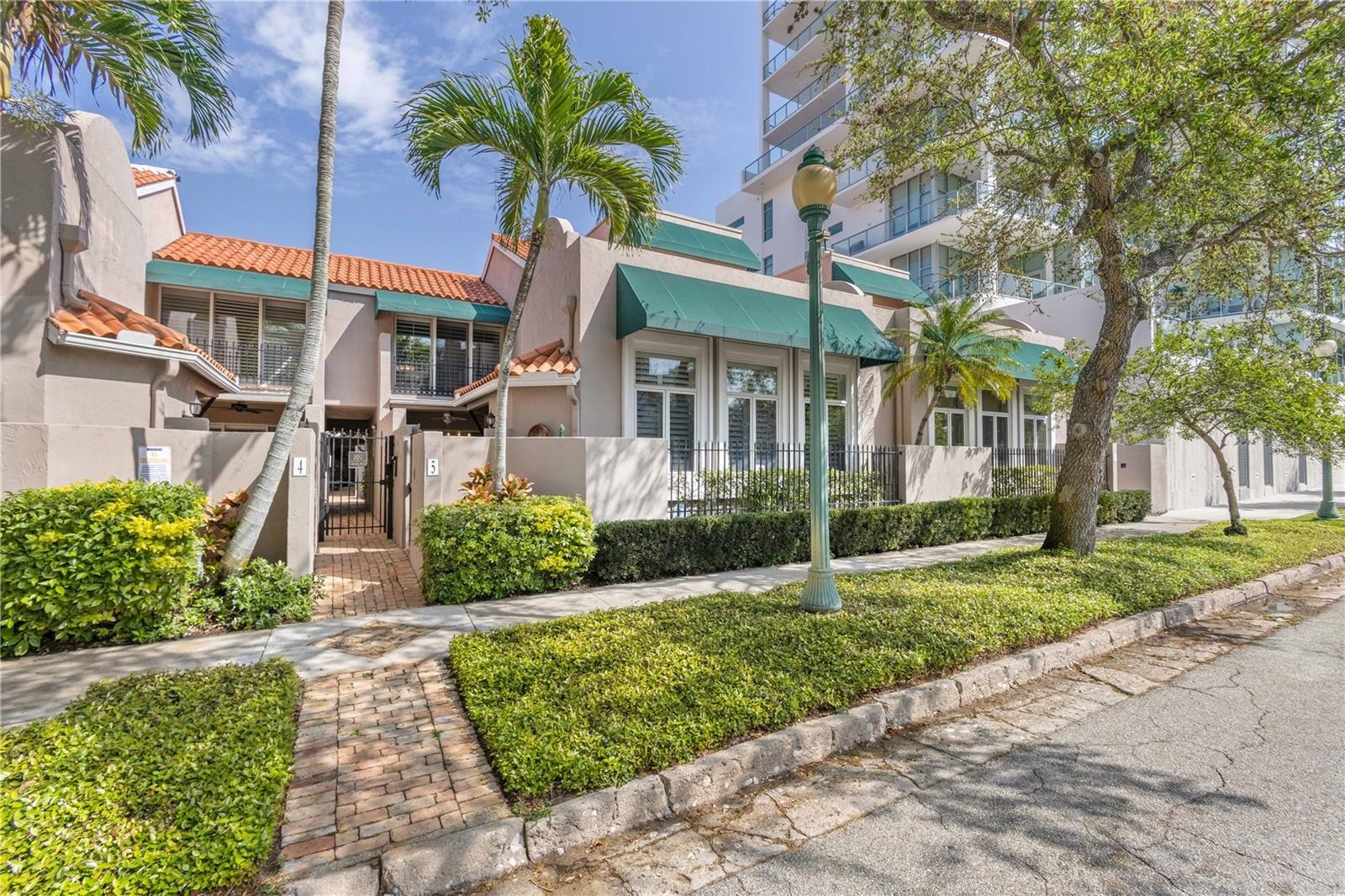 Enjoy the best of both worlds at Library Mews with both downtown convenience and walkability as well as lush expansive private outdoor areas. Library Mews is an intimate community with only 11 residences featuring 2-story villas with masonry construction and private garages. The exterior of the entire community was updated in 2025, with new roofs, awnings, exterior paint, gutters, exterior lighting, and hurricane impact skylights. The interior of this residence has been extensively remodeled, increasing ceiling heights, improving the kitchen and bathrooms, and adding a second A/C system that facilitates two separate heating/cooling zones, one for each level. The island kitchen boasts a sub-zero refrigerator, Cambria quartz countertops, mother-of-pearl backsplash, and wood, dovetailed all-drawer cabinetry that includes a pull our spice rack and built-in trash receptacle. The range is a Bosch electric smooth top, however, it can easily be swapped out for a gas range using the existing gas bib. And the adjacent butler’s pantry/laundry room has loads of extra storage. The living room, dining room, and kitchen all have glass sliders that bring the outside in and provide easy access to the private courtyard area. The courtyard has gas service, facilitating a direct connect BBQ grill thereby avoiding having to lug propane tanks. The first floor includes a convenient den with custom built-in mahogany shelving and desk and loads of storage space. A powder room completes the first floor. The owners' suite is light and bright with triple sliders and brazilian cherry hardwood flooring. The walk-in closet has been custom fitted and is easily reconfigurable to your needs. The ensuite bathroom includes a dual quartz vanity, under mount sinks, Toto commode with electric outlet access, a skylight, a deep soaking bathtub, and spacious walk-in frameless shower with seat. The fixtures are Hans-Grohe and include swivel vanity taps and a handheld shower head that can operate together with the main shower head or separately. The guest suite is split from the owners' suite and includes an ensuite bathroom with skylight and a spacious closet, making hosting guests a pleasure. In addition to the attached one-car garage, this residence also includes a deeded carport providing total space for two vehicles within the gated area. The garage has a separate air-conditioned storage closet. And electric hurricane shutters make storm preparation a breeze. Top it all off with an expansive rooftop private terrace with new 24” porcelain pavers that is perfect for enjoying your morning coffee or a glass of wine in the evening. You'll not only be able to catch some rays, but also indulge your green thumb, and watch the fireworks over the bay. In a city that's largely dominated by high-rise condominiums, Library Mews is a world apart. Blending into the surrounding landscape, it truly is an oasis hidden in plain sight. Tucked into a quiet corner of the city away from the fray, Library Mews is convenient to all of the downtown amenities. Just two blocks to Whole Foods and Starbucks, across the street from Selby Library, the Opera House, and Florida Studio Theater, Library Mews is only a few minutes walk to Main Street restaurants and shops, the Saturday morning Farmers Market, as well as the Bayfront.