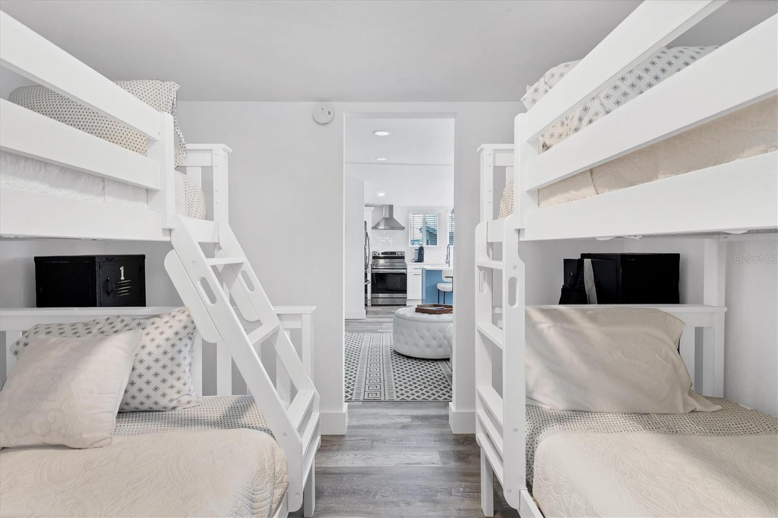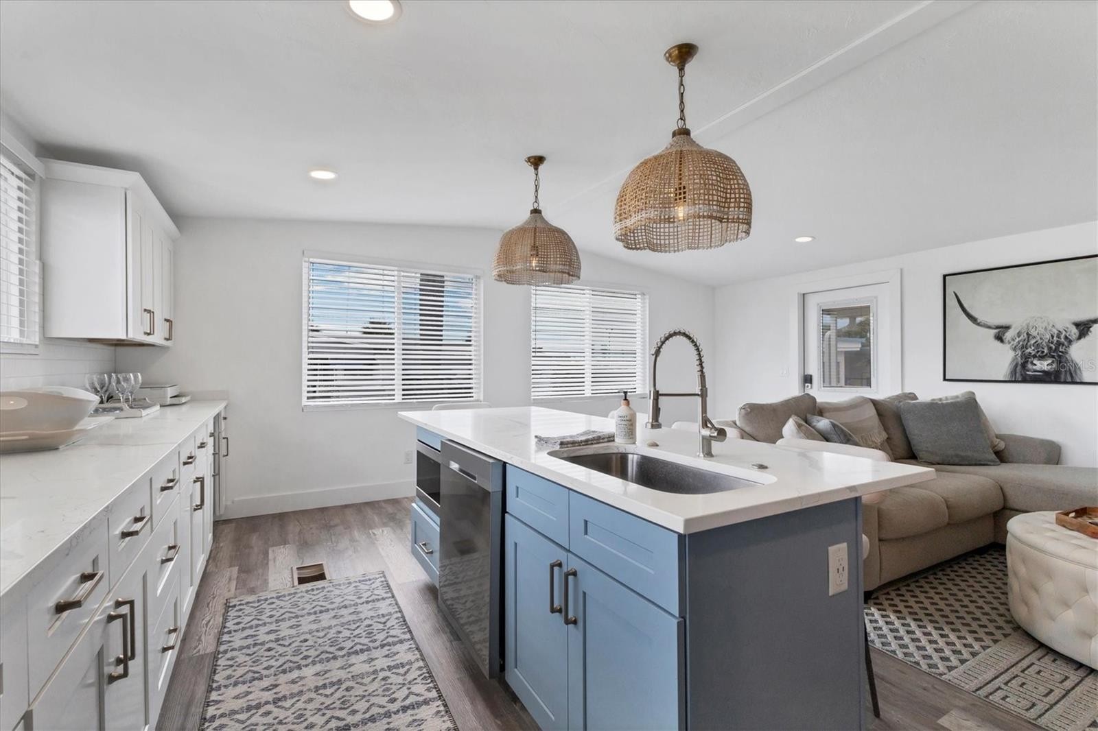 STUNNING COASTAL RENOVATION! This 3 Bedroom, 2 Bath Cottage-core Mobile Home is situated on an oversized Lot and a Half in the top-tier, active 55+ Trailer Estates community. The Open Concept and expansive living spaces are wonderful for entertaining, with vaulted ceilings and tons of natural light! 3rd Bedroom is currently set up as a bunk room, but could be great office space or den. Luxury vinyl plank floors throughout. Kitchen boasts a long center island for gathering with plenty of Shaker style cabinets, modern stainless steel appliances and a ton of quartz countertop space. Generous Primary Bedroom with wall to wall built-in closet. Roomy ensuite Primary Bath has walk-in shower and convenient Laundry space. Impact windows / doors. Huge backyard! Every square inch of the home has been thoughtfully designed to maximize a relaxed, laid back lifestyle. Highly effective, energy efficient spray foam insulation throughout the home. This home is low maintenance. A 7x7 shed for workshop or storage. You own the land. Boaters have direct access to Sarasota Bay from the Marina. Enjoy the large, heated community pool, hot tub, gym and wood shop. The community buzzes with pickleball, shuffleboard, kayaking, horseshoes, bocce, dancing and more. A US Post Office on site. 10 minutes to Sarasota-Bradenton Int'l Airport. Convenient to shopping, restaurants, the Arts and everything in Bradenton/Sarasota. Sold furnished.