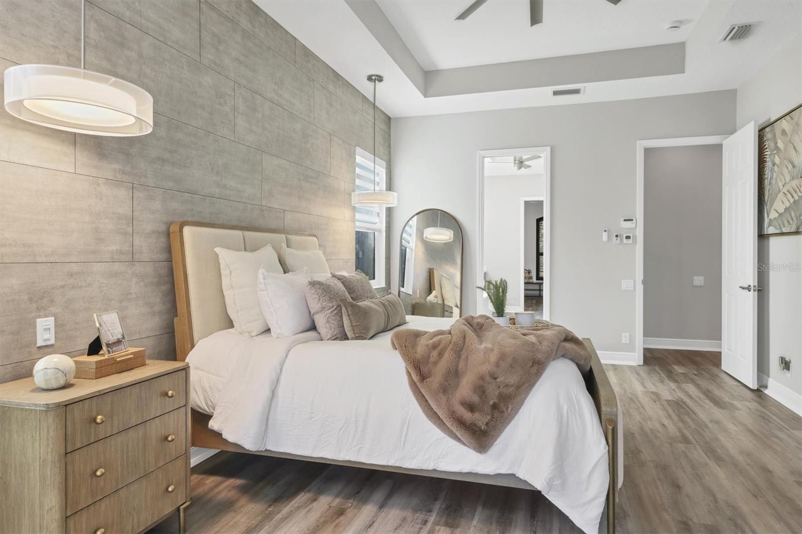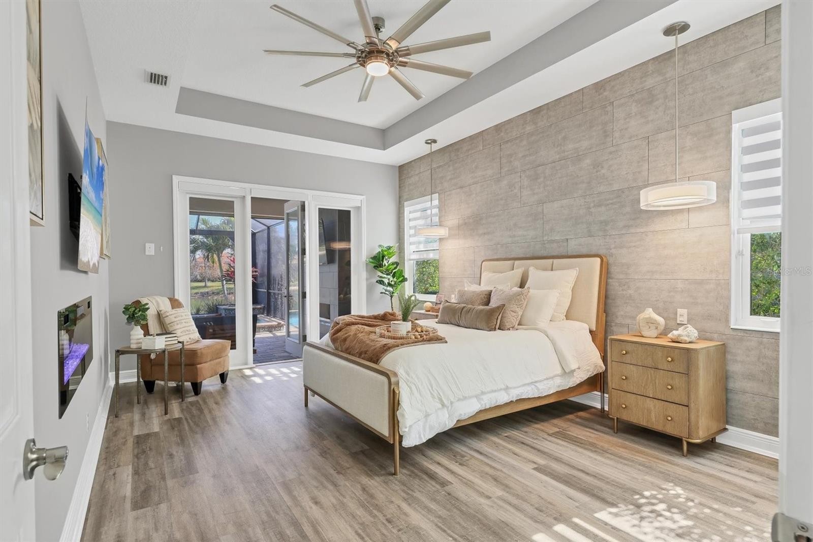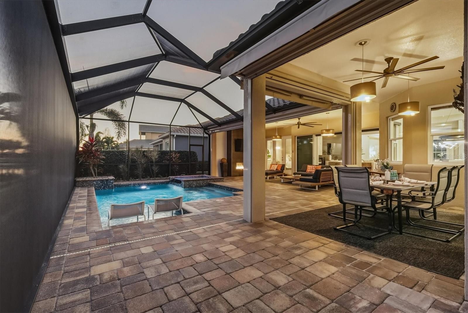 One of the few impeccably enhanced with thoughtful upgrades homes in Gran Paradiso built by Sam Rodgers Homes. The Napoli floorplan offers three bedrooms, three full baths, a flexible den or office with open concept living with a large lanai showcasing the essence of elevated Florida living with serene lake views. Since 2022, the current owner has invested extensively in elevating the sophisticated design and function of the home. The kitchen has been beautifully upgraded with custom cabinetry featuring under-cabinet lighting, a GE Profile induction cooktop with designer hood, built-in ovens, and a reverse osmosis (R/O) water system. Refined finishes flow seamlessly into the main living areas, complemented by new flooring throughout, updated lighting fixtures, remote-controlled window treatments, and custom tray ceilings. The living room is highlighted by triple pocket sliding glass doors, creating a seamless indoor-outdoor connection while framing peaceful lake views. The expansive screened lanai is designed for year-round enjoyment, featuring a panoramic screen enclosure, awnings, and wireless roll-down hurricane shades. The heated pool and spa are powered by propane gas and are conveniently controlled via a Pentair wireless app installed in 2022, offering effortless management at your fingertips. A new (2022) gas pool heater and filter enhance efficiency and performance. New Salt Chlorinator in November 2025. The updated outdoor fireplace serves as a focal point for outdoor entertaining, while the 250-gallon propane tank also supports the Generac full-house generator, providing comfort and peace of mind. The primary suite is a serene retreat, enhanced by an electric fireplace and a spa-like bathroom with a luxurious soaking tub, updated glass-enclosed shower, and an exceptionally large walk-in closet ideal for showcasing an extensive wardrobe. All bathrooms throughout the home have been upgraded with glass shower doors and updated cabinetry. Additional improvements include new ductwork, dampers, insulation, a whole-house water softener system, and modernized remote-controlled window treatments throughout. The garage is equally impressive, offering impact resistant doors, extensive wall-mounted storage cabinetry, shiplap walls for organized tool storage, overhead Hyloft storage, epoxy flooring and attic access with paneled flooring for additional storage. Ask for a complete list of features and upgrades. Residents of Gran Paradiso enjoy an amenity-rich lifestyle with access to a resort-style pool, elegant clubhouse, fitness center, tennis courts, pickleball courts, sauna, and more. Ideally located just minutes from Downtown Wellen Park and its vibrant dining and shopping destinations, with easy access to Venice Beach, Manasota Beach, and Downtown Venice, this exceptional home offers a refined Florida lifestyle defined by luxury, comfort, and location.