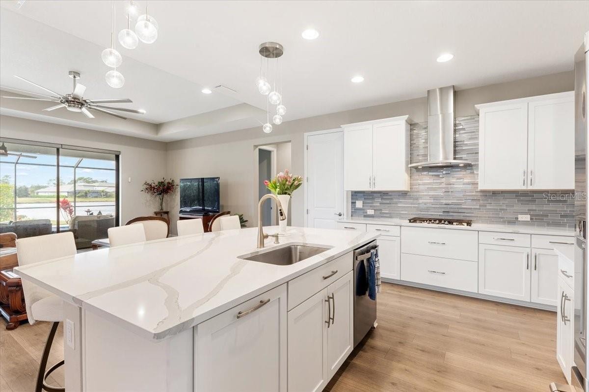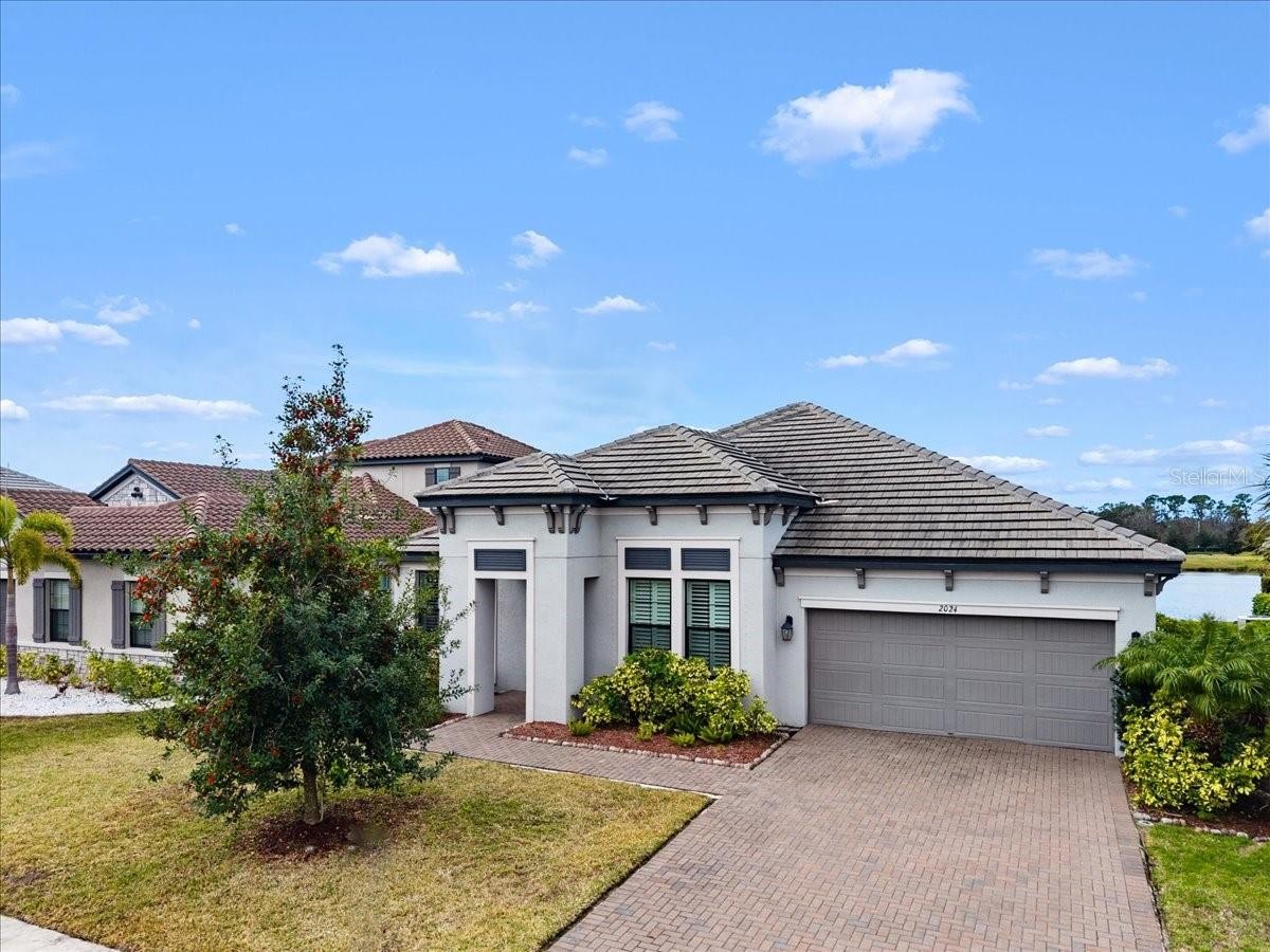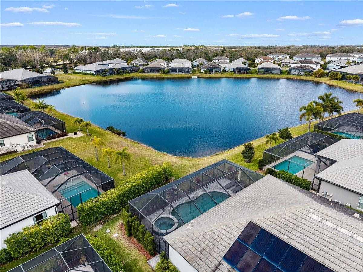 Modern & Pristine, this exceptional 4-bedroom, 3-bath residence with a sparkling pool and spa captures serene water views and effortless style. Thoughtfully upgraded throughout, the home showcases wood-look plank flooring, tray ceilings, designer lighting and fans, pendant accents, and added recessed illumination for a warm, modern glow. Expansive sliding glass doors open wide to the lanai for seamless indoor-outdoor living. Each bath is finished with solid wood cabinetry, Cambria quartz countertops, and sleek frameless glass enclosures. A generously sized laundry and utility room, dedicated pool bath, mudroom/drop zone, and rain-glass front entry add both function and flair. The kitchen is a true centerpiece—featuring Cambria quartz surfaces, a stylish tile backsplash, shaker cabinetry, and GE Profile stainless steel appliances, including a gas cooktop with range hood and a wall-mounted double oven topped with convection microwave. A farmhouse sink, under-cabinet lighting, and an oversized walk-in pantry complete the space with both beauty and practicality. Step outside to a screened, paver lanai where a gas-heated pool and spa shimmer overlooking tranquil water views. The tandem three-car garage offers epoxy flooring, and the paver driveway enhances the home’s crisp curb appeal. ***BONUS: A leased solar panel system helps keep electric costs in check.***HOA AMENITIES Include: Community pool, outdoor kitchen, playground, dog park, and pickleball courts.***LOCATION HIGHLIGHTS: Convenient access to SR-64 and just moments from top-rated Lakewood Ranch schools—Gullett Elementary, Lakewood Ranch High, Mona Jain Middle, LECOM, and Manatee Tech East Campus. You’re minutes from shopping, dining, fitness studios, salons, vibrant nightlife, downtown Sarasota, Sarasota International Airport, award-winning Gulf beaches, Ellenton Outlets, and UTC’s premier shopping and dining scene.