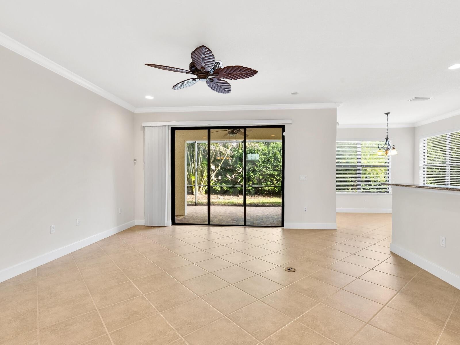 This beautifully maintained two-bedroom-plus-den Florence home is nestled within the popular, gated, resort-style community of Venetian Falls. Thoughtful design details abound, including large diagonal tile flooring, crown molding, and upgraded baseboards throughout. Move-in ready, the home offers a freshly painted interior, new carpeting, refreshed ceramic tile grout, window cleaning, replaced insulation, and professionally cleaned air ducts. The kitchen is well appointed with granite countertops, stainless steel appliances, a breakfast bar, and a bright dinette surrounded by windows. An open, split-bedroom floor plan ensures privacy for both homeowners and guests, while French doors lead to a versatile den or home office. Step outside to the extended paver lanai and enjoy tranquil views of the lush landscaping. A screened breezeway leads to a striking, hurricane-resistant glass front door. The widened paver driveway adds both curb appeal and functionality. Storm shutters are also included. The HOA fee covers maintenance-free lawn care, cable TV, and internet. Residents enjoy an exceptional array of amenities, including a heated lap pool, spa, resistance walking pool, state-of-the-art fitness center, billiards room, internet café, arts and crafts studio, bocce ball courts, putting green, and an elegant clubhouse offering a full calendar of activities with director. This community does not have a CDD fee. Ideally located near Gulf beaches, shopping, dining, and historic Main Street Venice, this home offers the perfect opportunity to enjoy the best of Florida living.