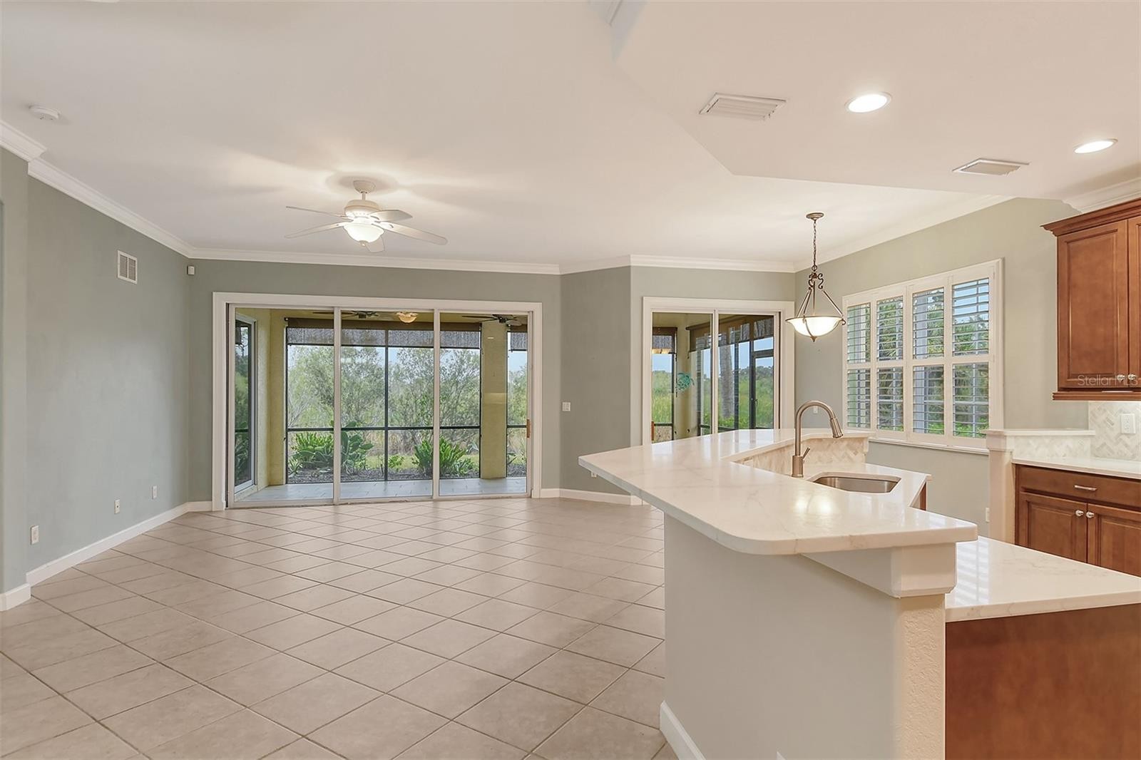 One or more photo(s) has been virtually staged. This gorgeous maintenance free condominium with high impact windows and completely upgraded, including NEW HVAC system, is a masterpiece of design and comfort. This Open Floor plan with spacious lanai was designed for those seeking an elevated lifestyle. Walking distance to the resort style pool, tennis, pickleball, gym, tike bar and clubhouse makes life easy, fun and enjoyable. Nestled in the heart of an award-winning golf community, this exquisite home combines modern luxury with serene natural beauty. Perfect for golf enthusiasts, pickle ball and tennis players, for socializing at the Tiki Bar at the resort-style pool, or for someone who just likes to walk along the trek outdoor walking trails along the Myakka River. This condominium offers a Grand Entryway, vaulted ceilings with crown molding elegantly lining tray ceilings and high impact windows in every room. The diagonally set floor tile, Plantation Shutters, Sunscreens with upscale window treatments, designer ceiling fans show off the functional Open Floor Plan and lanai. Three huge sliding glass doors bring in that Florida sunshine that we all crave. The Gourmet Kitchen boasts of custom cabinetry, Vintage-White Quartz countertops, pull-out drawers for pots and pans, stainless steel appliances, Angora Herringbone backsplash, huge, updated breakfast bar and farmer sink, garbage disposal, soft-close drawers, spice drawers and new Moen faucet. The luxury primary suite includes blonde oak rigid core vinyl plank flooring, Hunter Douglas blinds, a slider to the back lanai, a spa-like bathroom with soaking tub, walk-in shower with designer tiles and built-in sitting area, extra linen closet and expansive walk-in closet. The two other bedrooms have the same luxury cork-backed plank vinyl flooring. The laundry room includes extra cabinets, utility sink and bar for hanging clothes. The Outdoor lanai has a covered patio, outside pavers, and newly re-screened gnat-proof screens offering a gorgeous private view of water and a haven for many birds and wildlife. Get ready to grill in your own oasis of nature with a perfectly landscaped yard. The newly painted garage floor offers parking for two cars, or one car plus a golf cart. Venetian Golf and River Club offers a State-of-the-Art Clubhouse for fine dining, lounges, Tiki Bar, and event spaces. Enjoy the Wellness Center with fully equipped fitness center, yoga studio and tennis shop, a resort-style swimming pool, lap pool and Bocce ball area. Social Events include year-round activities, including tournaments, dances, fashion shows, a sports bar to watch your favorite teams, and many more community gatherings. This development provides 24/7 Security with gated entry and round-the-clock security drivers. The Championship Golf Course features pristine fairways and breathtaking views and is an optional separate membership. Conveniently located near I-75, beaches, top-rated schools, boutique shopping, museums, great restaurants, the thriving Venice Island with craft fairs, farmers markets and music, while still offering a peaceful retreat in nature. This condo has it all! Come see this upscale condo and begin living this wonderful lifestyle with friends and family in sunny Venice, Florida!