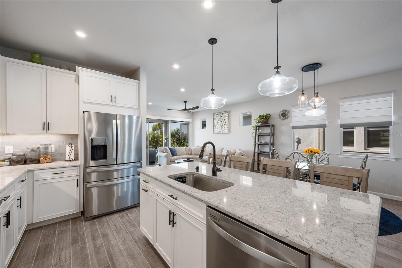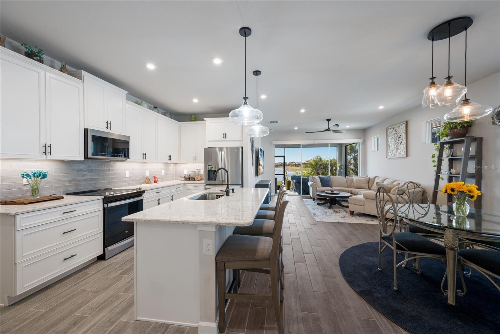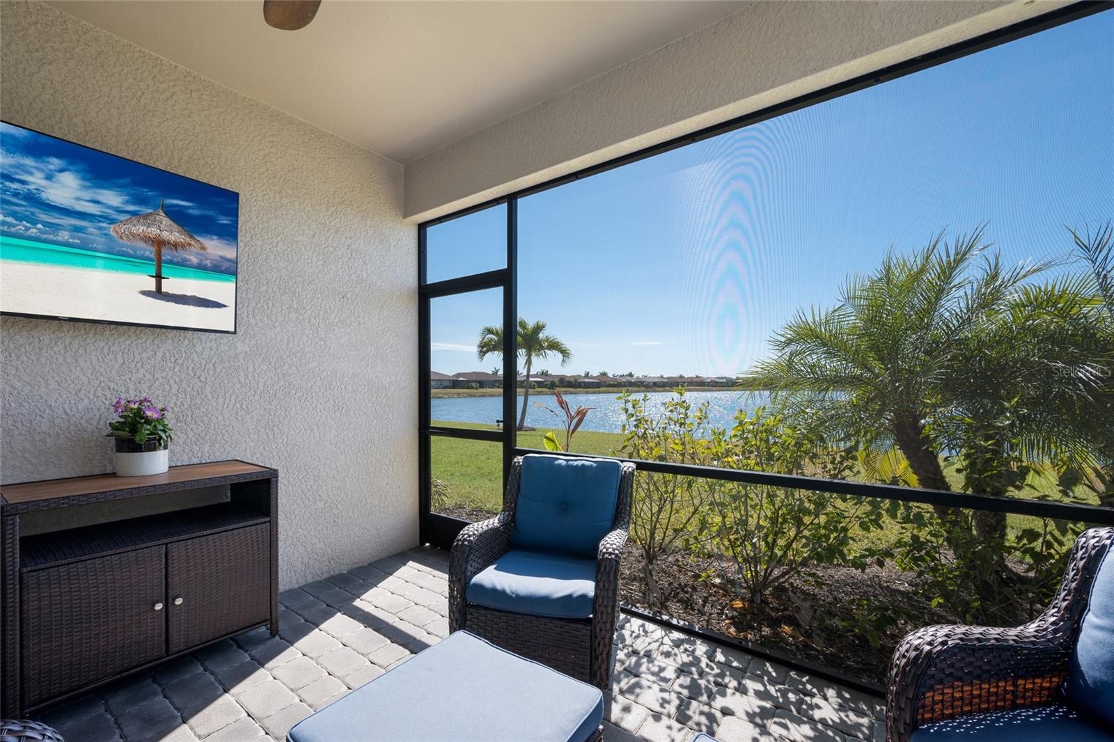 (Sunset Photos, 3D Tour Walkthrough and Video Coming Soon) Welcome to Renaissance at West Villages in beautiful Wellen Park, where this like-new 2022 villa delivers style, comfort, and a picturesque waterfront setting. Life here is active and welcoming, from meeting friends on the pickleball courts to joining the many community events that bring neighbors together. Situated on a premium lot with sparkling lakefront views, no rear neighbors, and more than $40,000 in builder upgrades, this home stands out from the moment you arrive. The newly sealed paver driveway and walkway guide you to a charming covered front porch framed by lush tropical landscaping, all maintained by the HOA, and topped with a timeless barrel-tile roof. Inside, the open concept floorplan showcases stunning 6x36 inch Level 4 wood look tile throughout, extensive LED recessed lighting, and elegant 8 foot interior doors. French doors lead to a versatile office or study, complete with plantation shutters. The spacious kitchen is designed for both everyday living and entertaining with quartz countertops, a large island, upgraded Kinsdale cabinetry with modern hardware, Whirlpool stainless steel appliances, upgraded ORB fixtures, and enhanced plumbing that includes a premium water filtration system by AXCIA Home Solutions. Wake up to peaceful water views from the owner’s suite, where cordless layered lift shades, a large walk in closet, and a beautifully finished ensuite create a serene retreat. The ensuite bathroom offers quartz topped dual vanities and a glass enclosed walk in shower with floor to ceiling tile. The second bedroom also features plantation shutters and has convenient access to the guest bath, which mirrors the same elevated finishes. Twelve foot sliding doors open to the screened lanai with remote controlled shades, newly sealed pavers, and a tranquil backdrop overlooking the water. The back patio and owner’s suite capture sweeping year round sunset views over the lake, giving you the perfect end to every day. Low maintenance living is truly effortless here. The HOA covers roof replacements, exterior maintenance, irrigation, full lawn care, and the added security of a gated community. Renaissance at Wellen Park offers resort style amenities and an active lifestyle including a community pool, clubhouse, fitness center, activities director, tennis, pickleball, and beautifully maintained grounds. Zoned for A rated schools and just minutes from Downtown Wellen Park, CoolToday Park, shopping, dining, and a short drive to the Gulf beaches, this location offers the best of Florida living. Schedule your showing today and experience the lifestyle that makes Wellen Park one of the most sought after communities in the area.