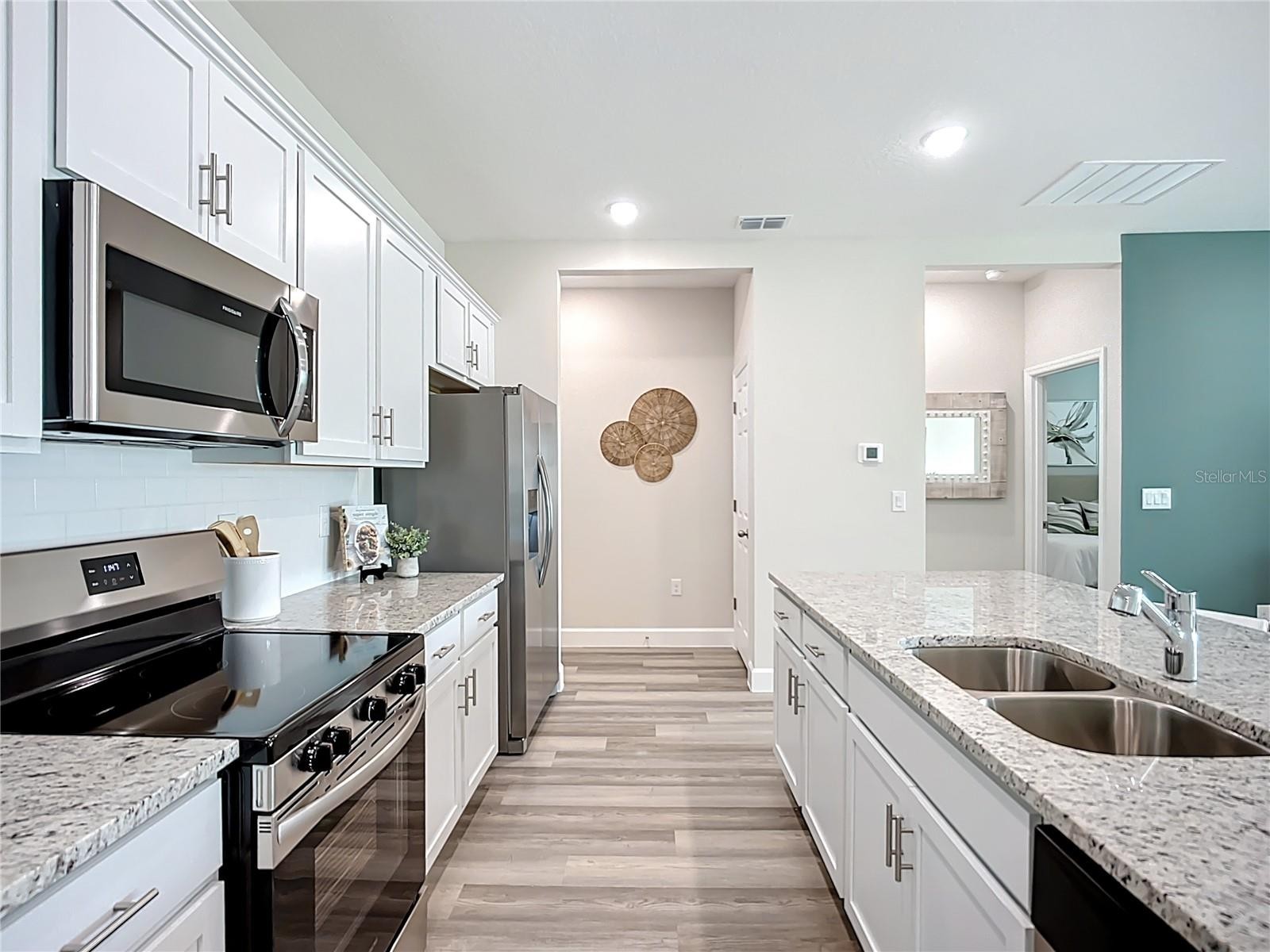 Great price with luxury features and ready now! A newly constructed home with city water and septic system in North Port, with no HOA fees! Great location for quick access to shopping, medical conveniences, parks and schools. This affordable new home is ready for you and is just what you've been looking for...No HOA and with city water! This home has 9'4" tall ceilings, a nice and open layout with a versatile floor plan. The house features 4 bedrooms, 2 full bathrooms, dining room, a living room, an open kitchen and a 2-car garage with 1810 square feet of living space. The living space is well-utilized with high ceilings and many windows providing natural light. The interior features will provide you with the quality and luxury you were looking for in your new home. This home has a split floor plan with the primary suite on one side of the home and the guest bedrooms on the other. The primary bedroom has a tray ceiling and large windows that let in natural light. You'll also enjoy a resort-style bathroom with a spacious walk-in shower with floor-to-ceiling tiled walls and a glass enclosure. It also features a linen closet, double vanity and a large walk-in closet. The living room features large windows and several LED fixtures providing plenty of light with access to the covered lanai. The living room is open to the kitchen, where you'll find a huge center island with extra seating for casual dining and plenty of cabinets. The kitchen features stainless steel appliances, Shaker-style cabinets with crown molding, decorative hardware, subway tile backsplash and granite countertops. The dining room is located at the front of the house, with large windows allowing for plenty of natural light. The home includes luxury vinyl plank flooring in the main living areas and bathrooms for durability and comfort. You'll love these floors! They are easy to maintain and offer a modern design, perfect for new homes. Other features include the same beautiful Shaker-style cabinets with hardware and granite countertops in the bathrooms, 5-inch baseboards, a garage door opener, gutters on the exterior, R38 insulation, a 16 SEER HVAC and much more. Visit our model center and compare the features and quality with other homes and you'll see the difference. We make buying easy for you! The photos are of the decorated model home of the same floor plan and not the home for sale.
