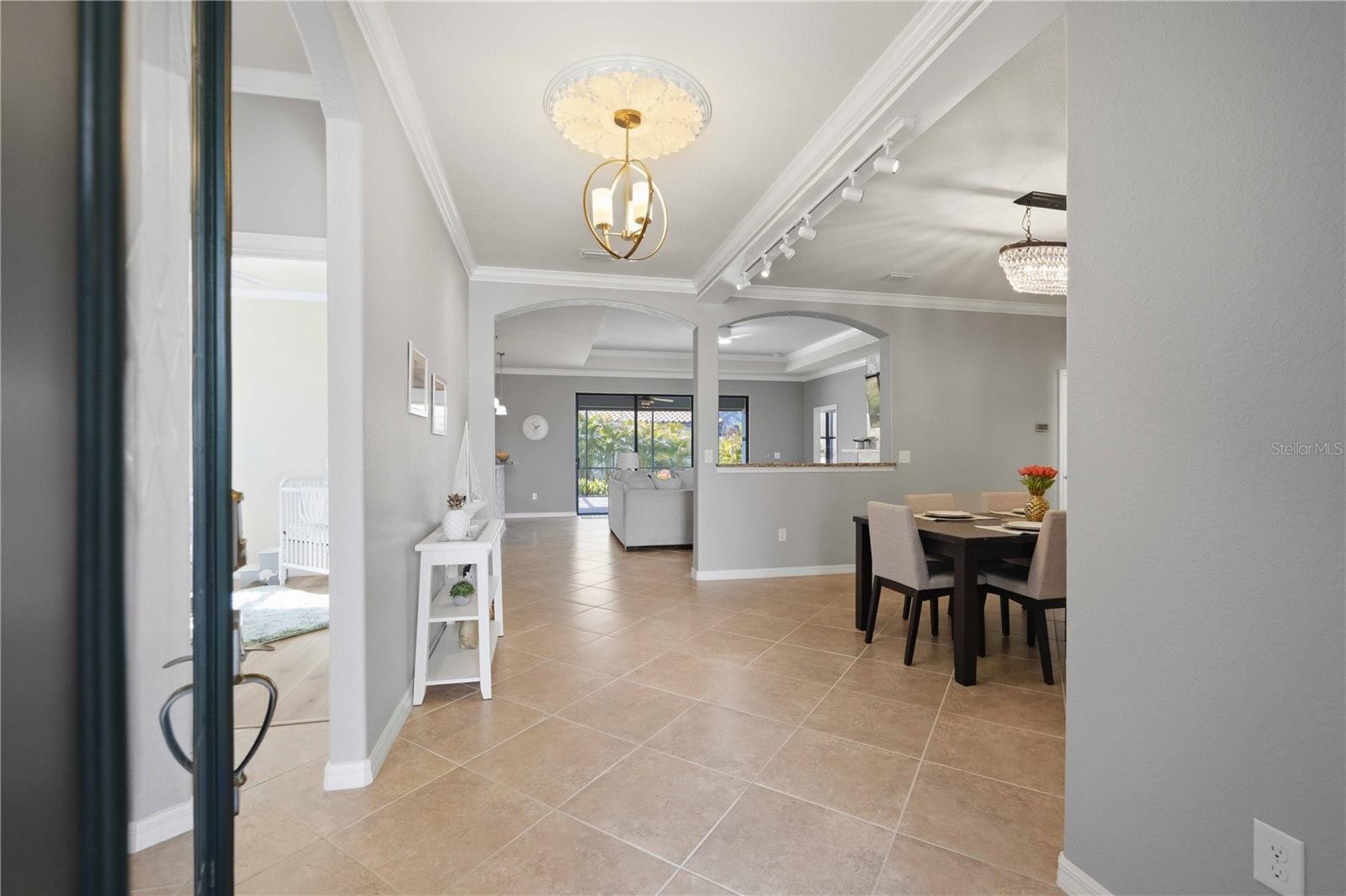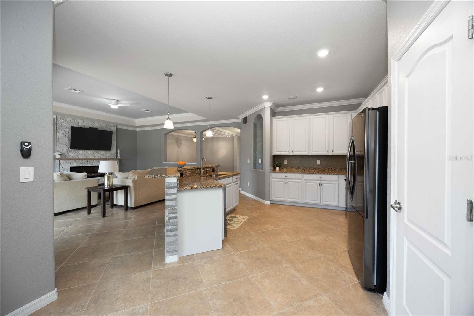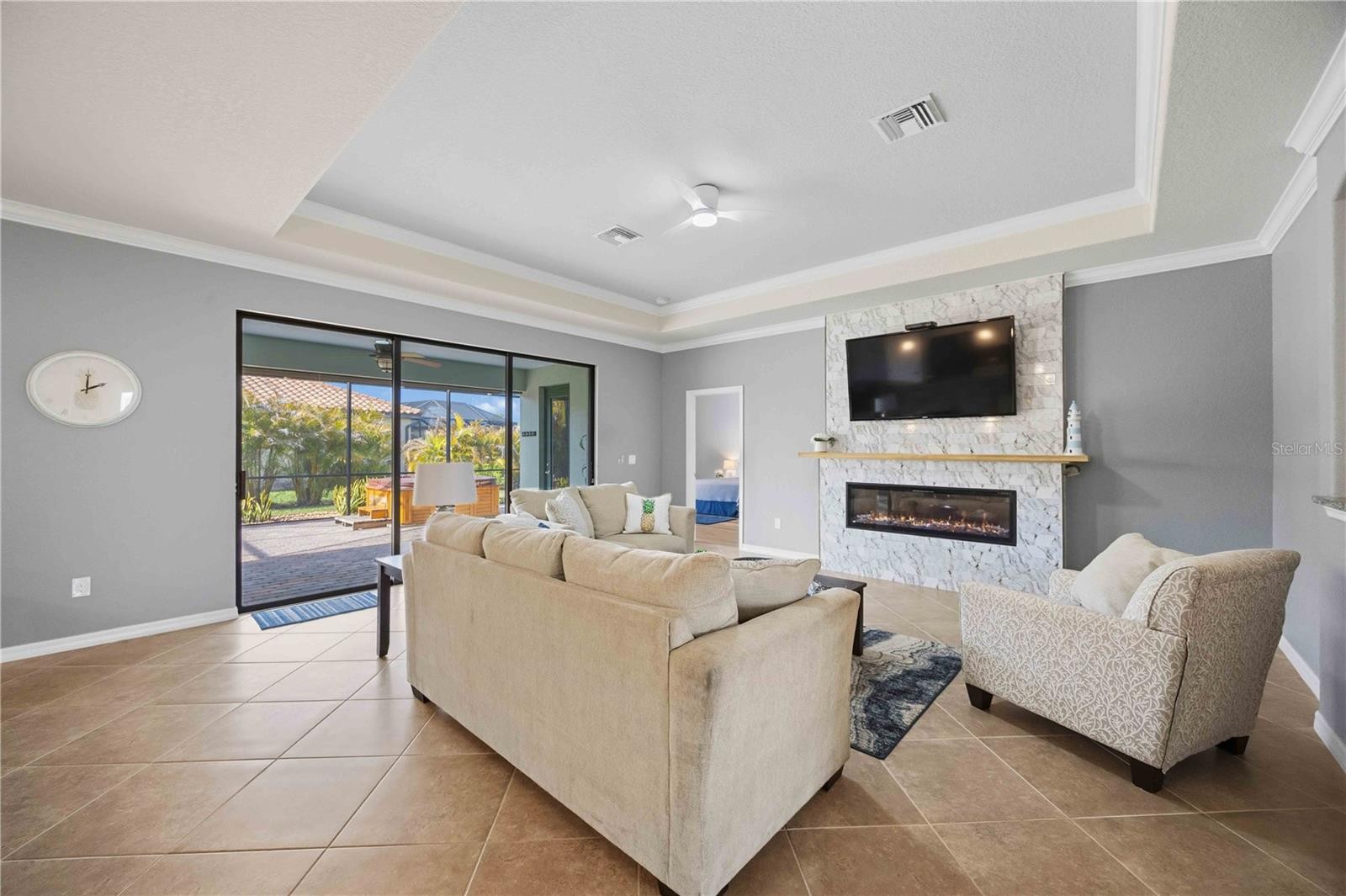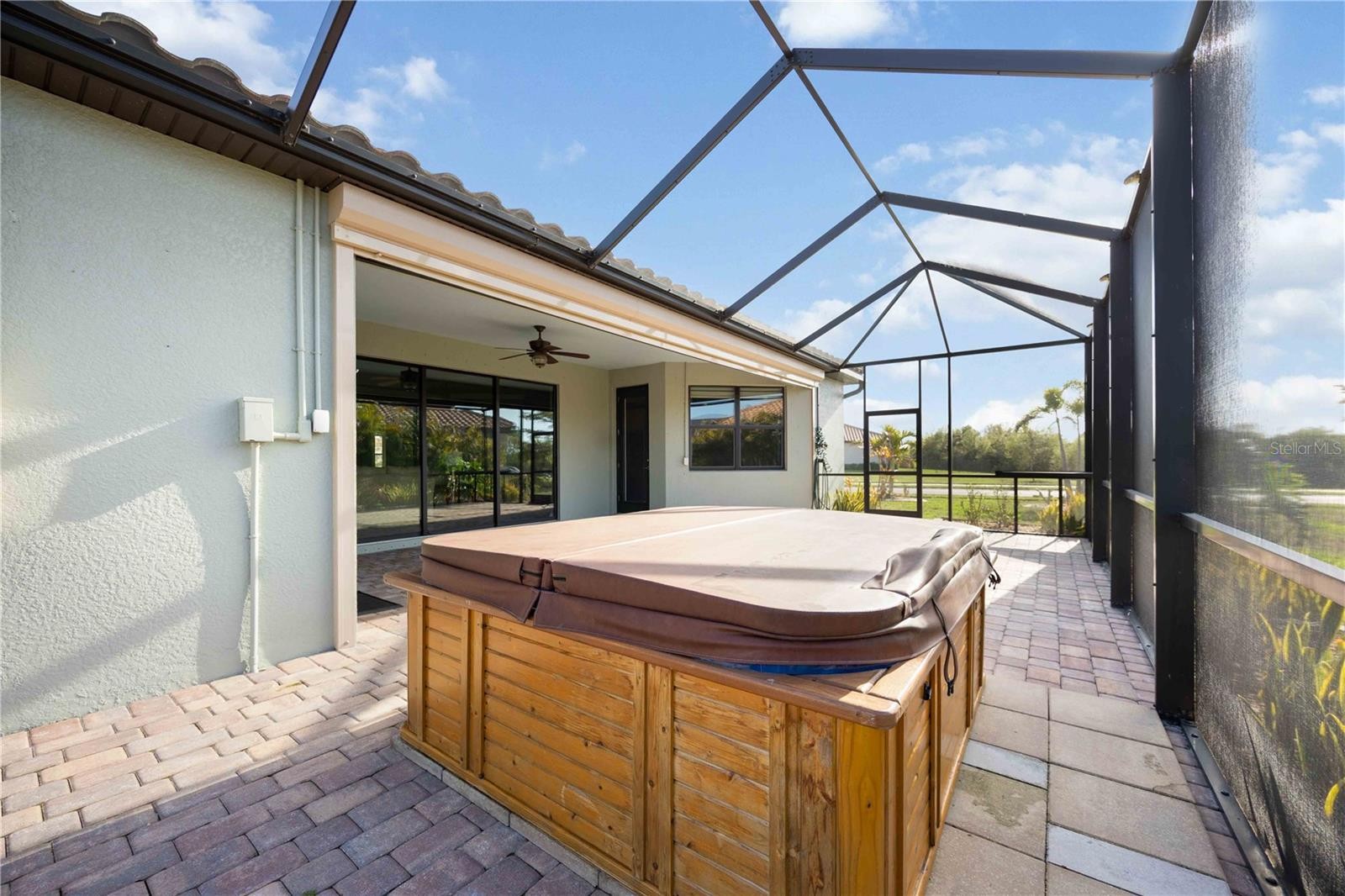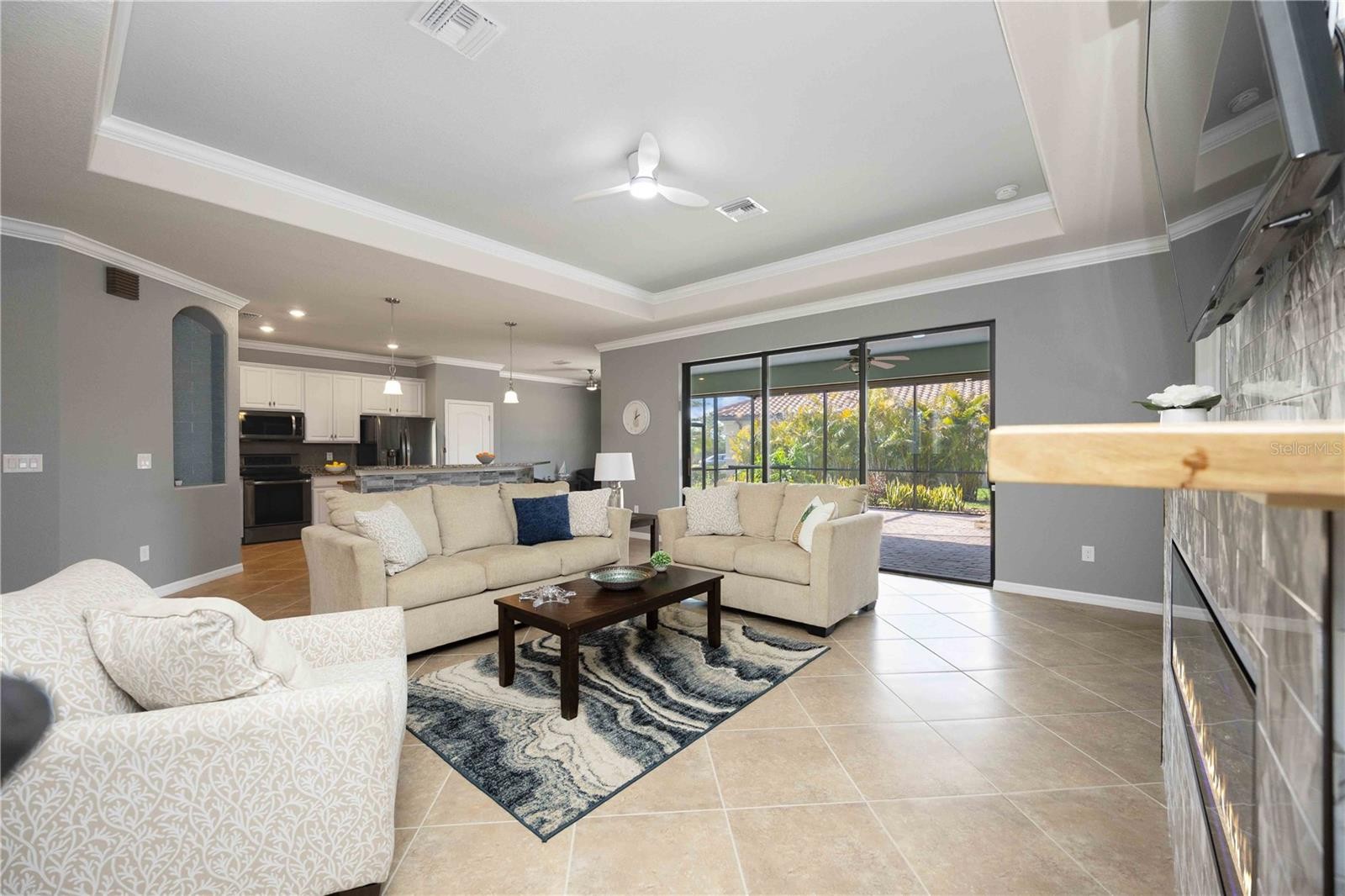 Welcome to this highly upgraded Lennar Princeton model in the sought-after Gran Paradiso community of Wellen Park. Built in 2018, this spacious 4-bedroom, 2-bath home offers 2,251 square feet under air, a 3-car garage, and a rare oversized ¼-acre lot — a feature rarely found in this neighborhood. The home stands out immediately with fresh 2024 interior and exterior paint, lush landscaping, and added privacy from newly planted palms. Inside, the open layout has been enhanced by removing archways and the dining room pillar to create a bright, modern living space ideal for entertaining. The upgraded kitchen features LG stainless appliances, glass backsplash, decorative island stonework, and a custom sliding-shelf pantry. The living room showcases a stunning floor-to-ceiling feature wall with a 60-inch electric fireplace finished in imported Spanish tile and an antique slab mantle. Energy efficiency is exceptional with 20 owned solar panels generating 8 kW of power, helping run the home and a Florida-made Swim Spa hot tub. Additional upgrades include whole-house surge protection, UV HVAC air purification, a premium water softening system, garage mini-split A/C, and insulated garage doors. Enjoy outdoor living on the expansive screened lanai, plus full hurricane protection with StormSafe shields, accordion shutters, and Kevlar screens. Gran Paradiso offers resort-style amenities including a clubhouse, fitness center, resort pool, tennis, and pickleball, all minutes from Wellen Park shopping, dining, and Braves spring training. Rare lot size, extensive upgrades, and owned solar make this home a standout — schedule your showing today.