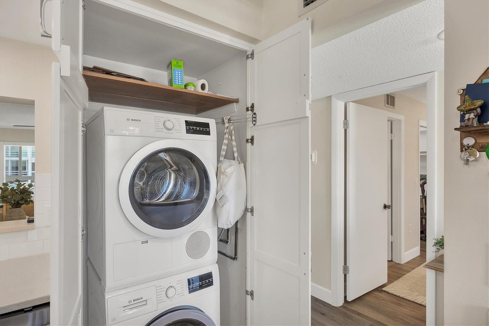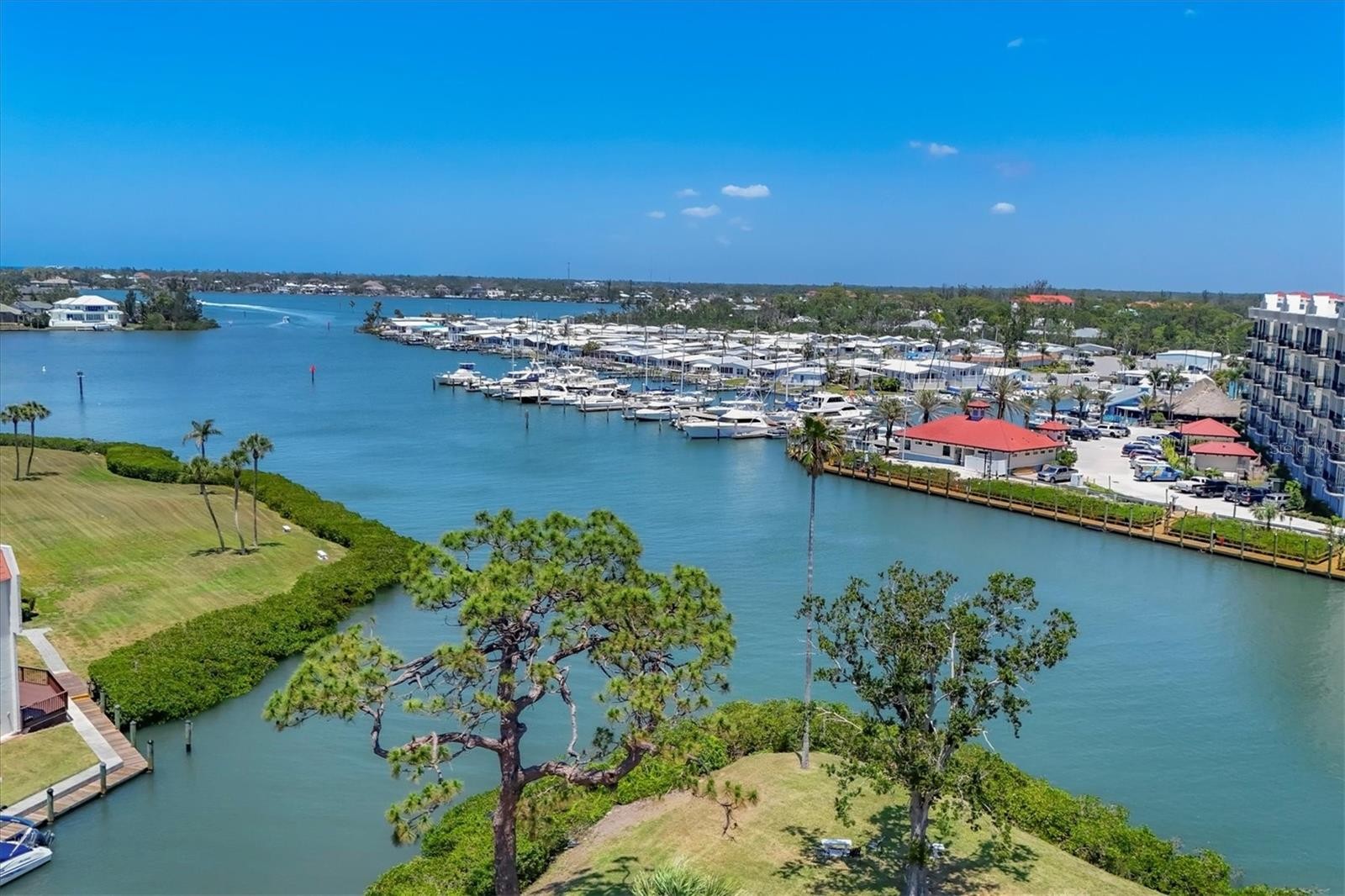 Enjoy waterfront living in one of the thoughtfully updated residences at Bella Costa. This second-floor unit offers two bedrooms, two baths and 1,013 square feet of thoughtfully updated living space. From the enclosed lanai, sweeping views stretch across Roberts Bay and the Intracoastal Waterway, creating a daily backdrop of boats, beautiful light and even the occasional manatee in the boat basin. Sit back in your chairs with morning coffee or unwind at sunset as waterfront life unfolds. Water and bridge views from the front of the unit extend the waterfront experience, offering an additional opportunity to watch boats pass by throughout the day. The home has been touched from top to bottom and is offered turnkey furnished with new high-end furnishings that reflect a refined coastal aesthetic while maintaining a comfortable, elevated feel throughout. The kitchen features wood cabinetry, elegant quartz countertops, breakfast bar seating and stainless steel appliances. A full-size Bosch stacked washer and dryer are seamlessly integrated into the kitchen and enclosed behind cabinetry for a clean, streamlined look. Two fully en-suite bedrooms, each with a walk-in closet, are thoughtfully designed to provide comfort, privacy and functional storage. The baths are fully renovated with step-in tiled showers, glass enclosures and custom vanities, offering a spa-like setting. Laminate flooring in a driftwood-inspired coastal finish runs throughout, complemented by plantation shutters and cohesive interior details. This unit also enjoys ample guest parking, a luxury not often found in Bella Costa, conveniently just outside the building near the assigned parking space. A seating area along the Intracoastal Waterway provides a front-row setting to watch boats pass and enjoy seasonal waterfront events. Bella Costa is a waterfront community offering picnic areas, barbecue grills, a heated pool, sauna, clubhouse with full kitchen, meeting and game room, fitness room and library with billiards. Boat docks may be available through arrangement with first-floor owners. Two blocks from historic downtown Venice, this location provides easy walkability to restaurants, boutique shopping, the weekly farmers market and year-round community events. Venice Beach is just one mile away, giving you a place in the Florida sun, with downtown just steps from your door. A home with this level of update, view and positioning within Bella Costa is rarely available. Schedule your private showing today!
