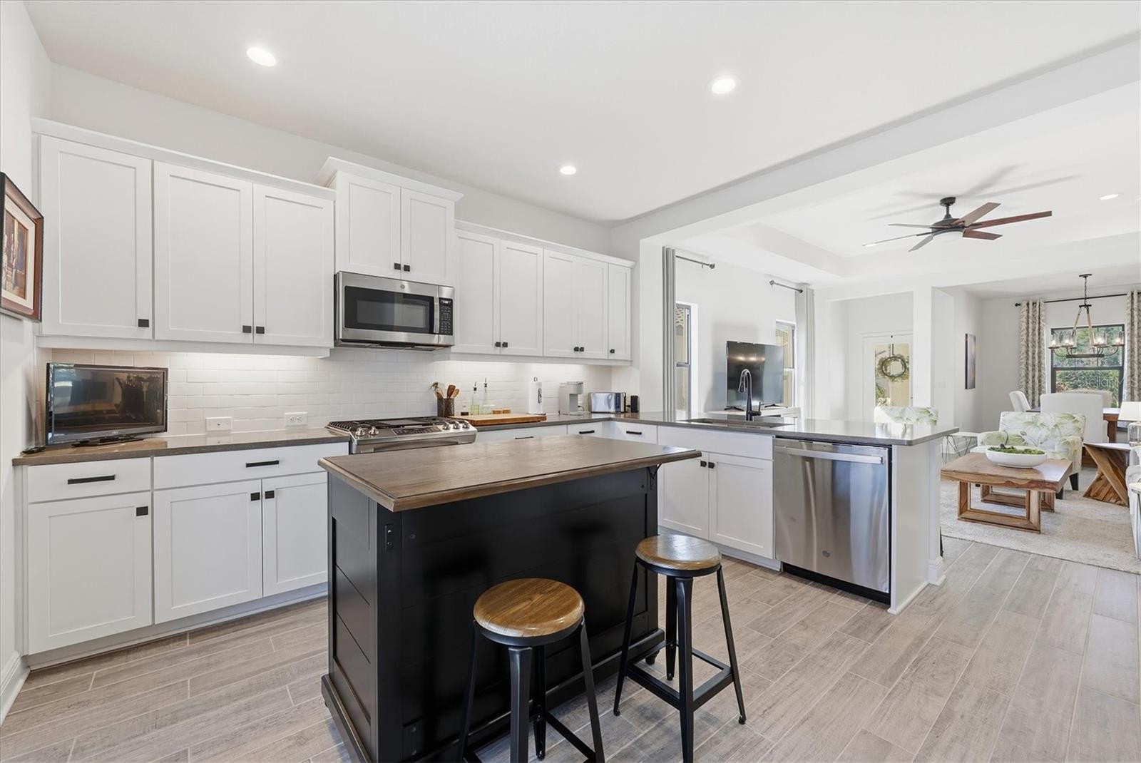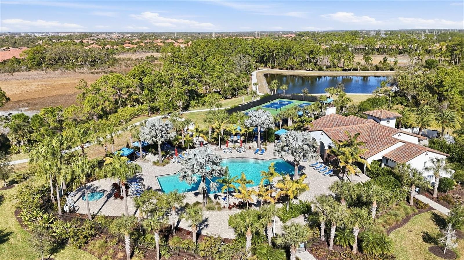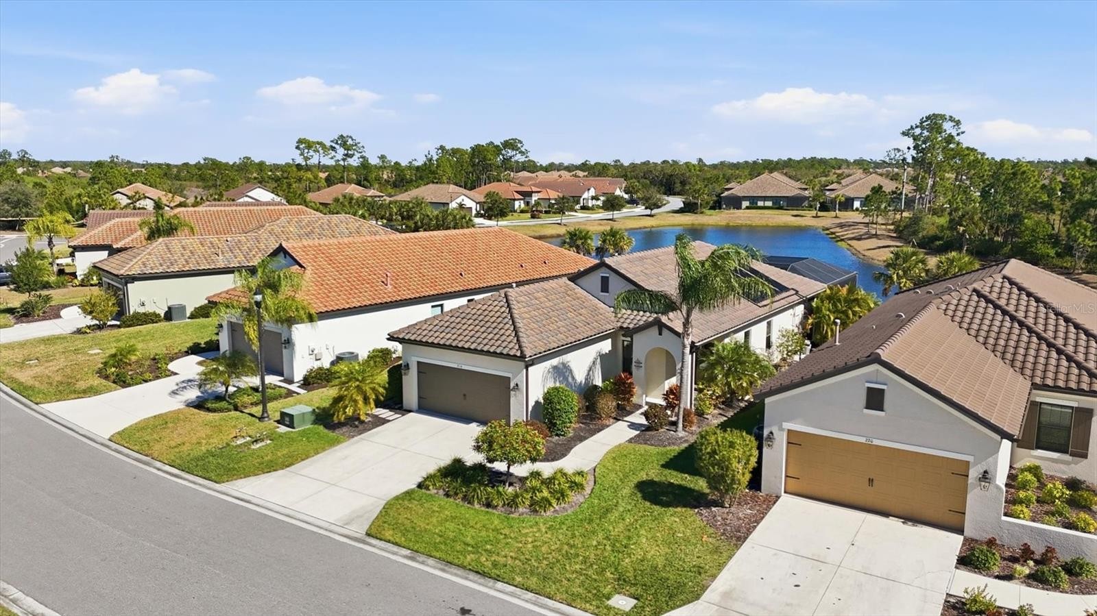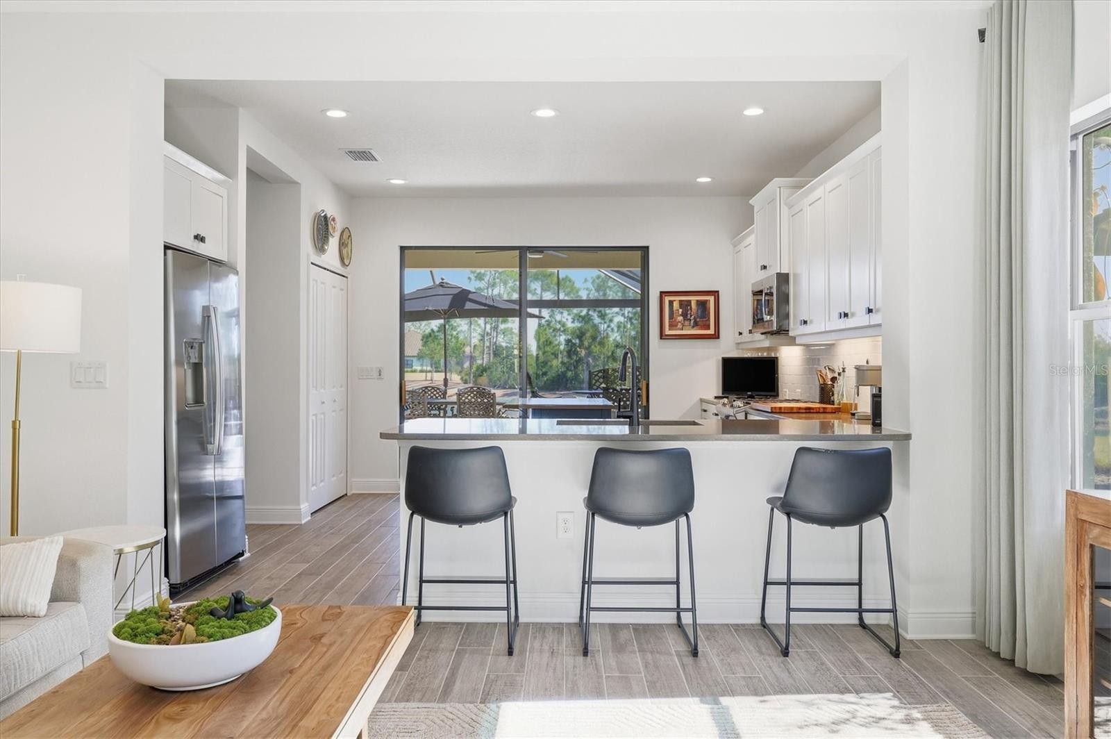 Welcome to this impeccably maintained and upgraded Northern Italian–style residence in the gated Vicenza community, where refined interiors meet resort-style outdoor living. This three-bedroom, two-bath Liberty model home offers 1,538 square feet of thoughtfully designed space on a premier lot, with serene views of dual water and preserve, creating a peaceful and private backdrop. The showpiece of the home is the extraordinary outdoor living area, designed for year-round enjoyment. The extended lanai spans approximately 1,100 square feet and features a 12-by-24-foot solar-heated pool with sun shelf, surrounded by 800 square feet of travertine decking. A 30-by-33-foot screened enclosure with dual clear-view panels offers unobstructed views of the water and surrounding natural setting. A gas stub is in place for effortless outdoor grilling, making this space ideal for relaxing or entertaining. Inside, the home is light, bright, and finished to a high standard throughout. Enhancements include a three-quarter lite impact-rated front door, a coffered ceiling in the great room, upgraded interior doors, and level 4 wood-look tile laid in an elegant offset pattern throughout the main living areas, adding continuity and warmth. The kitchen blends style and functionality with stainless steel appliances, a gas range, under-cabinet LED lighting, a classic subway tile backsplash, and cabinetry with natural maple interiors and roll-out shelving. Verona bronze hardware pairs seamlessly with bronze Moen fixtures, while the Sterling Ludington single-bowl undermount sink completes the space with both form and function. The generous primary suite offers a tranquil retreat, featuring two walk-in closets, dual vanities, a walk-in shower with extended-height tile and stone mosaic flooring, and private water closet. The guest bath continues the elevated finishes with a walk-in shower, semi-frameless bronze enclosure, and coordinating tile and mosaic details. Additional highlights include full-perimeter gutters with French drains, professionally designed landscaping, a two-foot extended garage with utility sink and quiet-close door, and decorative coach lighting. Residents of Vicenza enjoy resort-style amenities, including a clubhouse, heated pool with cabanas, pickleball and bocce ball courts, scenic walking trails, and dog parks, all maintained through the community association. Situated within the school assignment areas for Laurel-Nokomis schools and Venice High School, the home also offers proximity to Sarasota Memorial Hospital–Venice, shopping centers, downtown Venice, and nearby Gulf beaches, enhancing its overall residential appeal and coastal lifestyle access. Furniture is negotiable. Audio and video surveillance devices are active on the property.